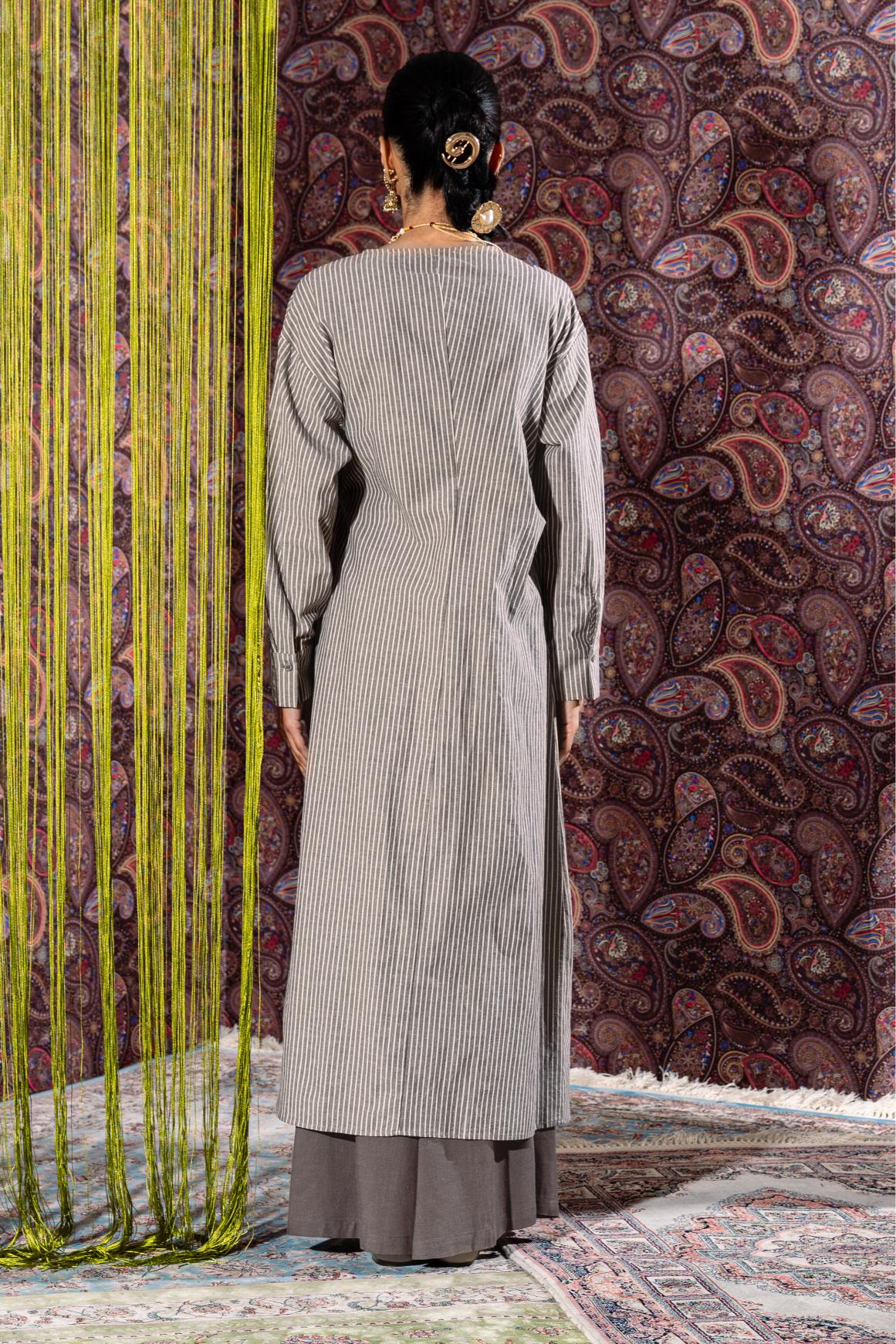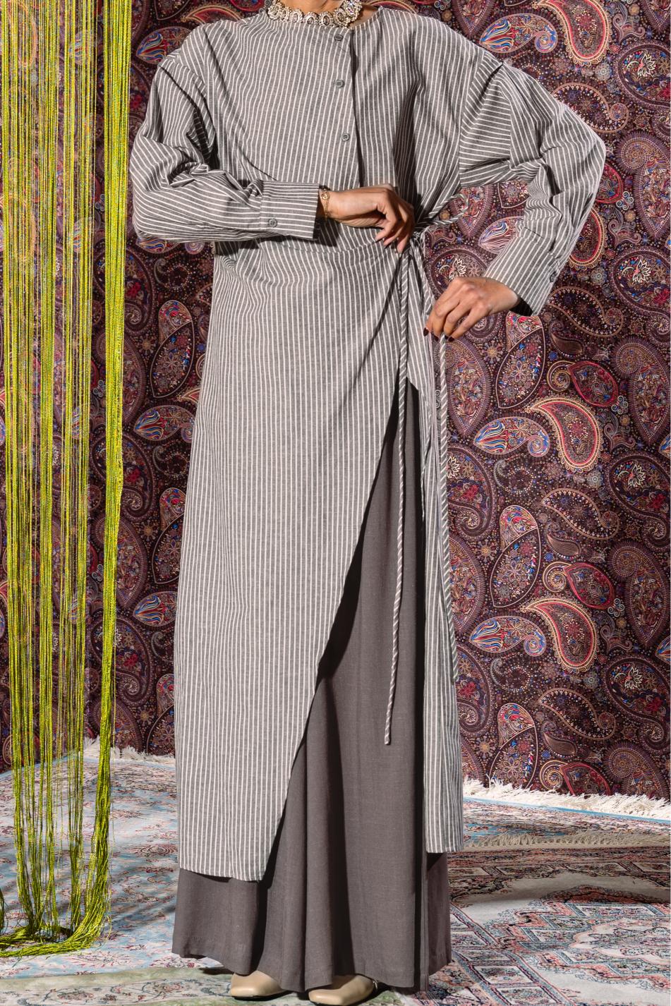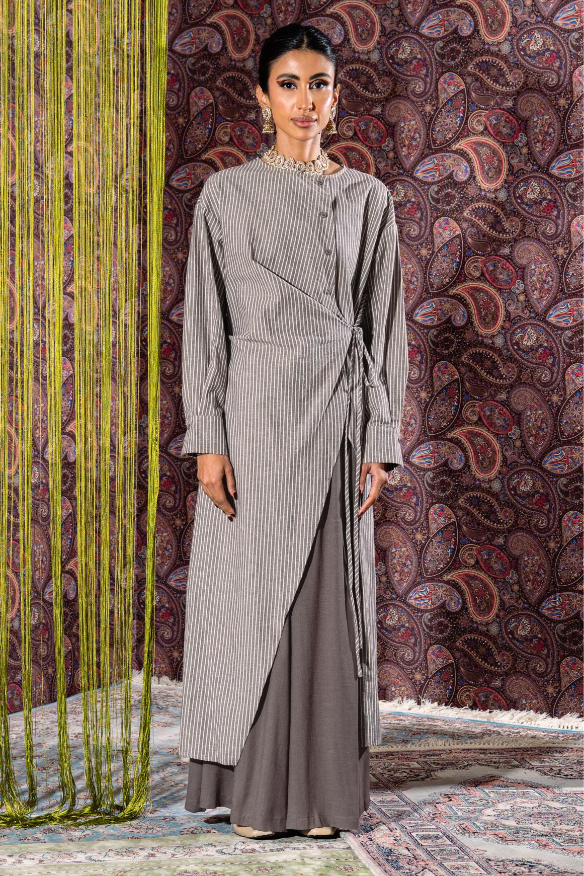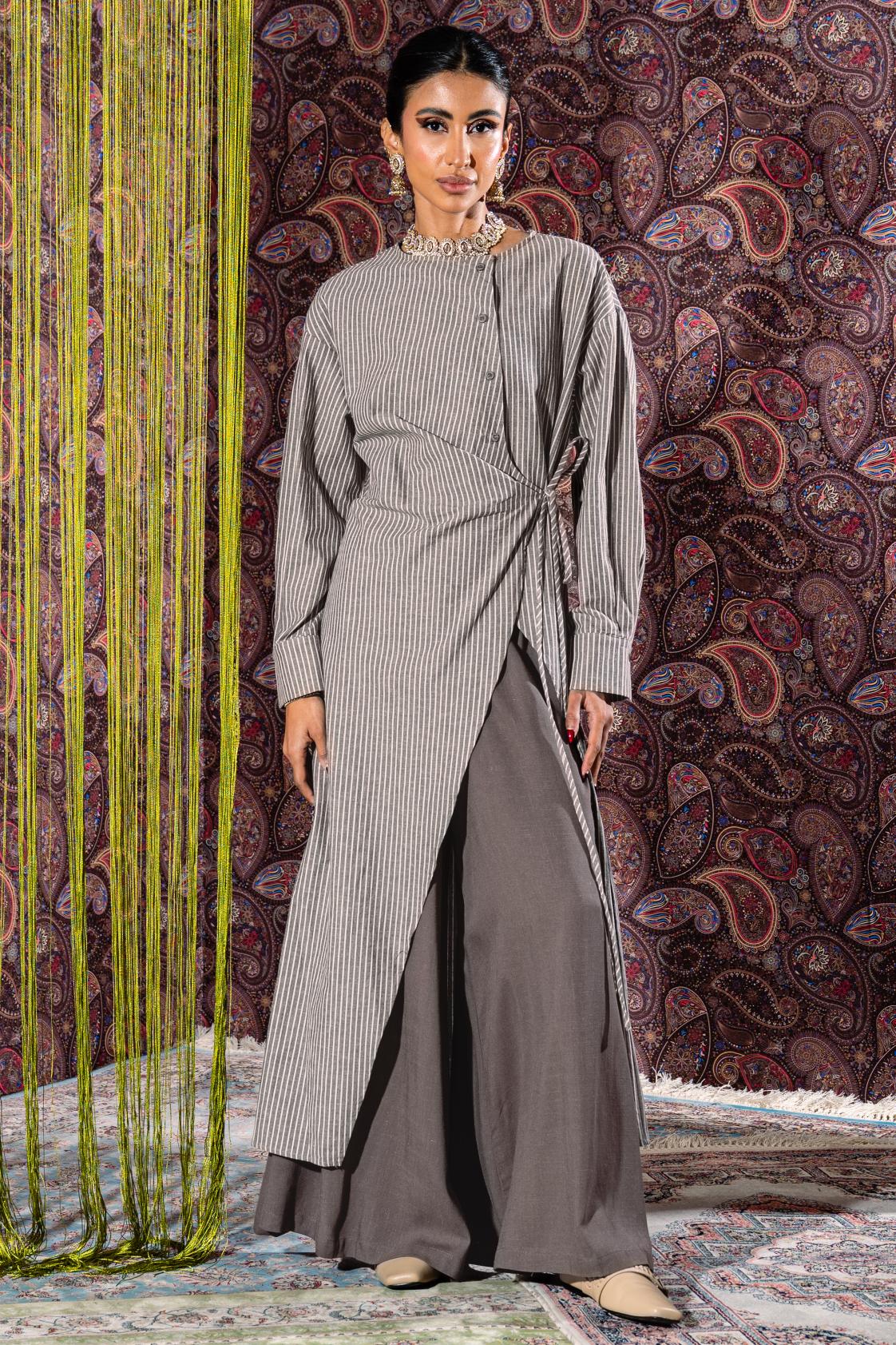 This elegant set includes a flowy matching pants and a beautifully designed top featuring a half button-front closure. The top has an open wrap style with a tie-bow detail, allowing the pant to show through for a layered, refined look.
