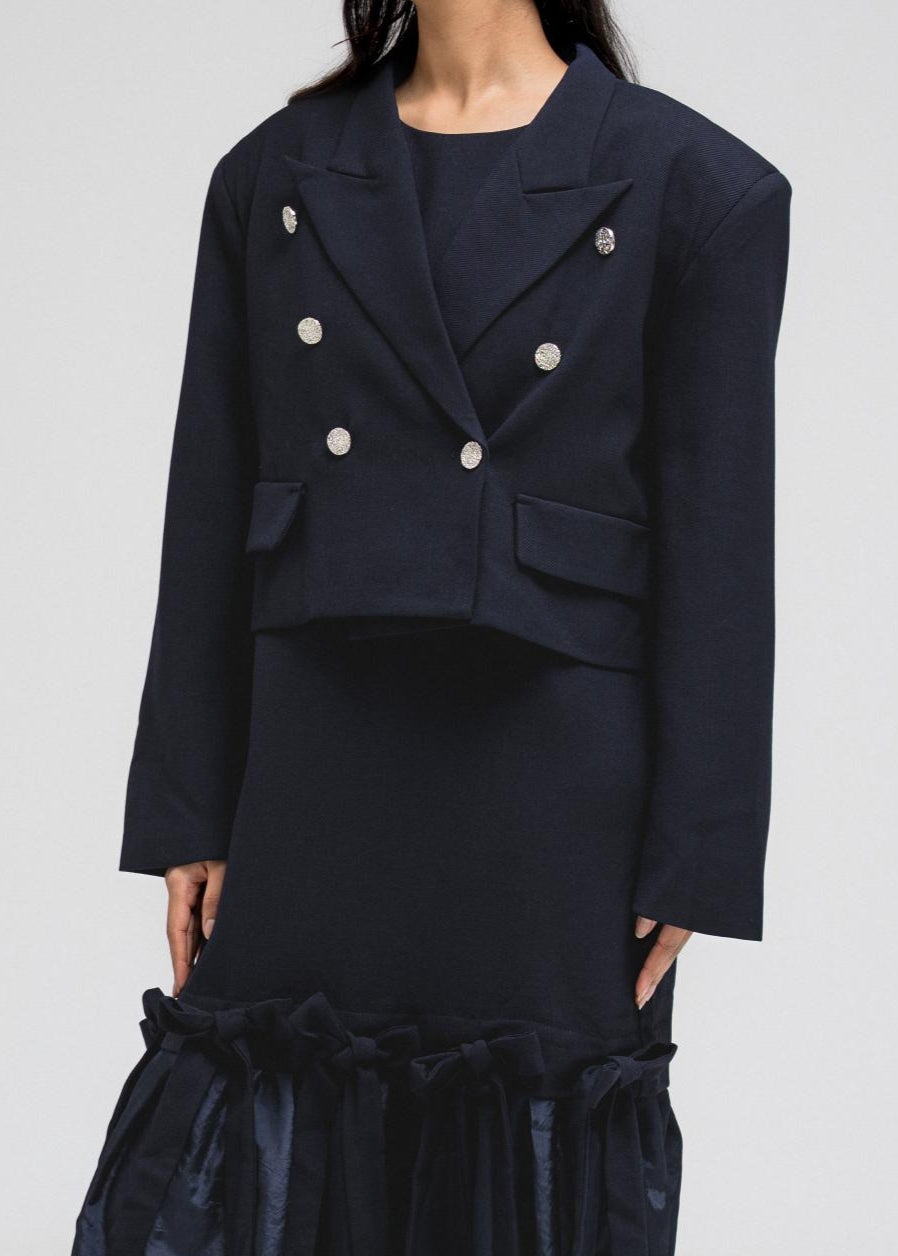 تتميز هذه السترة القصيرة بقماش مُحكم ومُحكم، مع ياقة مُدببة حادة تُضفي لمسةً أنيقة. جبهتها مُزينة بأزرار معدنية تُضفي تباينًا أنيقًا. ورغم أنها تبدو وكأنها تحتوي على جيوب، إلا أن تصميمها لا يتضمن سوى أغطية جيوب.