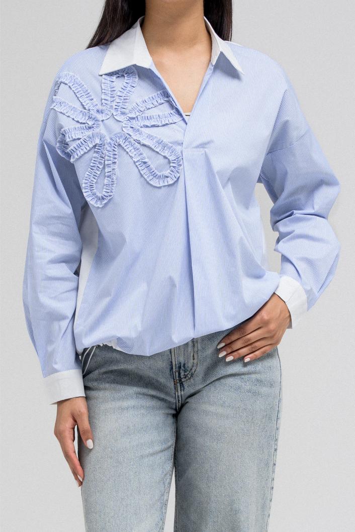 يتميز هذا القميص بقماش خفيف جدًا وجيد التهوية، مزين بنقشة مخططة رقيقة على الجهة الأمامية، ويكمله تصميم زهور فريد من الخرز على أحد الجانبين. يتميز بياقة وأساور بيضاء كلاسيكية متباينة اللون لمظهر أنيق. أما الجزء الخلفي، فهو سادة لمظهر أنيق. يحتوي الحاشية على أربطة قابلة للتعديل، مما يتيح لكِ تخصيص التصميم حسب رغبتكِ.