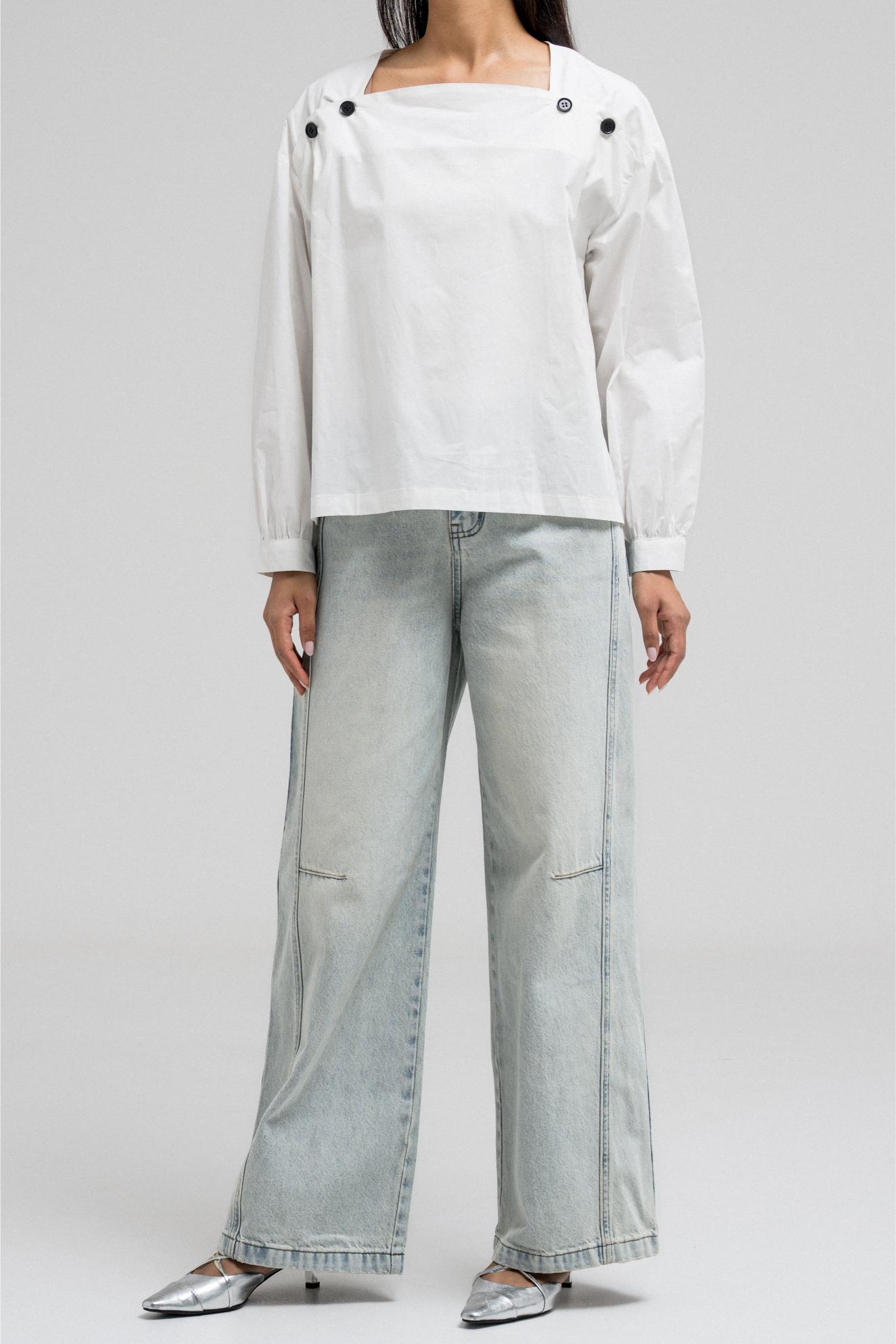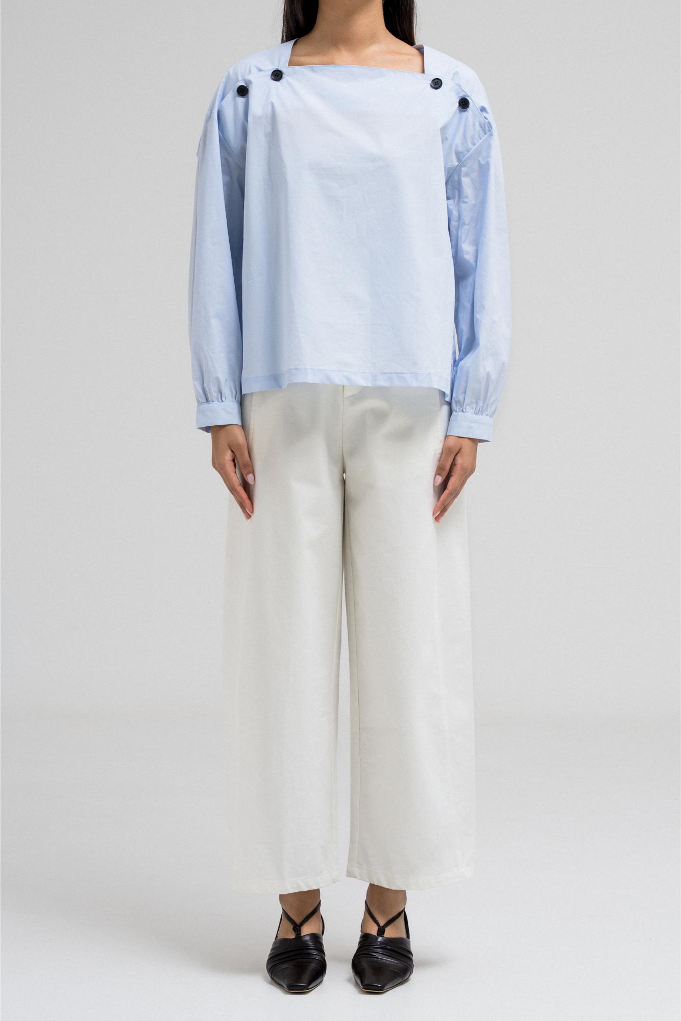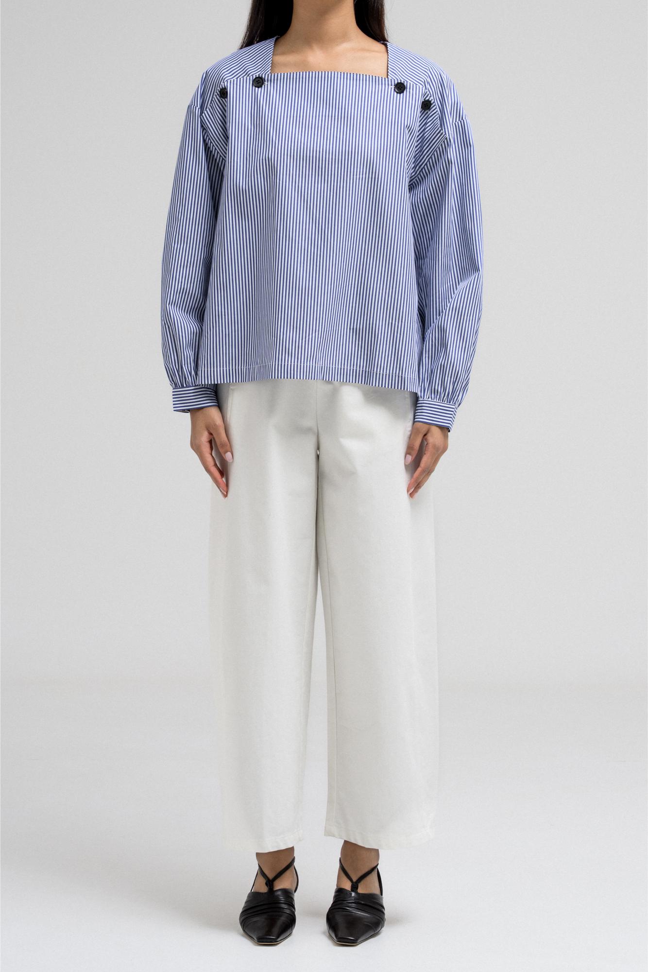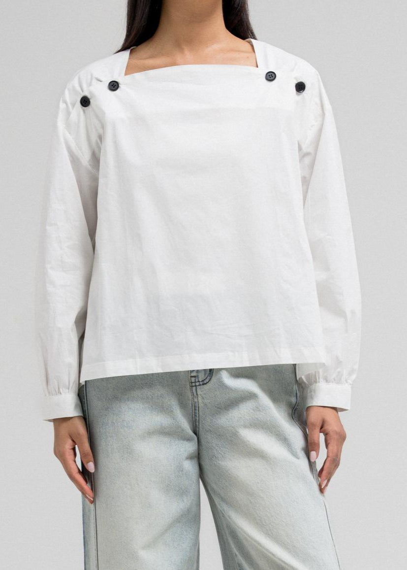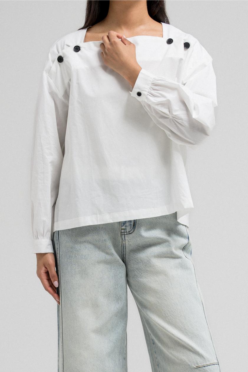 تتميز هذه البلوزة الخفيفة بفتحة رقبة مربعة أنيقة مزينة بأزرار مميزة على الجانبين، مما يمنحها مظهرًا عصريًا ومنظمًا. كما تضفي الأكمام الطويلة والتصميم الأنيق لمسةً من الأناقة.