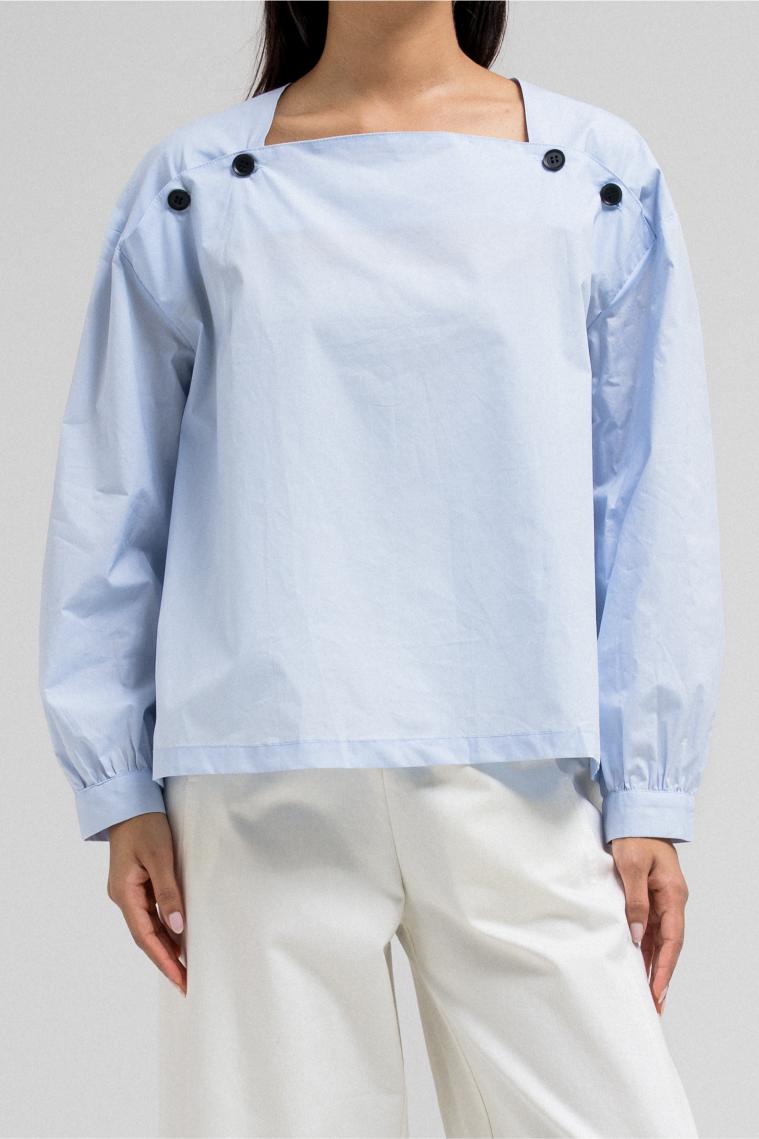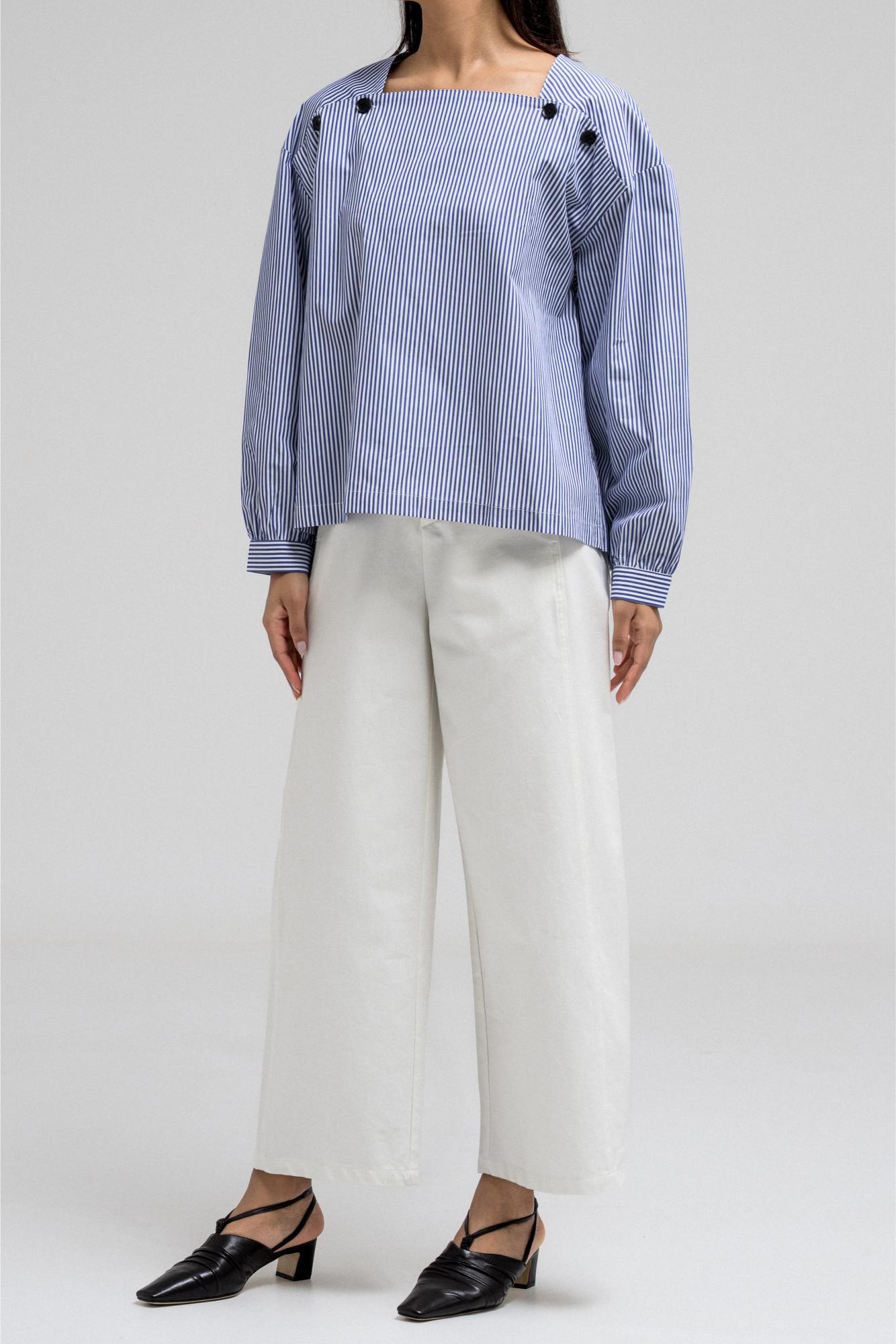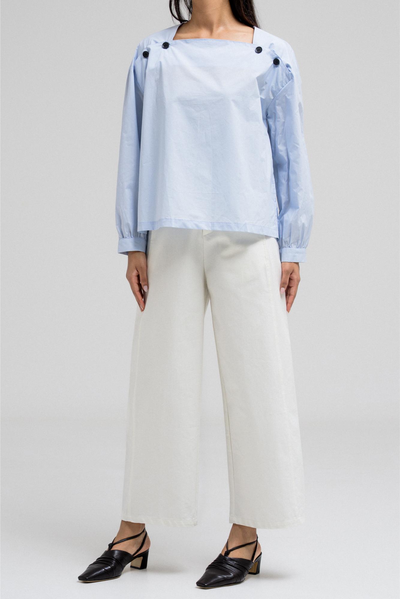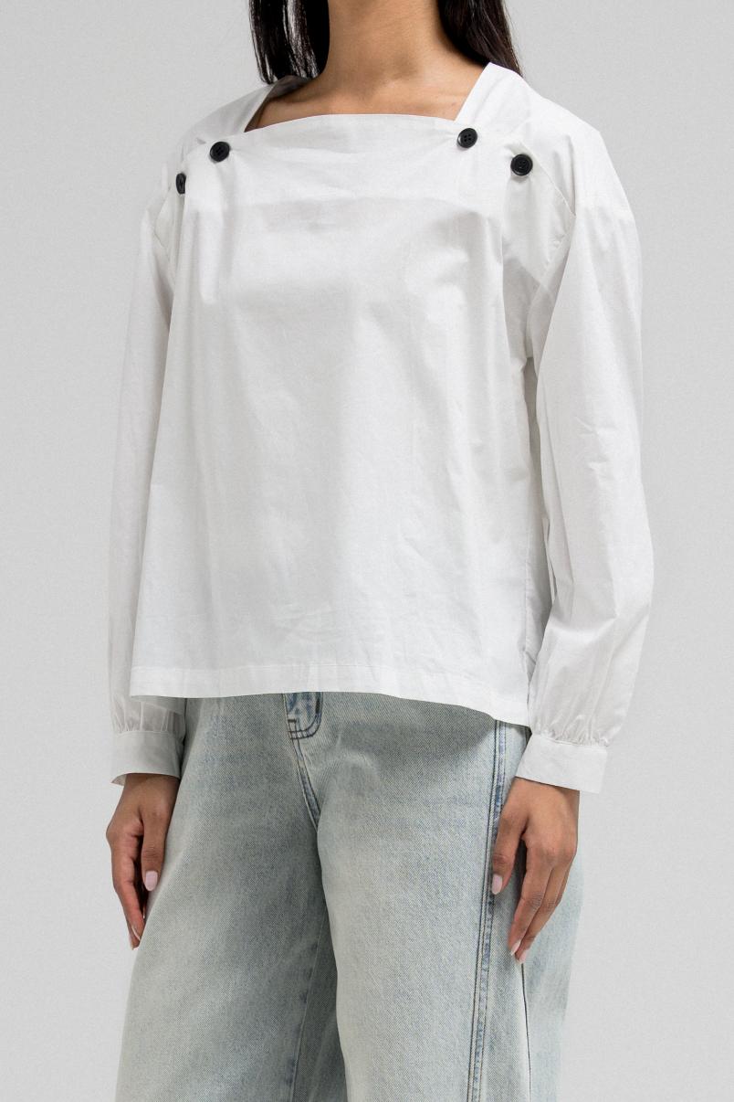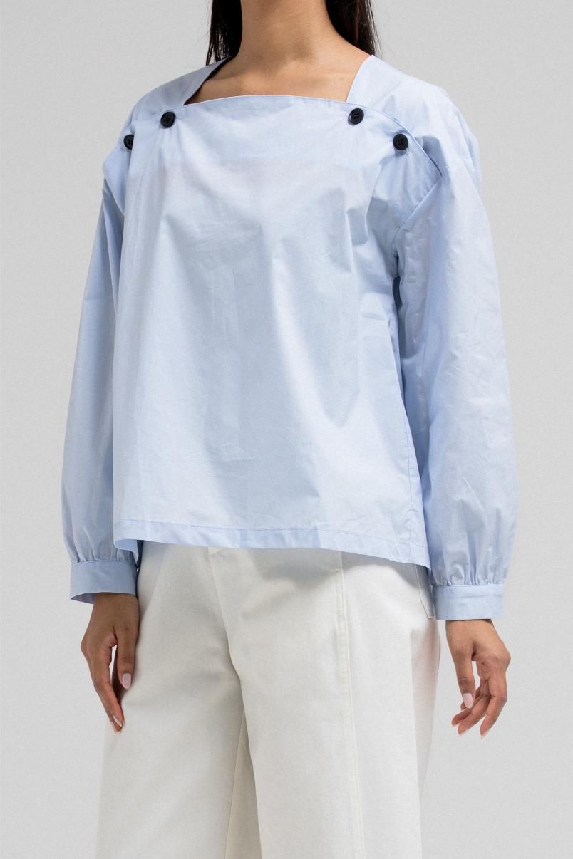 تتميز هذه البلوزة الخفيفة بفتحة رقبة مربعة أنيقة مزينة بأزرار مميزة على الجانبين، مما يمنحها مظهرًا عصريًا ومنظمًا. كما تضفي الأكمام الطويلة والتصميم الأنيق لمسةً من الأناقة.
