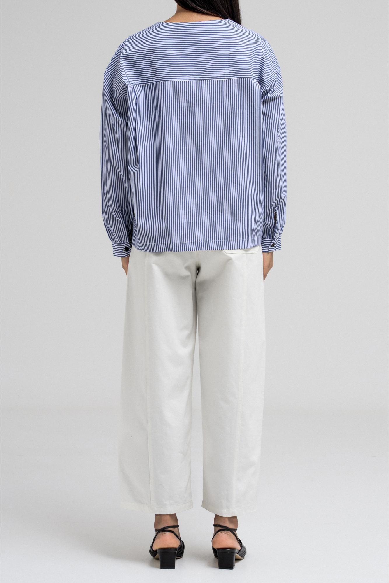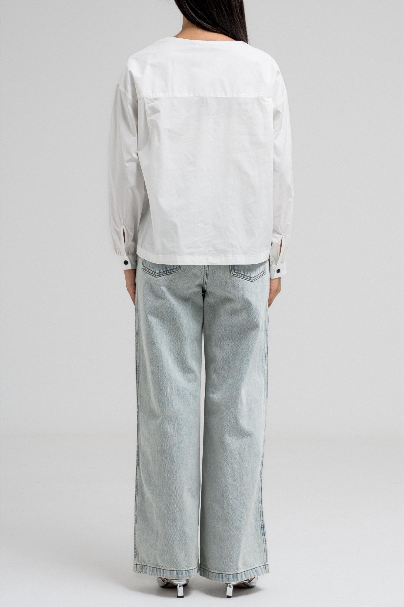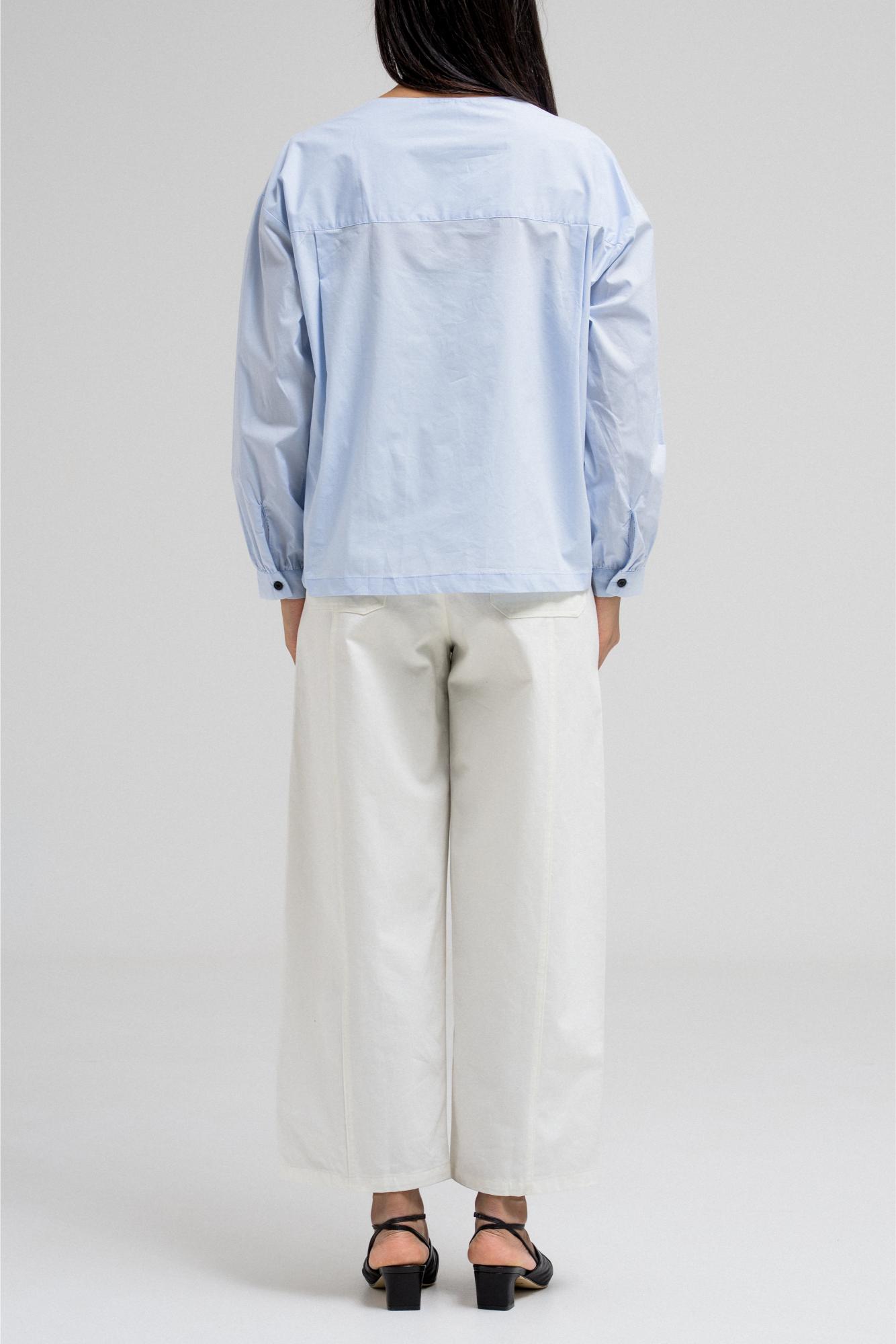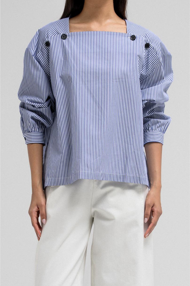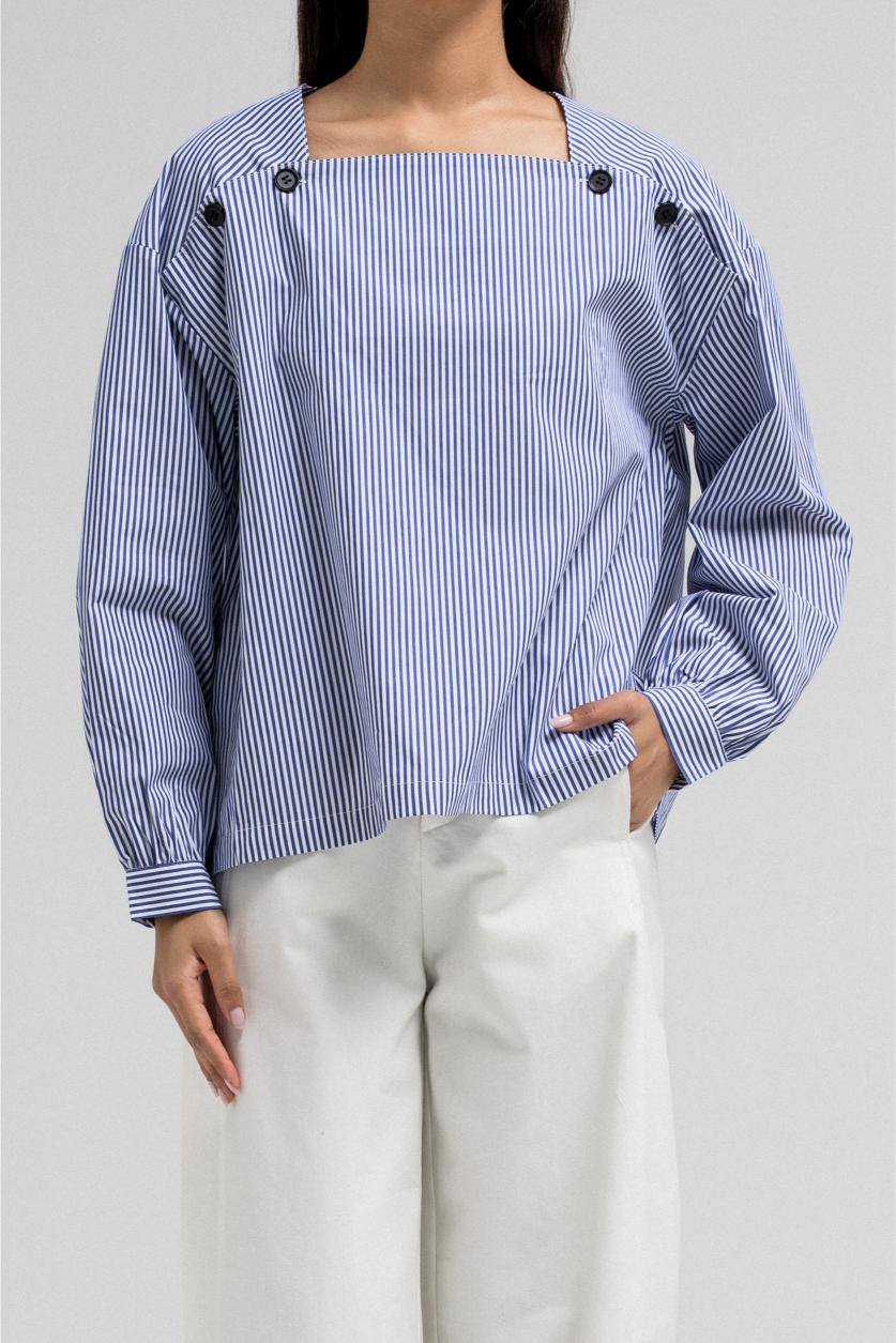 تتميز هذه البلوزة الخفيفة بفتحة رقبة مربعة أنيقة مزينة بأزرار مميزة على الجانبين، مما يمنحها مظهرًا عصريًا ومنظمًا. كما تضفي الأكمام الطويلة والتصميم الأنيق لمسةً من الأناقة.