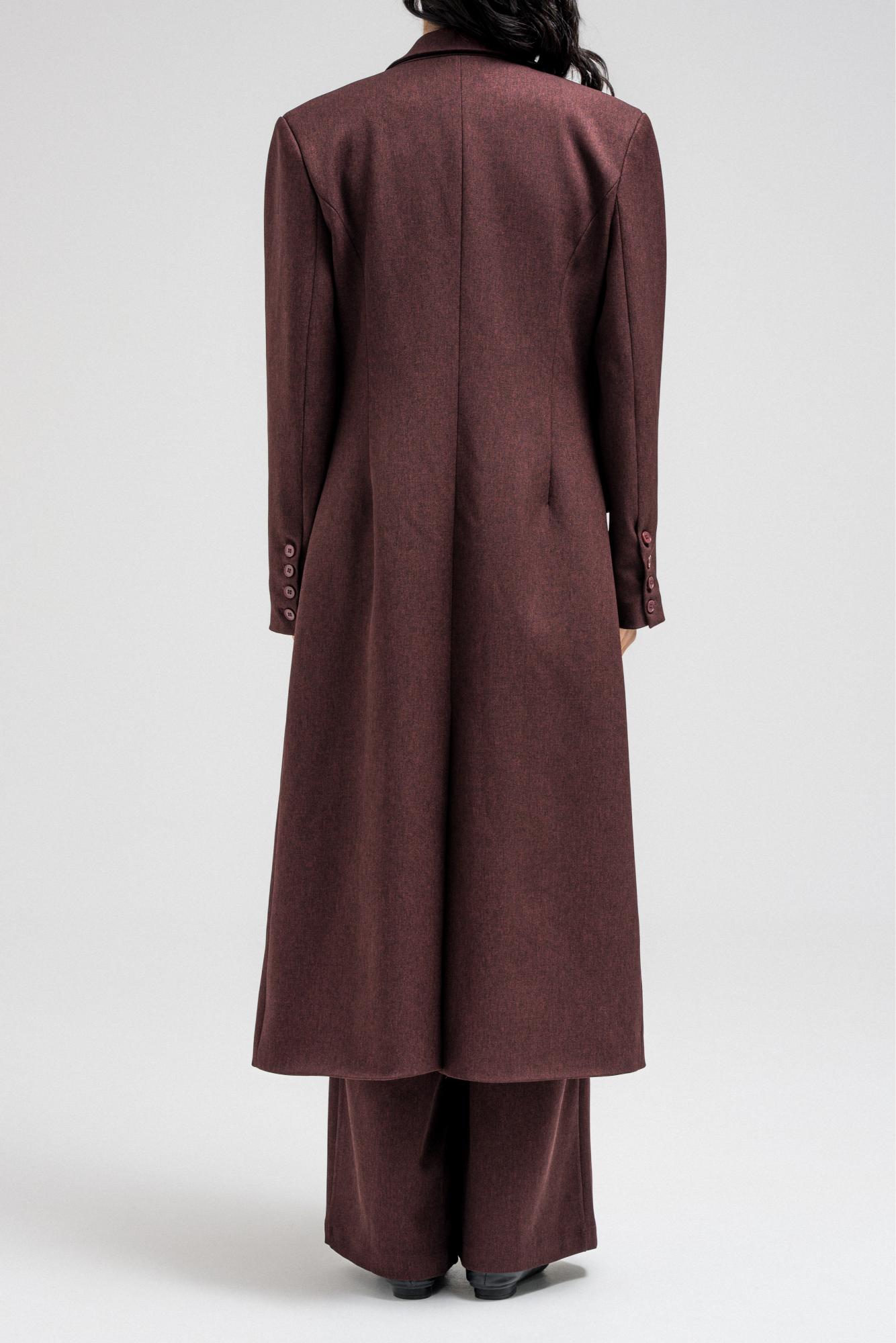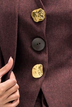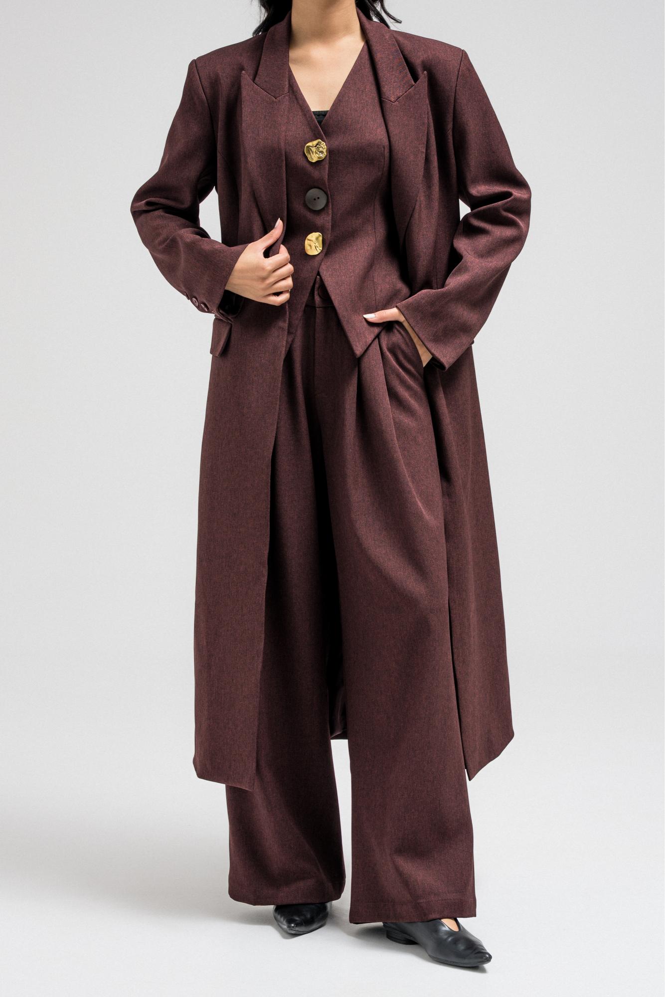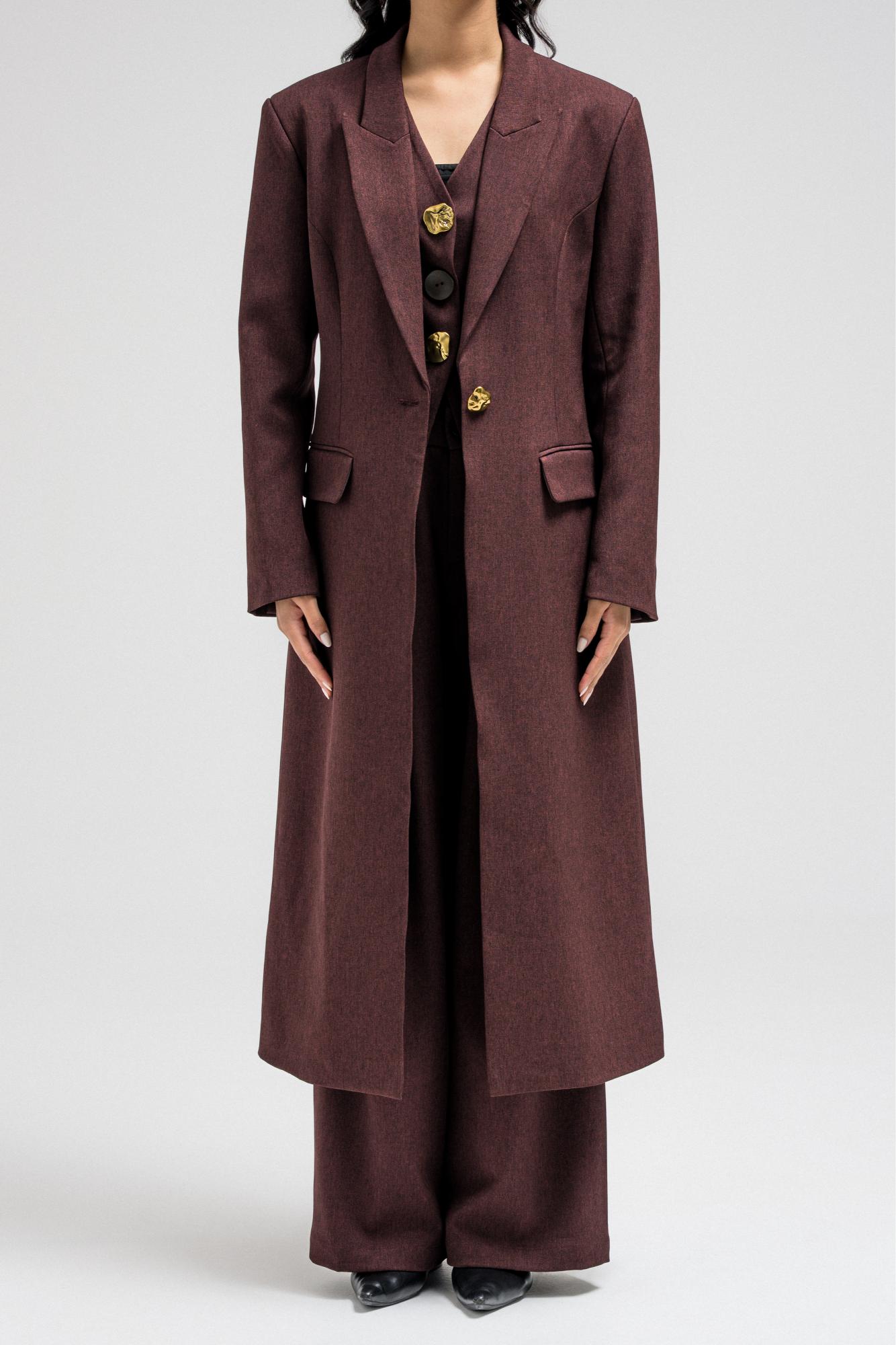 This long, slightly cinched blazer jacket features a single gold button closure at the front, complemented by flap pockets for a classic and tailored silhouette. The design makes it a perfect pairing with it's matching vest underneath and tailored pants for a sophisticated, fashion-forward look.