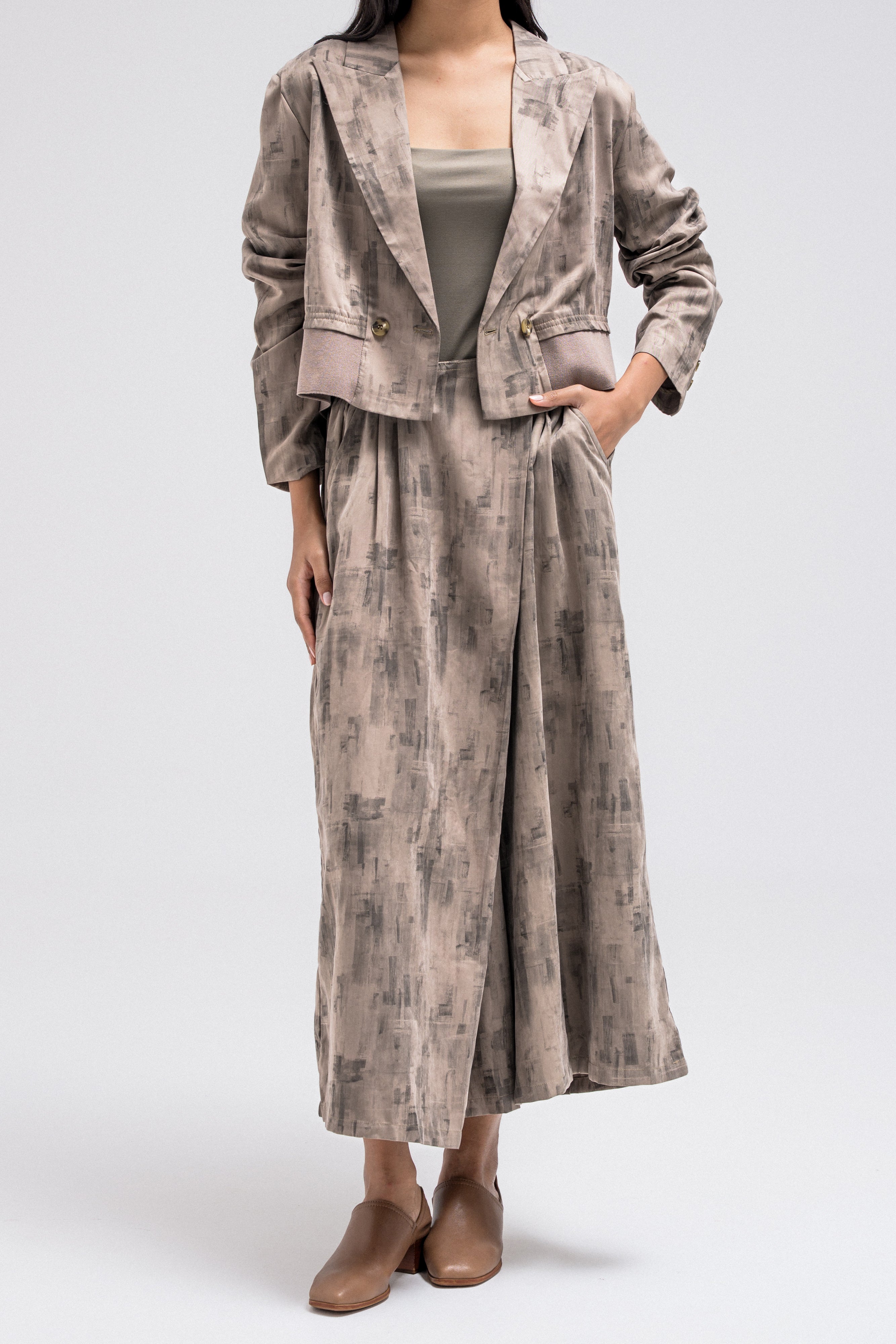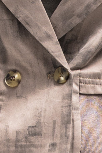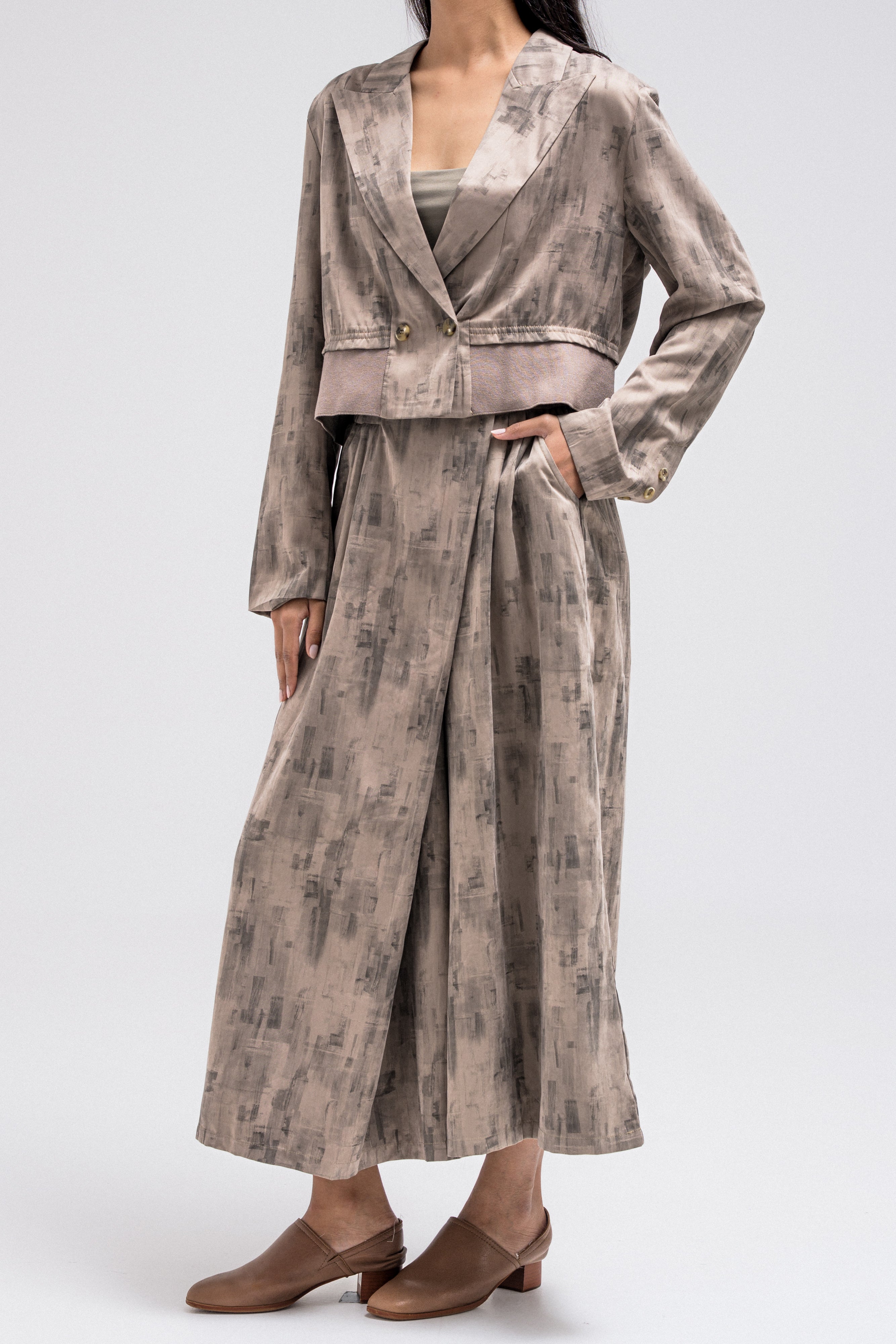 This cropped blazer features a refined printed pattern that adds visual interest while keeping a clean, tailored look. Designed with a classic lapel collar and a structured silhouette, it has a wrap-style front that subtly defines the waist.