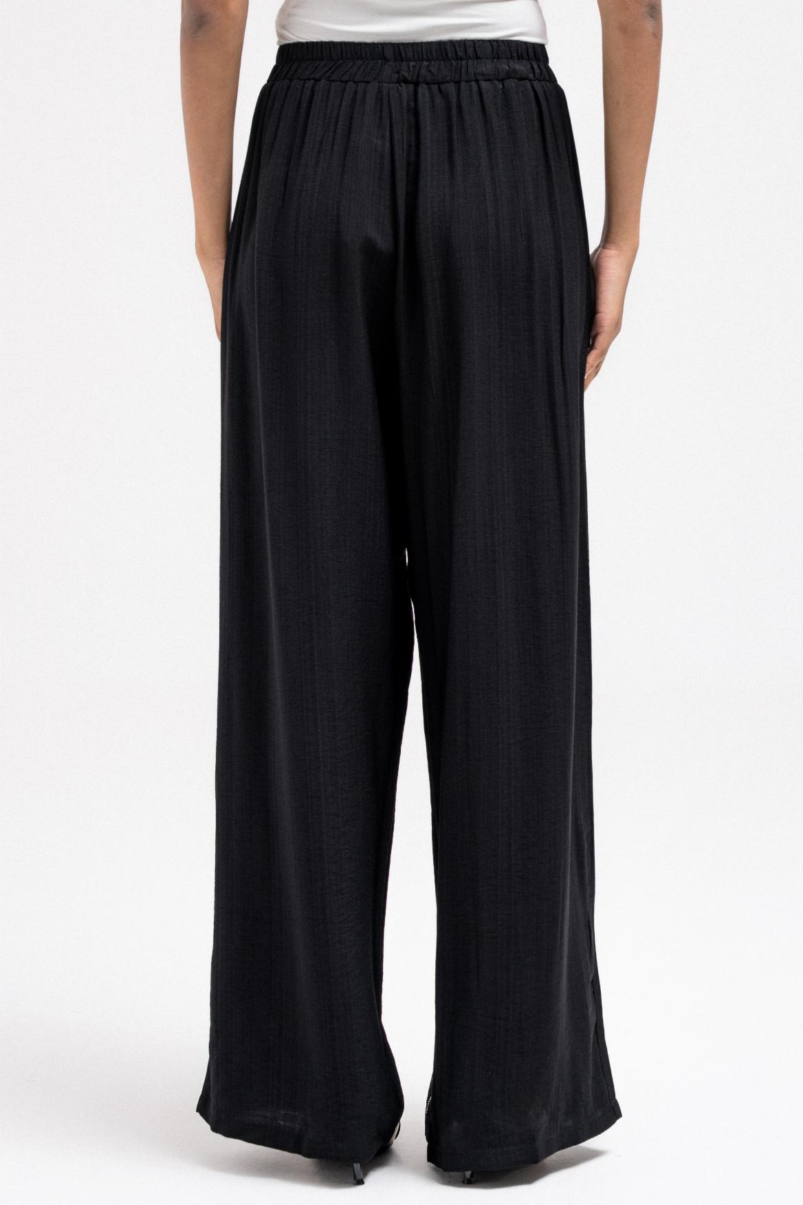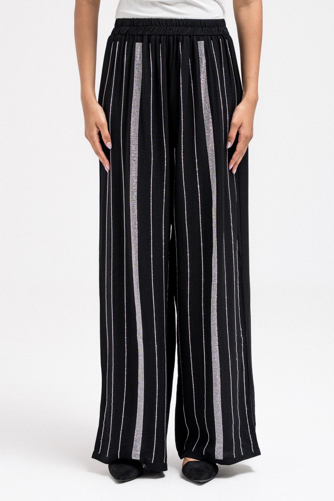 يتميز هذا البنطال الخفيف بتفاصيل خطوط أحجار الراين البراقة على طوله الأمامي. مصمم بحزام خصر مطاطي للراحة، وسهل الارتداء، ومثالي للتنسيق مع بلوزة مطابقة لإطلالة متناسقة.
