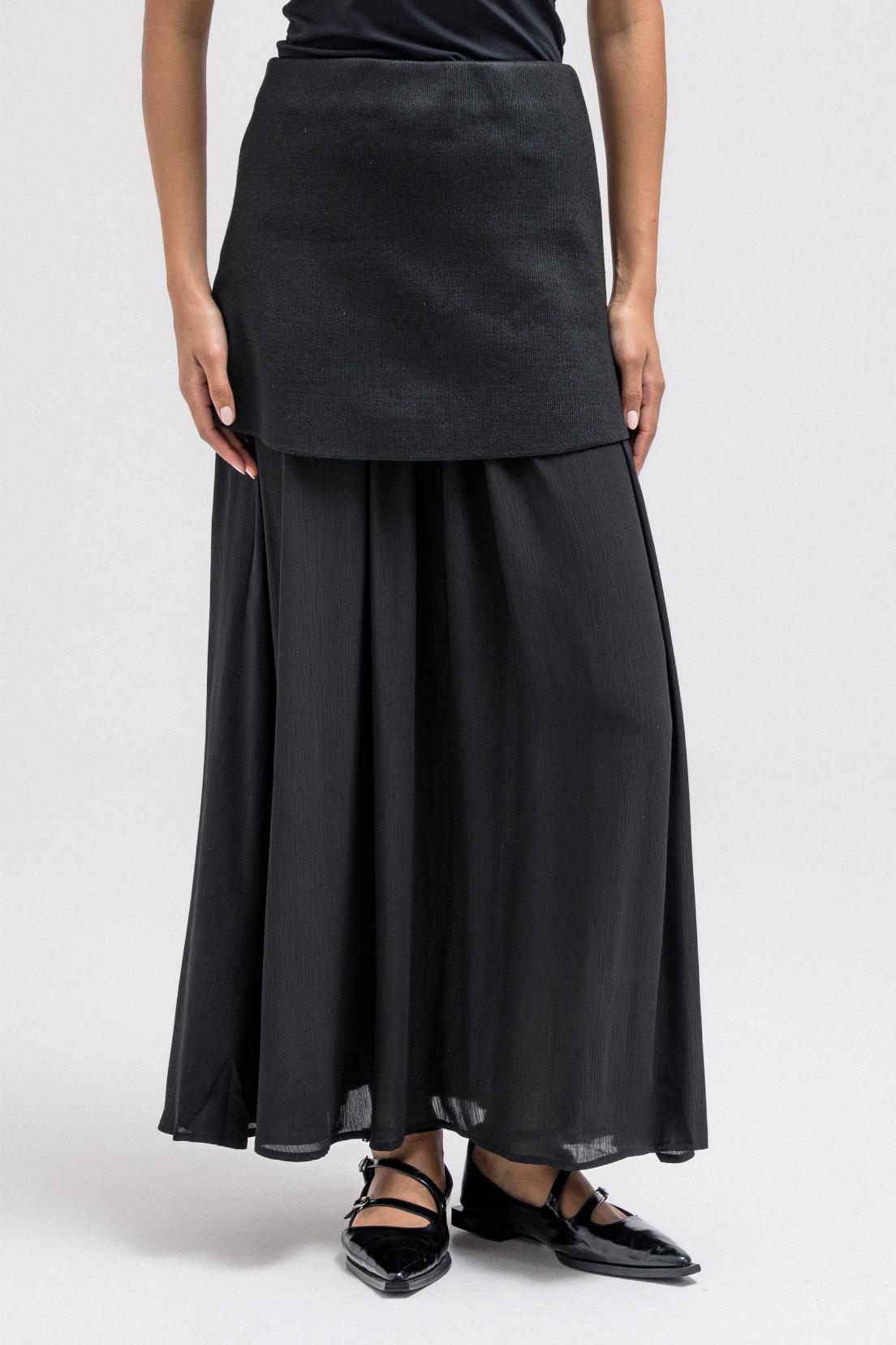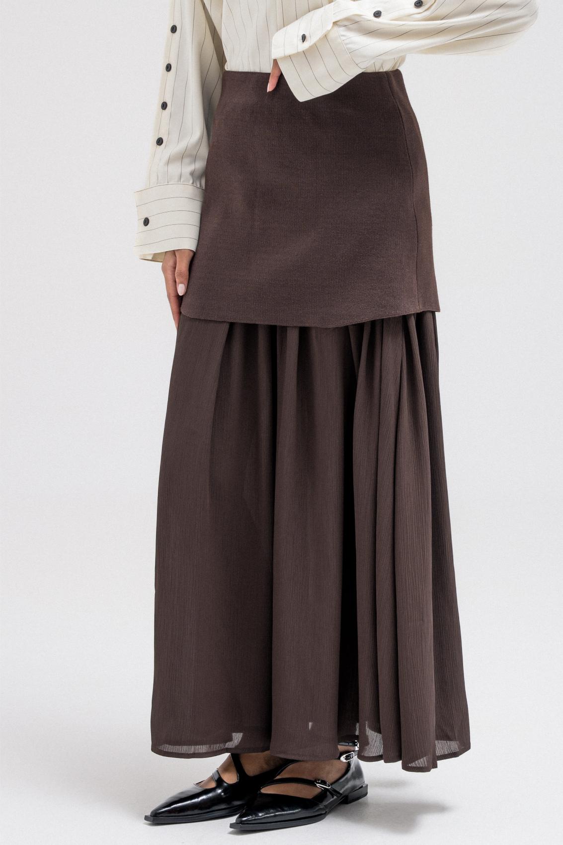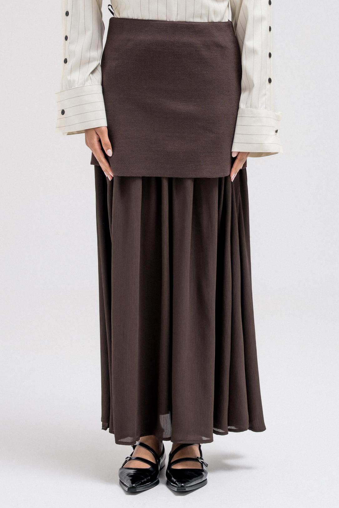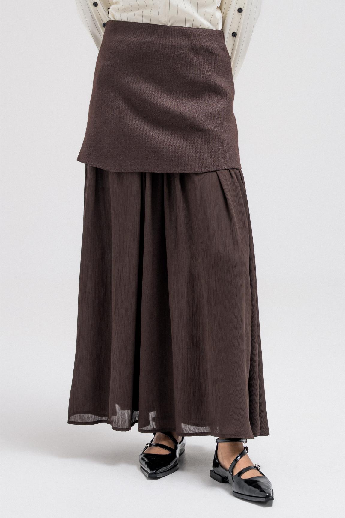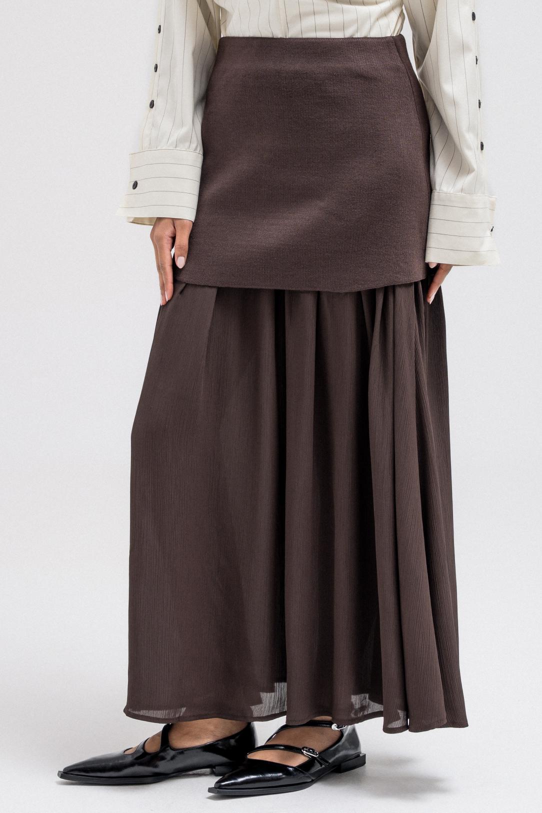 A feminine skirt with a layered design that adds movement and depth. The flowing silhouette creates an elegant shape, perfect for pairing with structured tops or cozy knits.