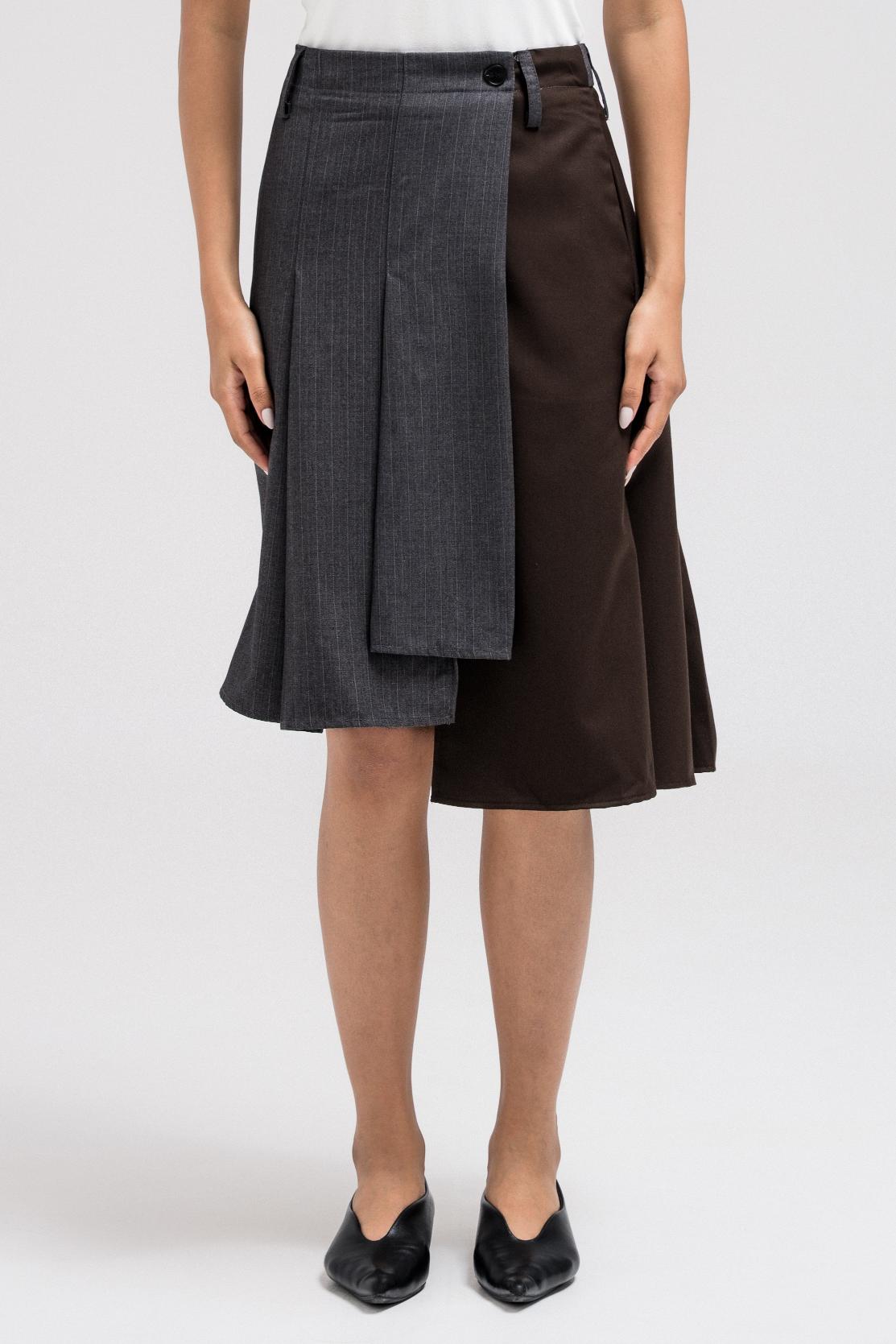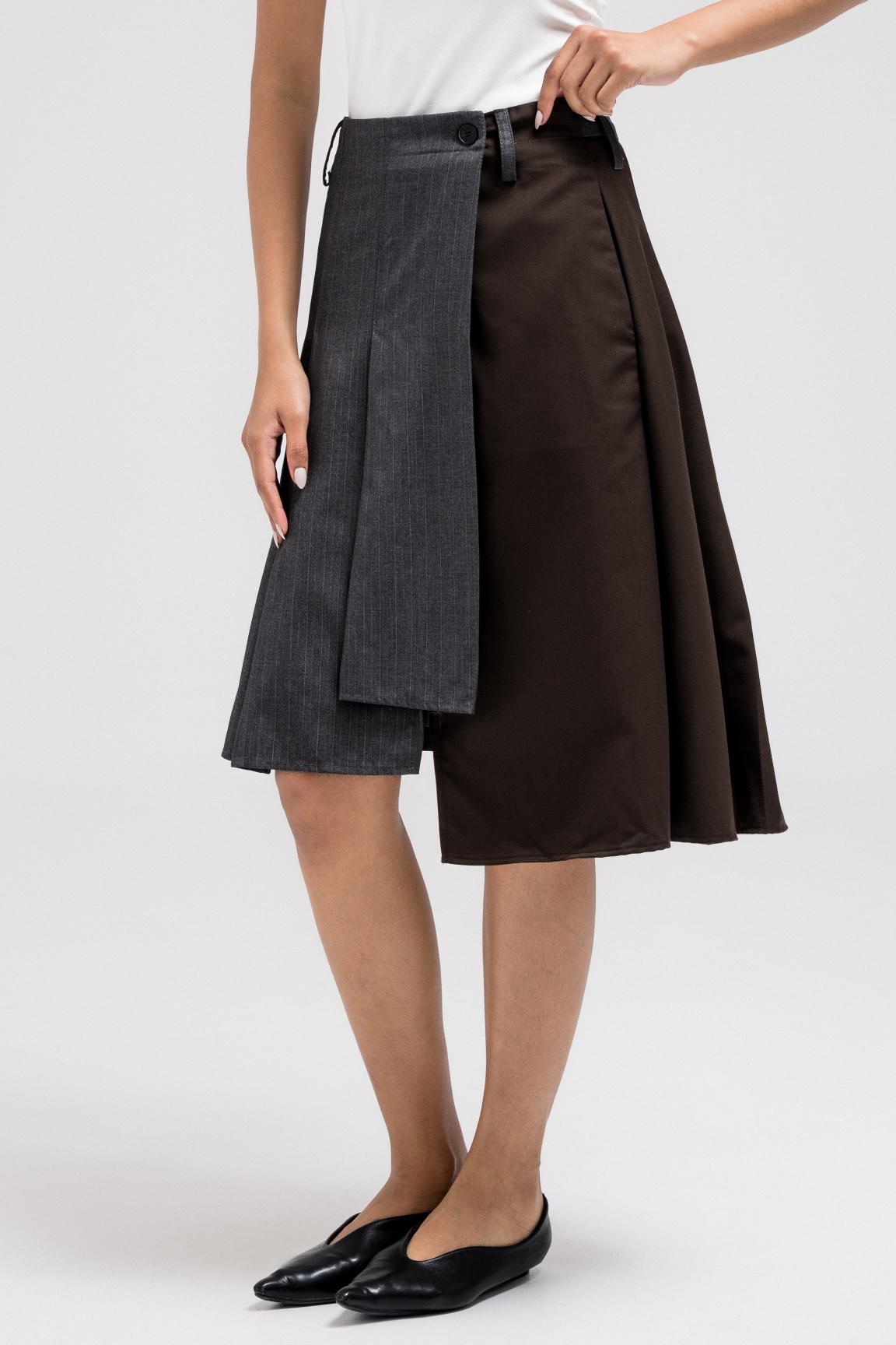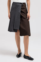A modern pleated skirt designed in a striking two-tone color combination, where each side features a contrasting shade for a unique layered effect. The soft pleats create natural movement and flow, giving the skirt an elegant yet contemporary feel.