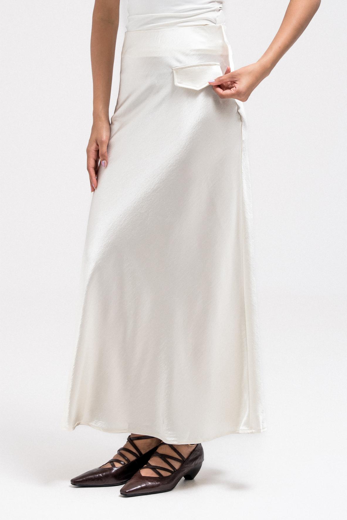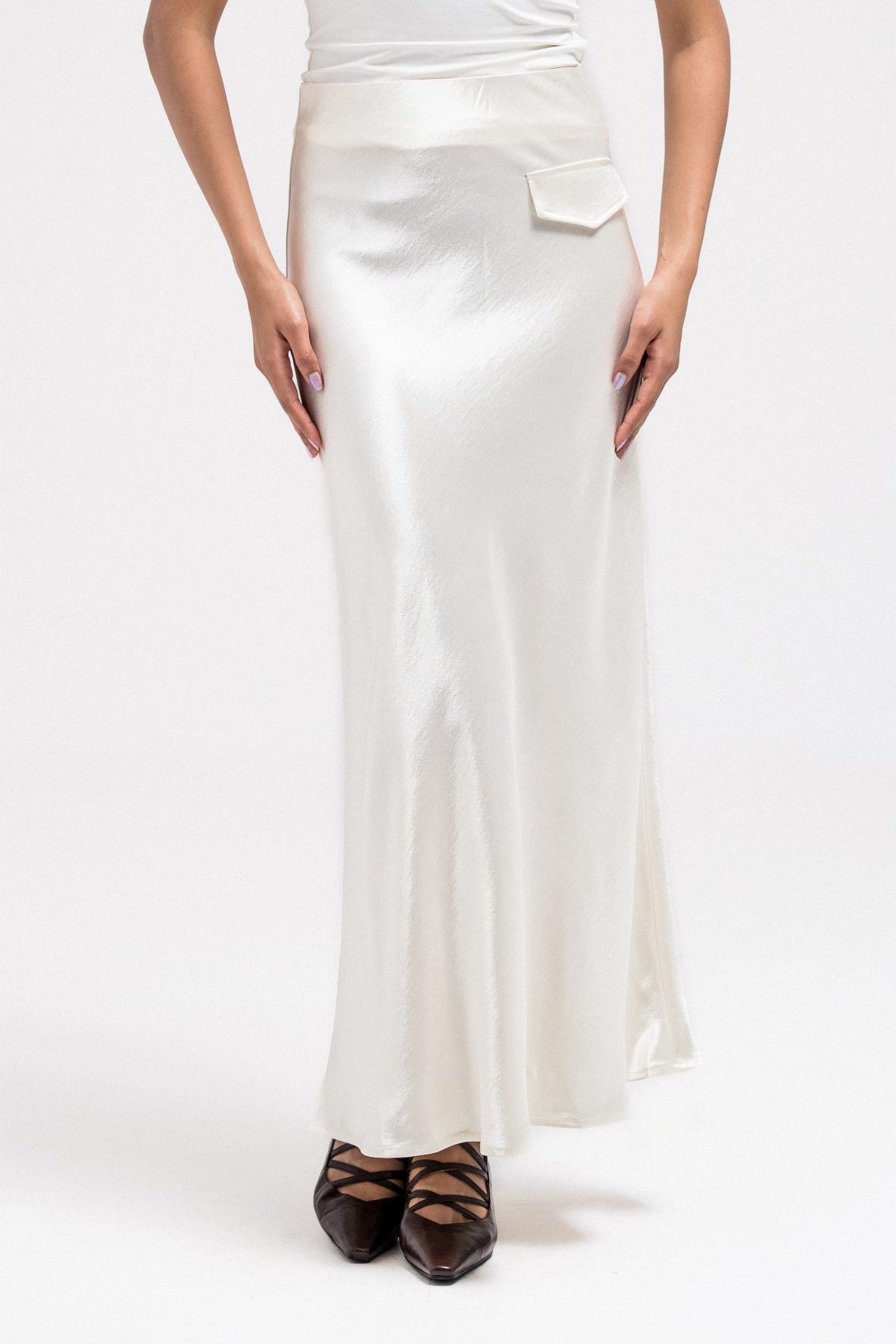 Crafted from a lightweight silk-like fabric, this skirt features a soft, fluid drape that moves beautifully with every step. Designed with a comfortable elastic waistband for an easy, flattering fit, it creates a clean and elegant silhouette. The flowy shape makes it perfect for dressing up or down, and it pairs effortlessly with blazers for a polished, elevated look.