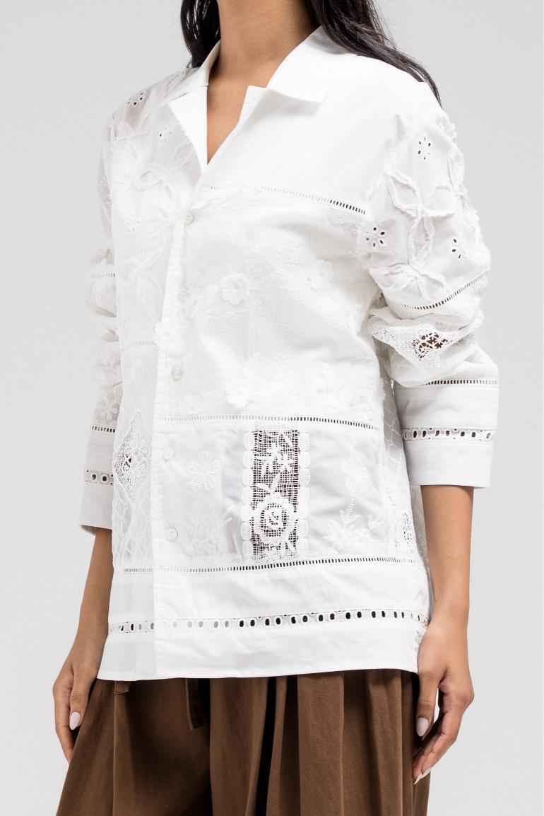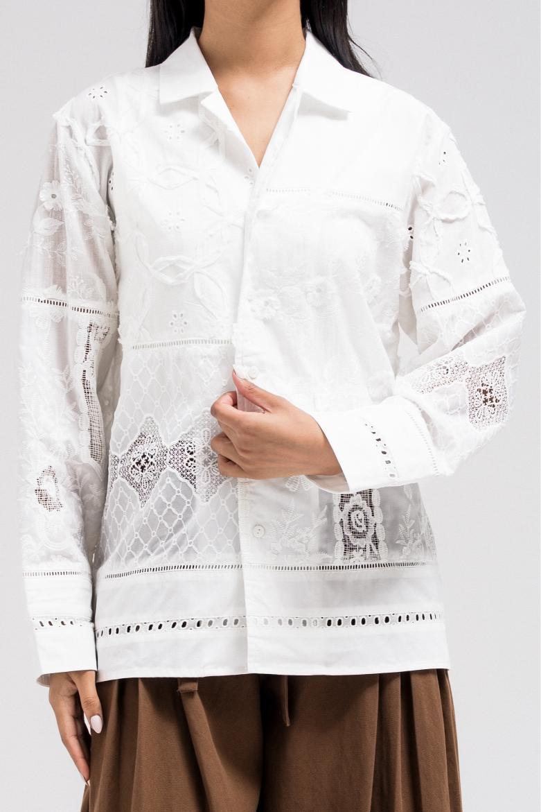 A refined shirt-style top crafted from a lightweight fabric, featuring delicate floral lace panels that add texture and elegance throughout. Designed with a classic collar and front button closure, this piece balances softness with structure. The subtle transparency of the shirt gives it a graceful, feminine feel, making it perfect to style on its own or layered under tailored pieces.