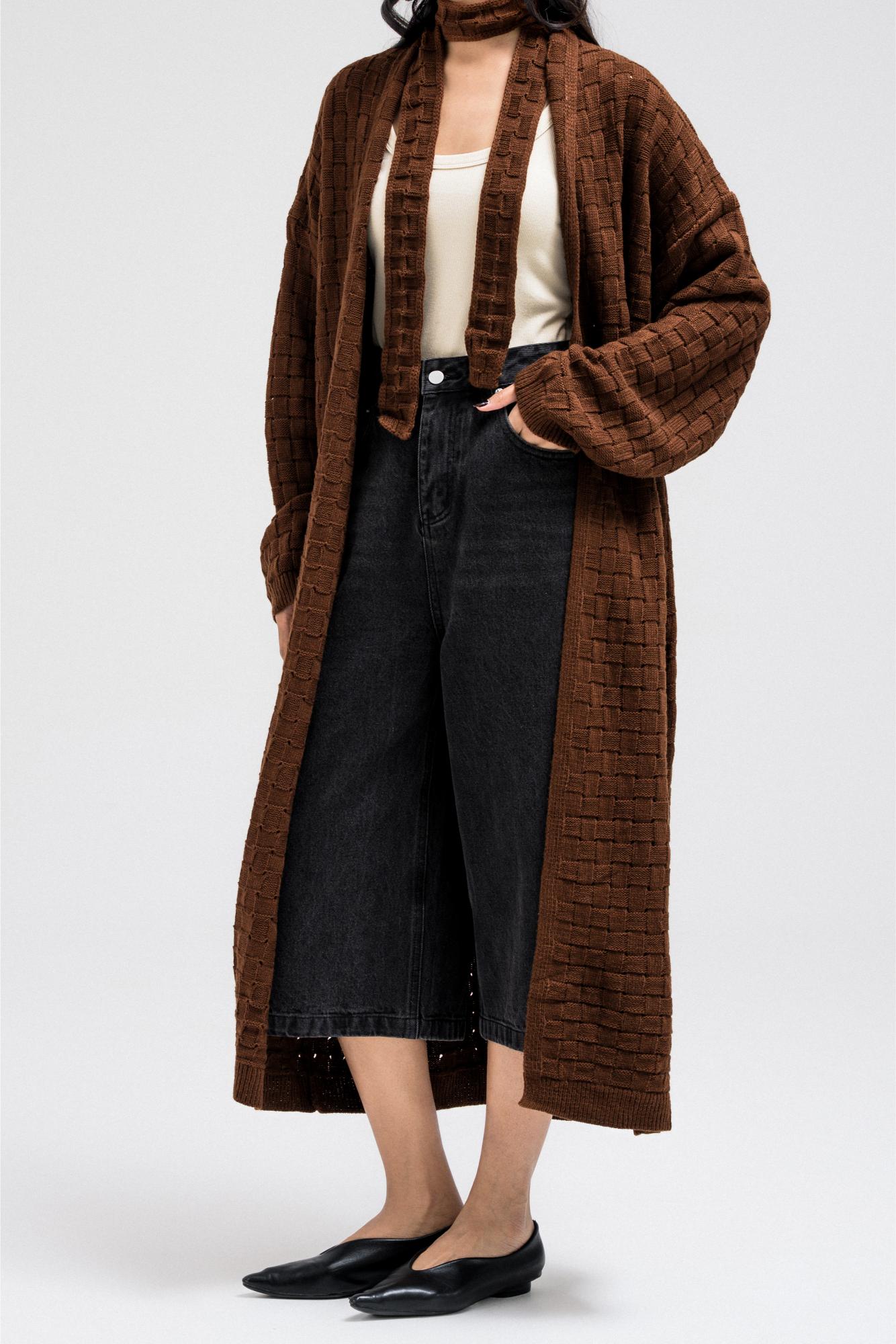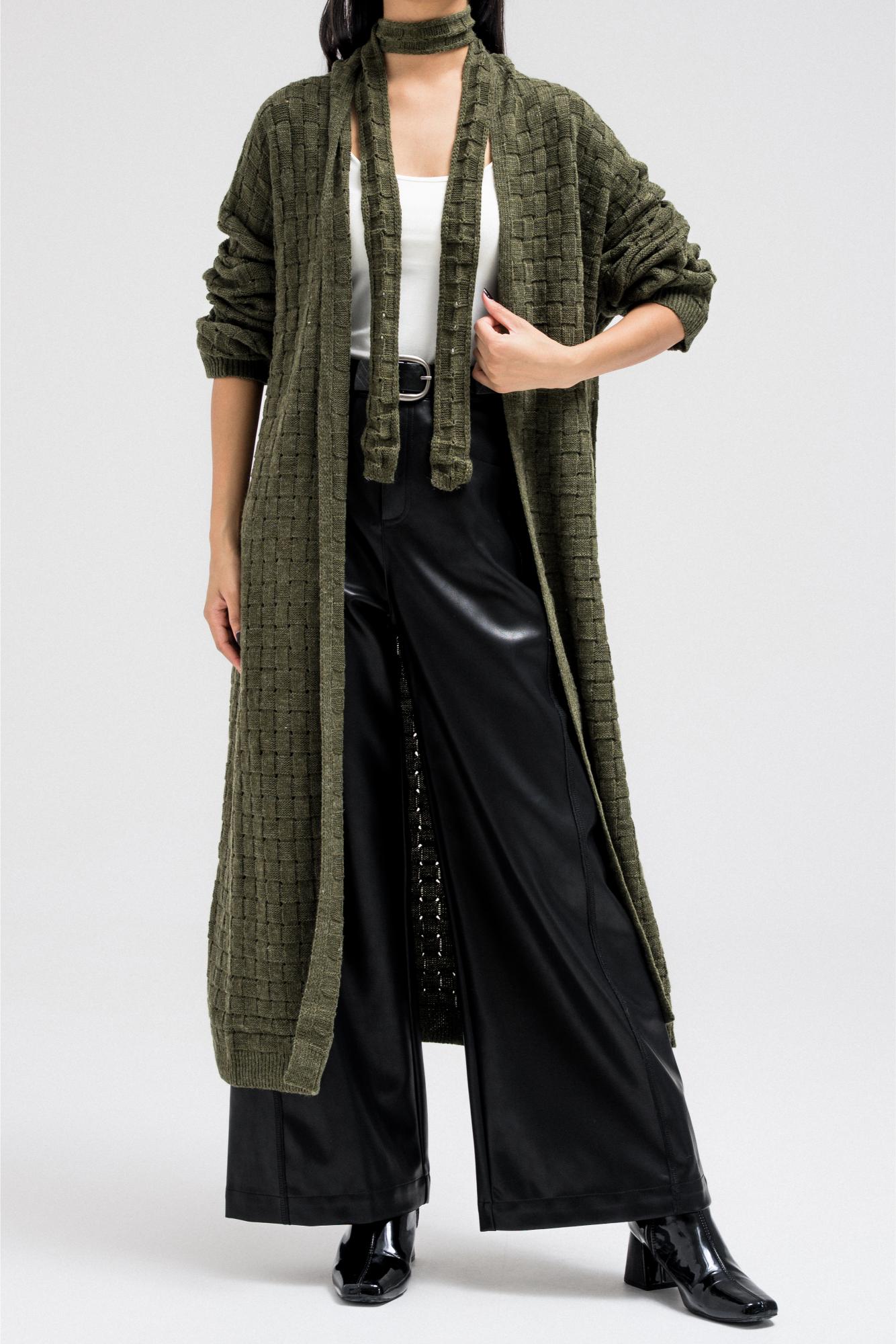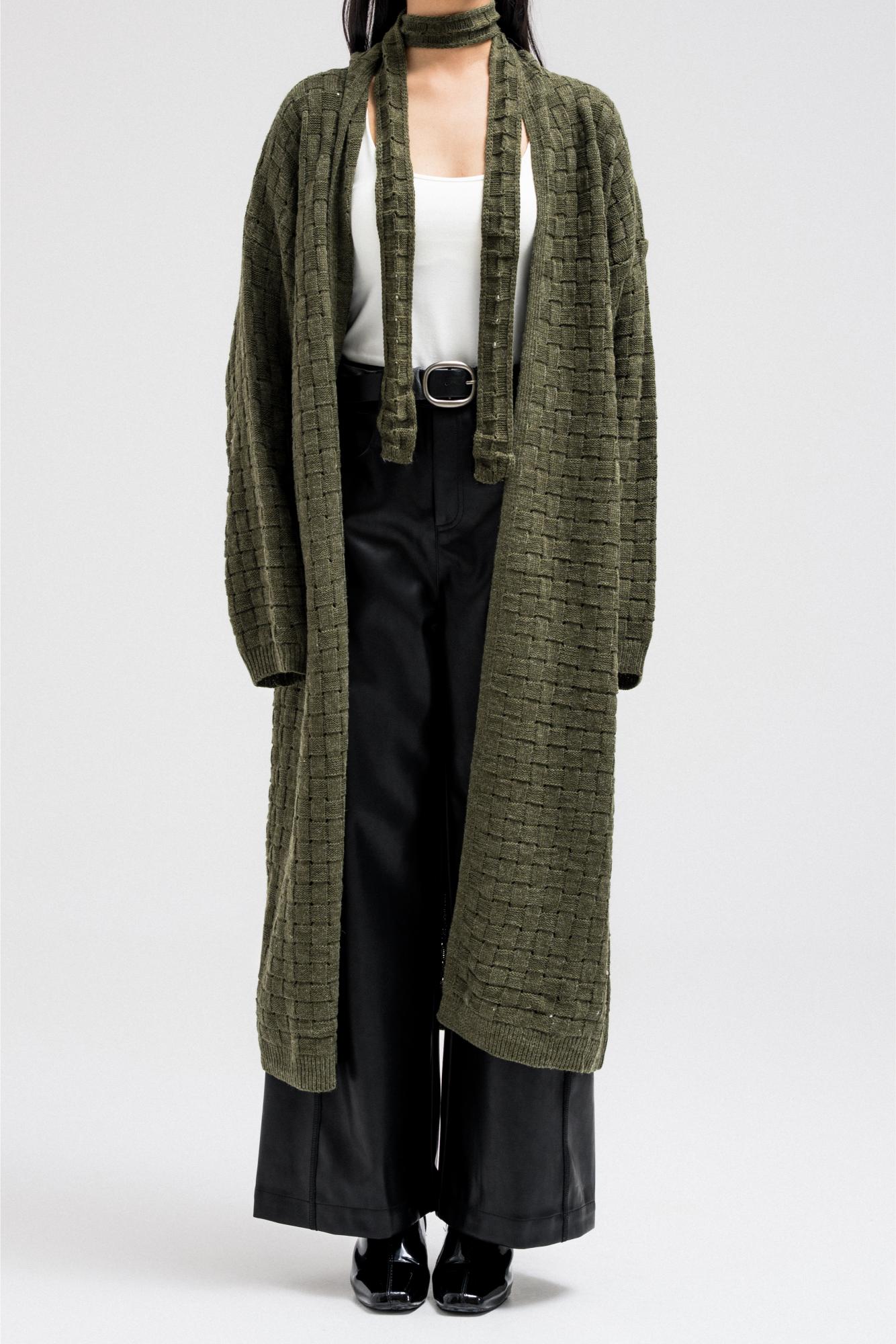A cozy long cardigan designed with a soft textured knit and an open-front silhouette. It comes with a matching belt that can be styled around the waist for a cinched look or worn as a scarf for an elevated layered style. A versatile piece perfect for fall and winter.