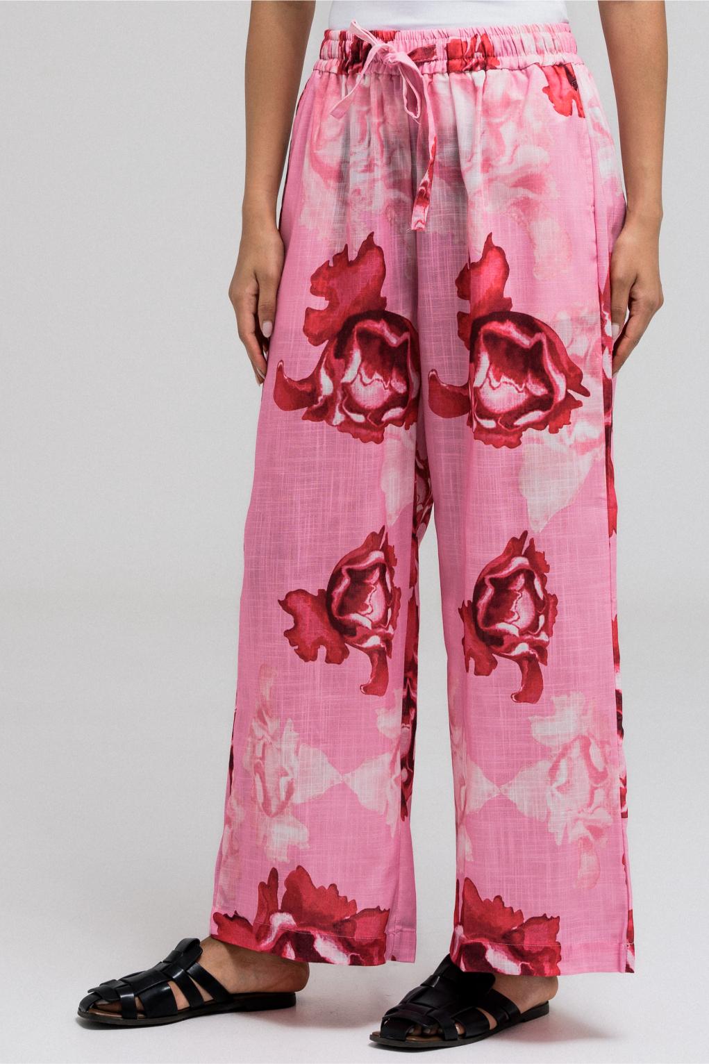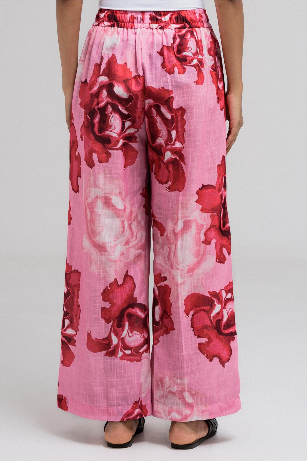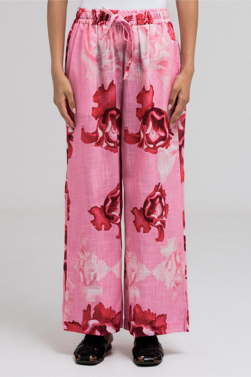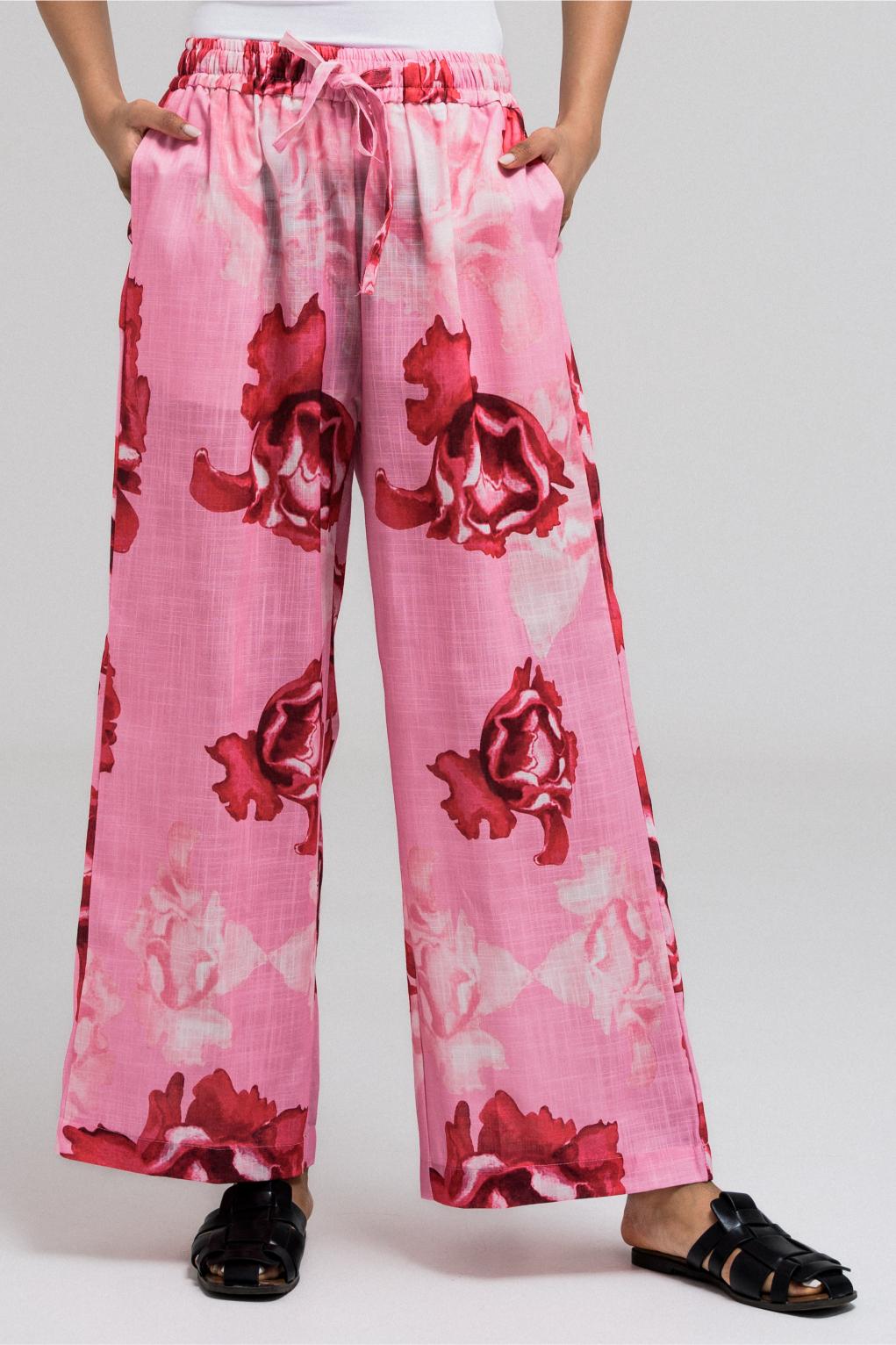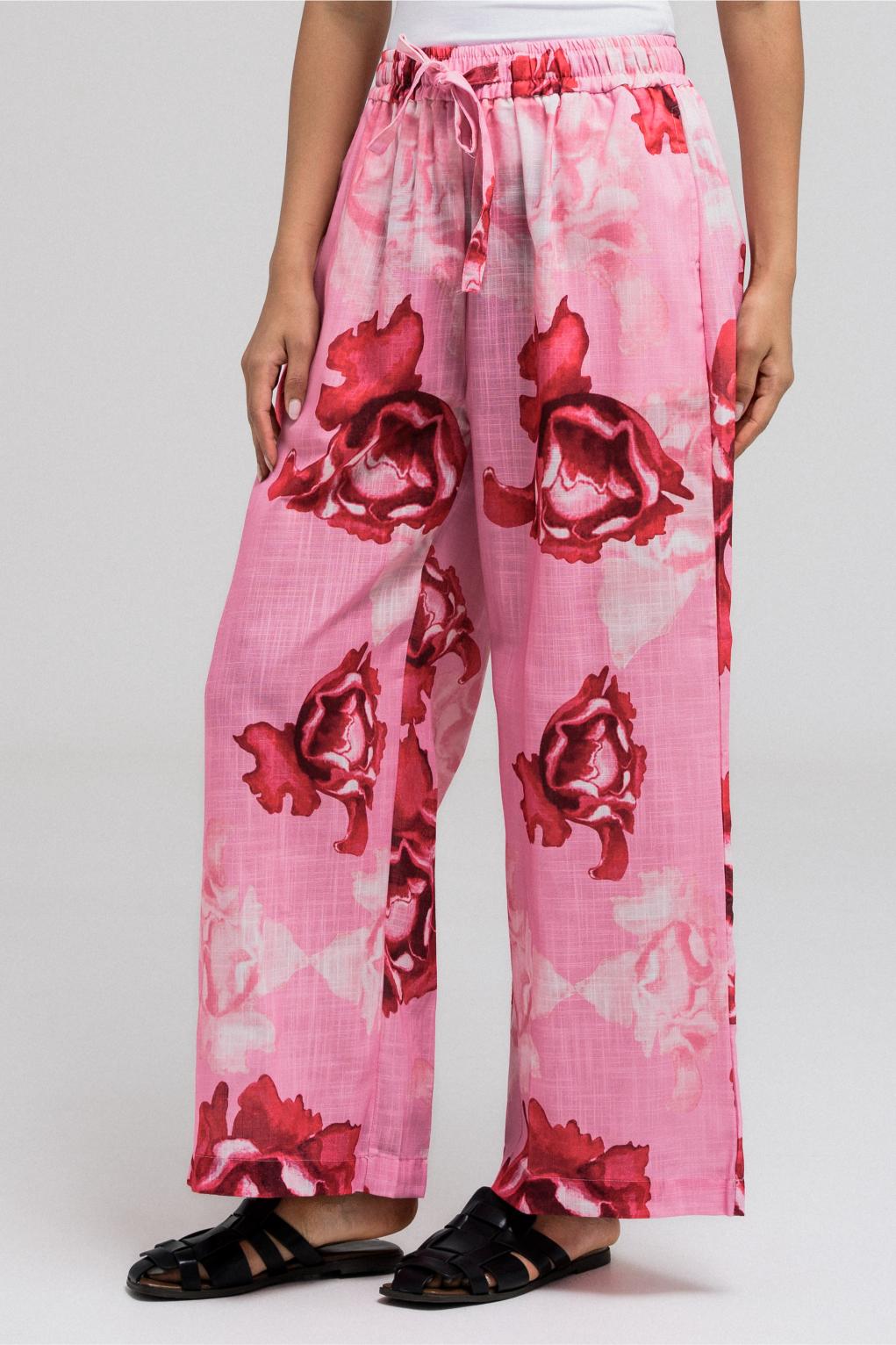 بنطال كتان خفيف الوزن بطبعة زهور حمراء زاهية على قاعدة وردية ناعمة. مصمم بحزام خصر مطاطي ورباط عملي يُربط على شكل فيونكة لراحة قابلة للتعديل. مزود بجيوب جانبية، ويتناسب تمامًا مع البلوزة المتناسقة لإطلالة أنيقة ومتناسقة.