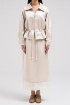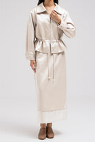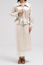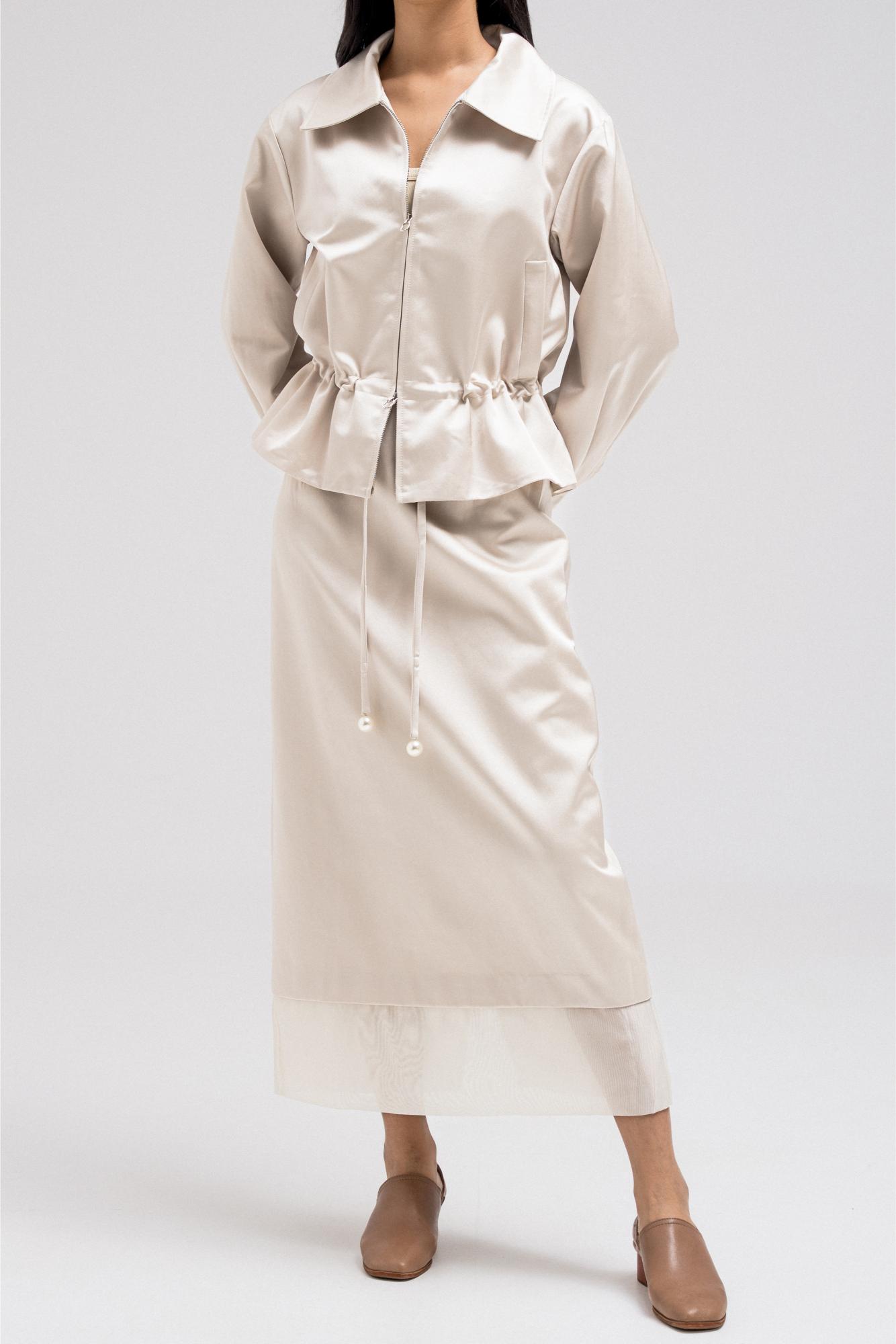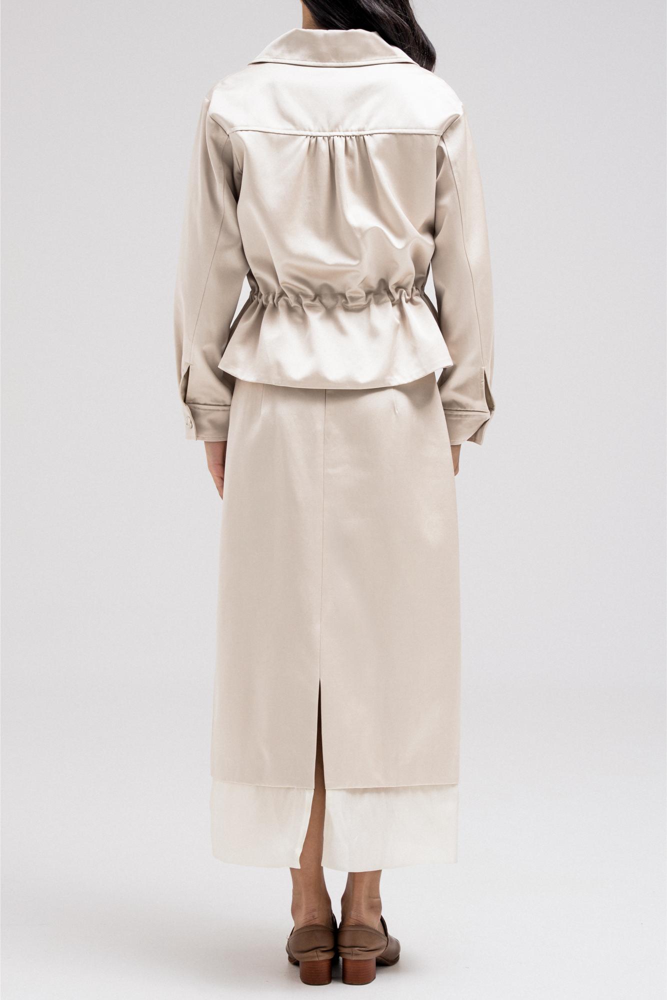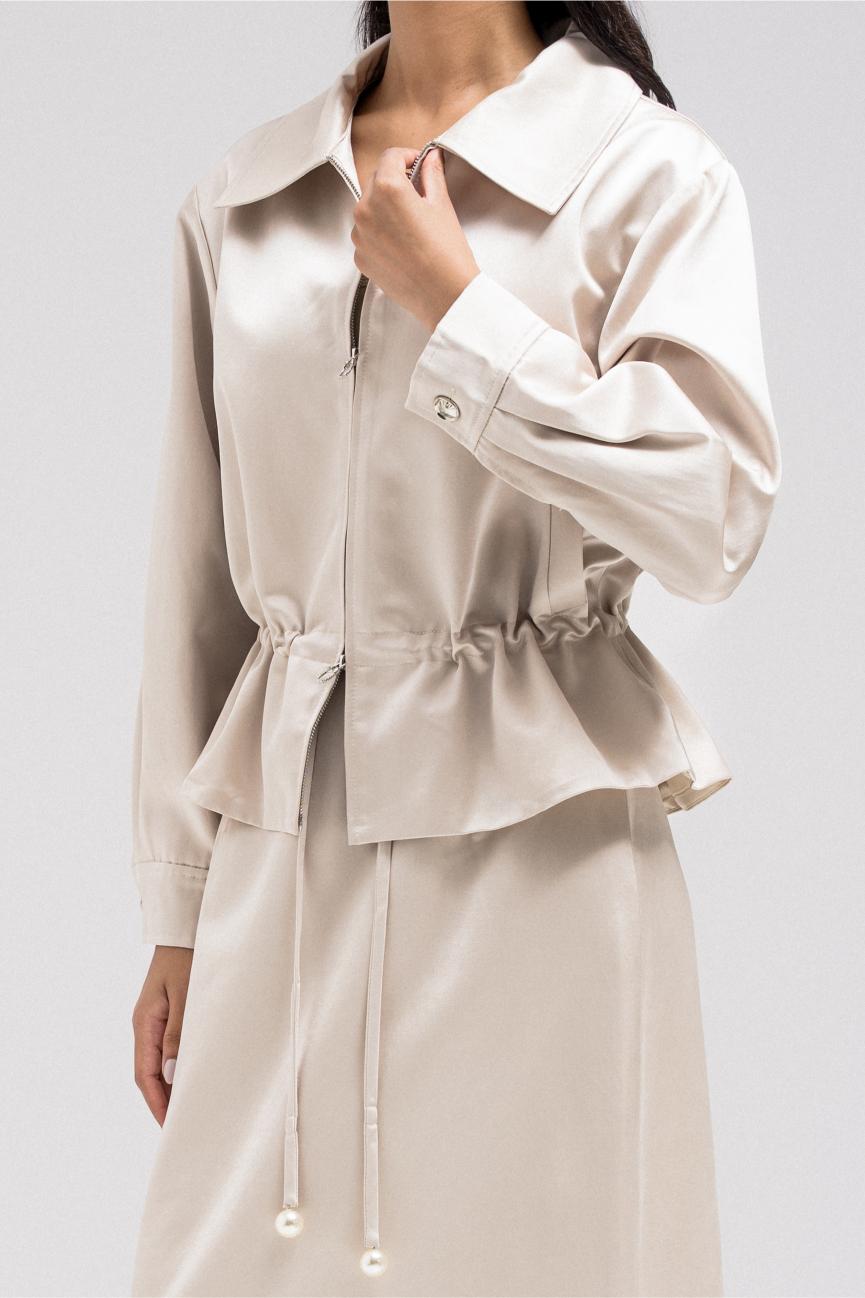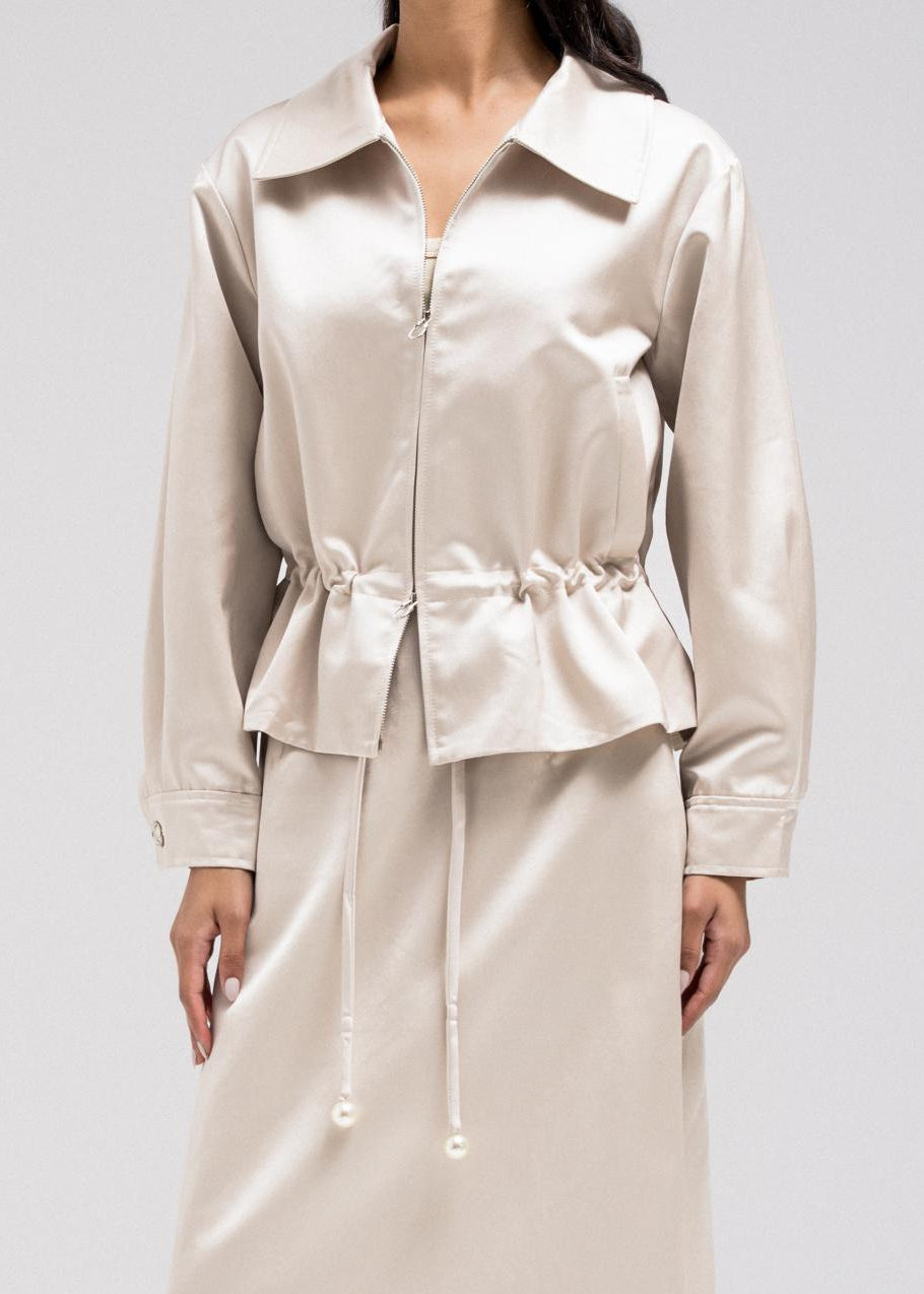 Smooth silk-like material with a soft sheen finish. Classic collar and front button closure with long sleeves. Lightweight and breathable, perfect for effortless elegant styling.