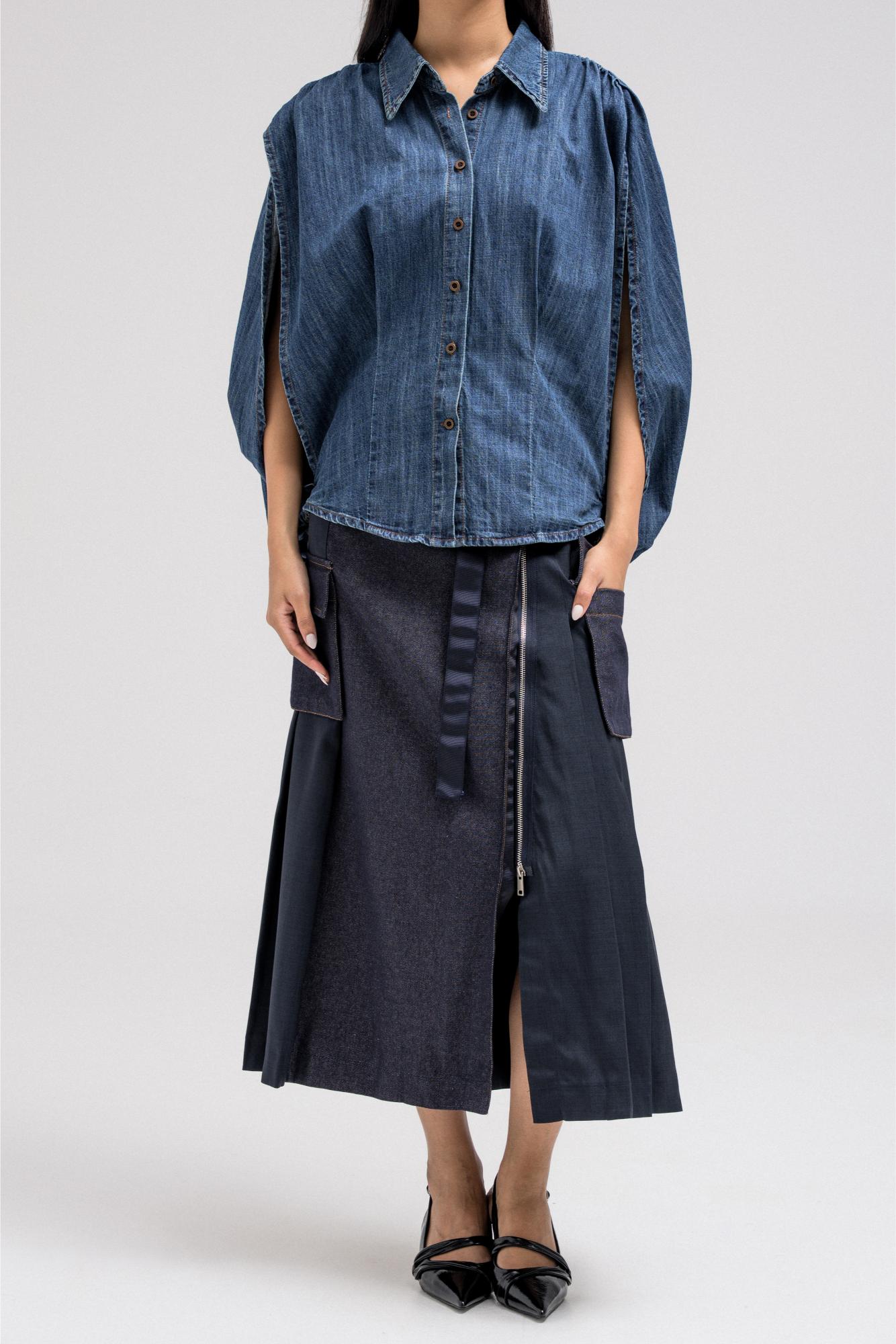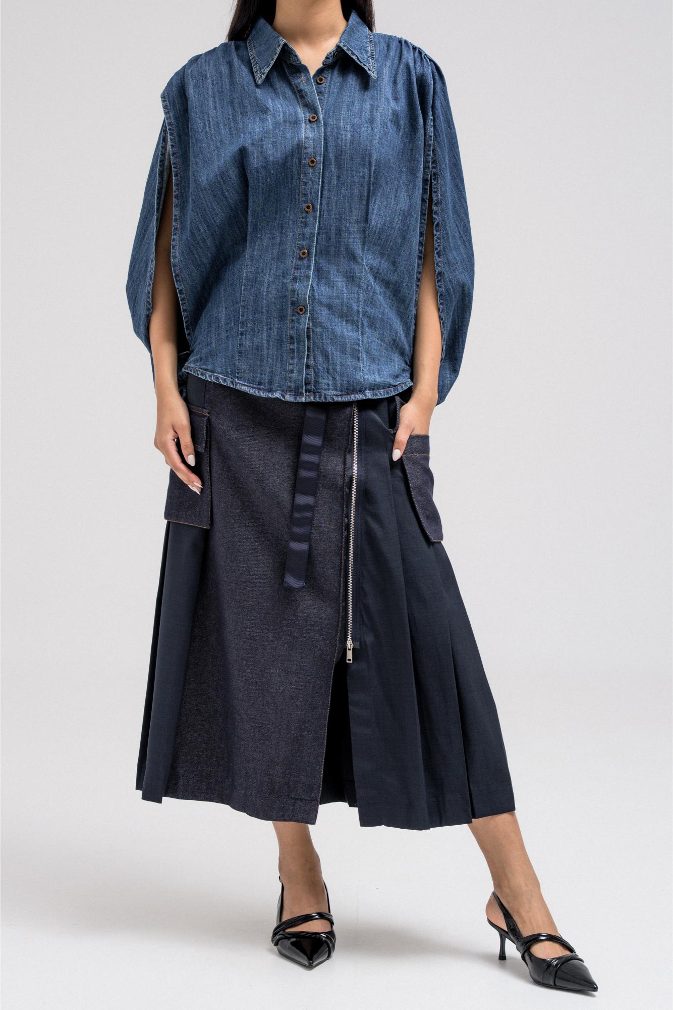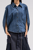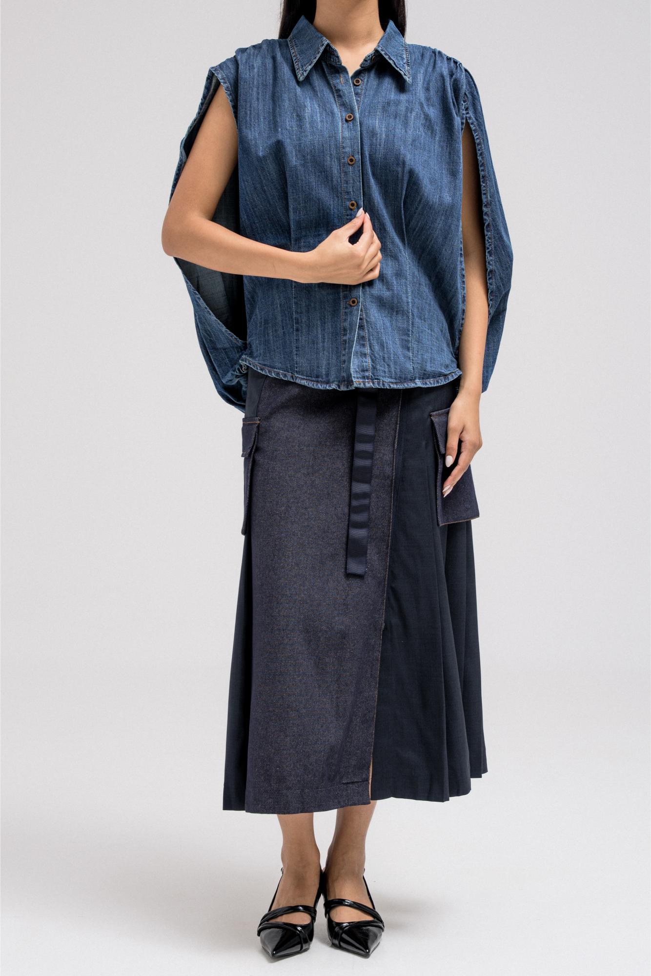 This denim top combines shirt structure with modern panel detailing. Featuring a classic collar and front button closure, the sleeveless cut and contrast side panel trims give it a layered illusion. The raw hem adds a subtle edgy touch, making it ideal for layering over basics or styling as a statement piece.