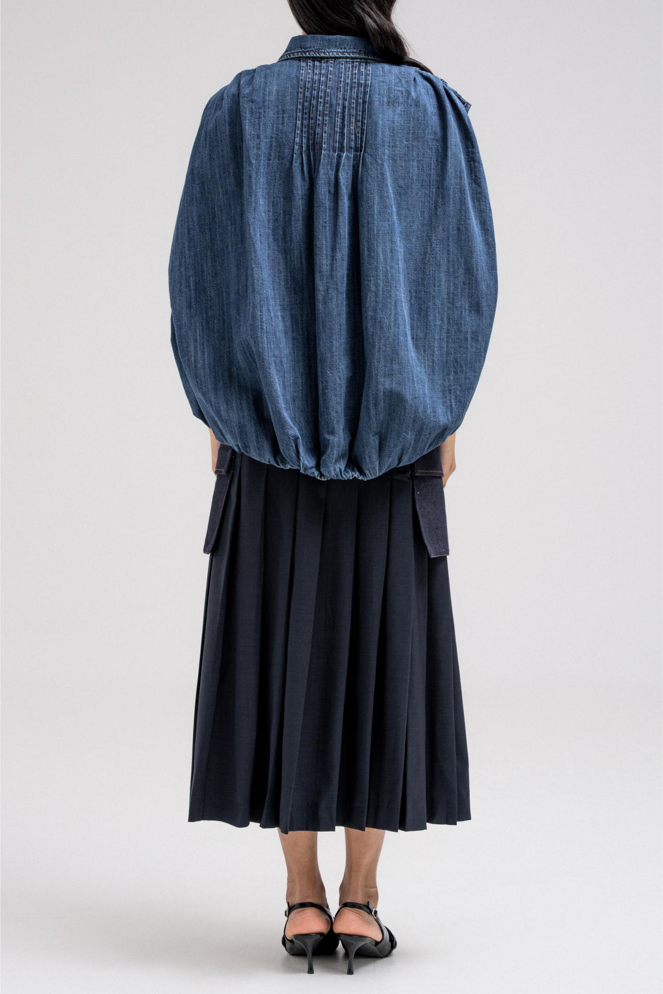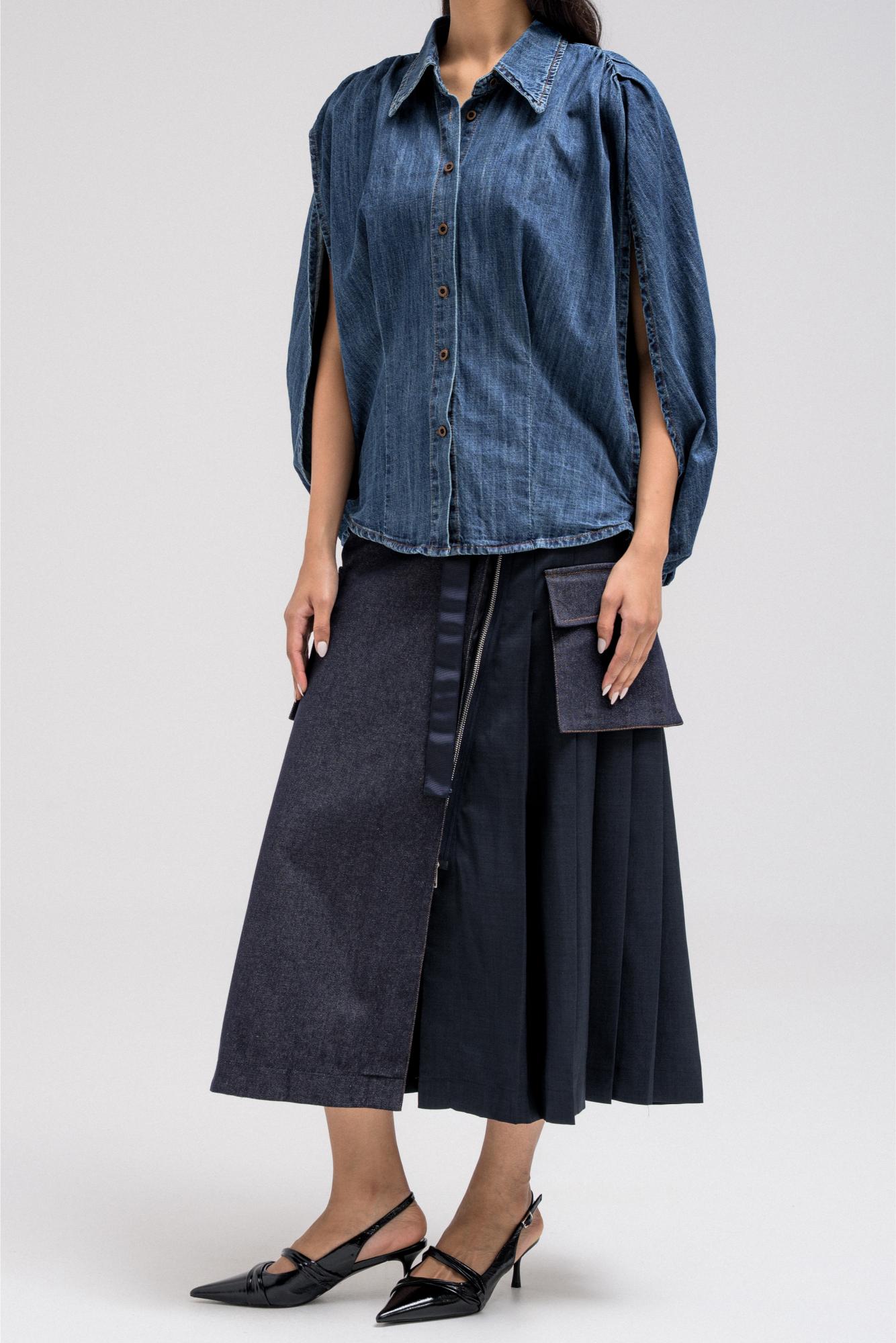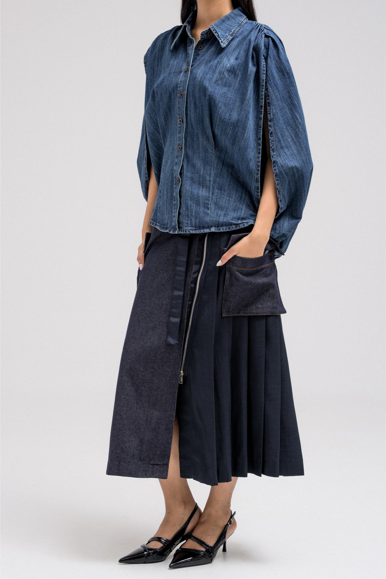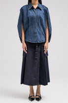 This denim top combines shirt structure with modern panel detailing. Featuring a classic collar and front button closure, the sleeveless cut and contrast side panel trims give it a layered illusion. The raw hem adds a subtle edgy touch, making it ideal for layering over basics or styling as a statement piece.