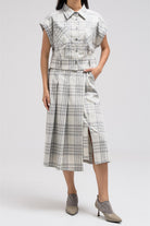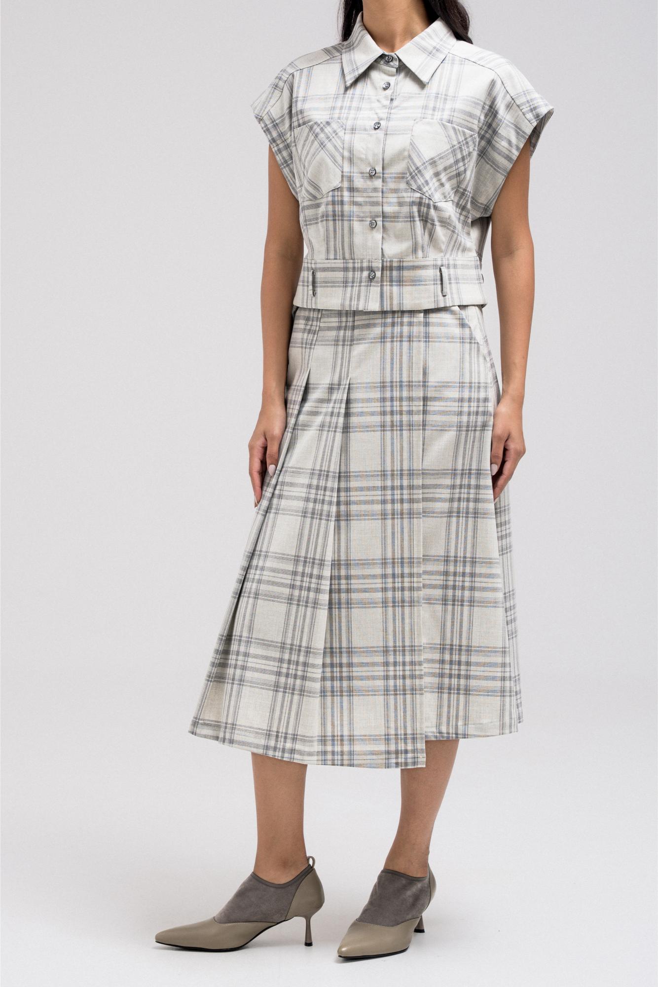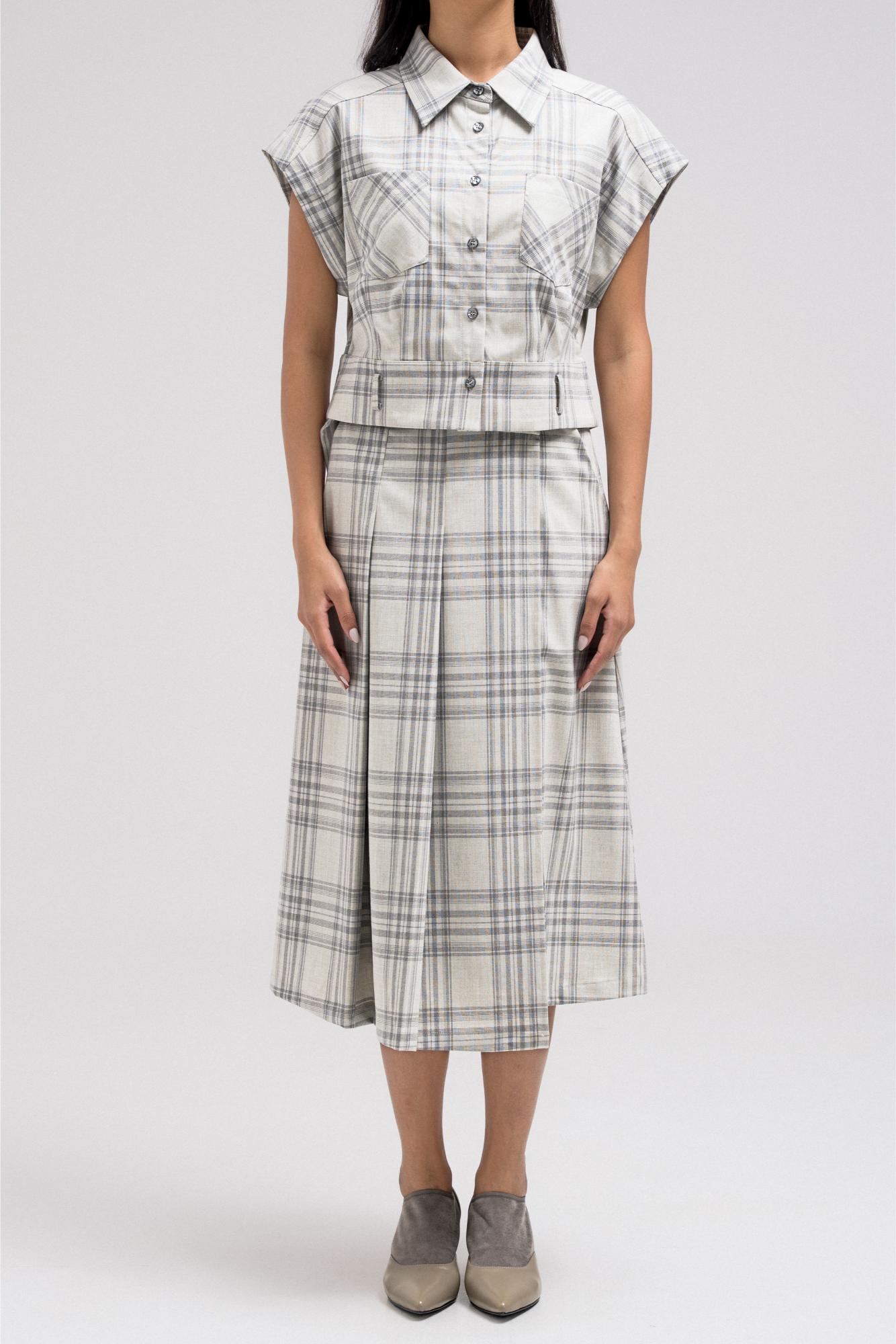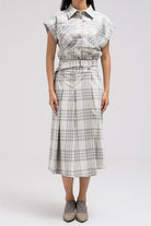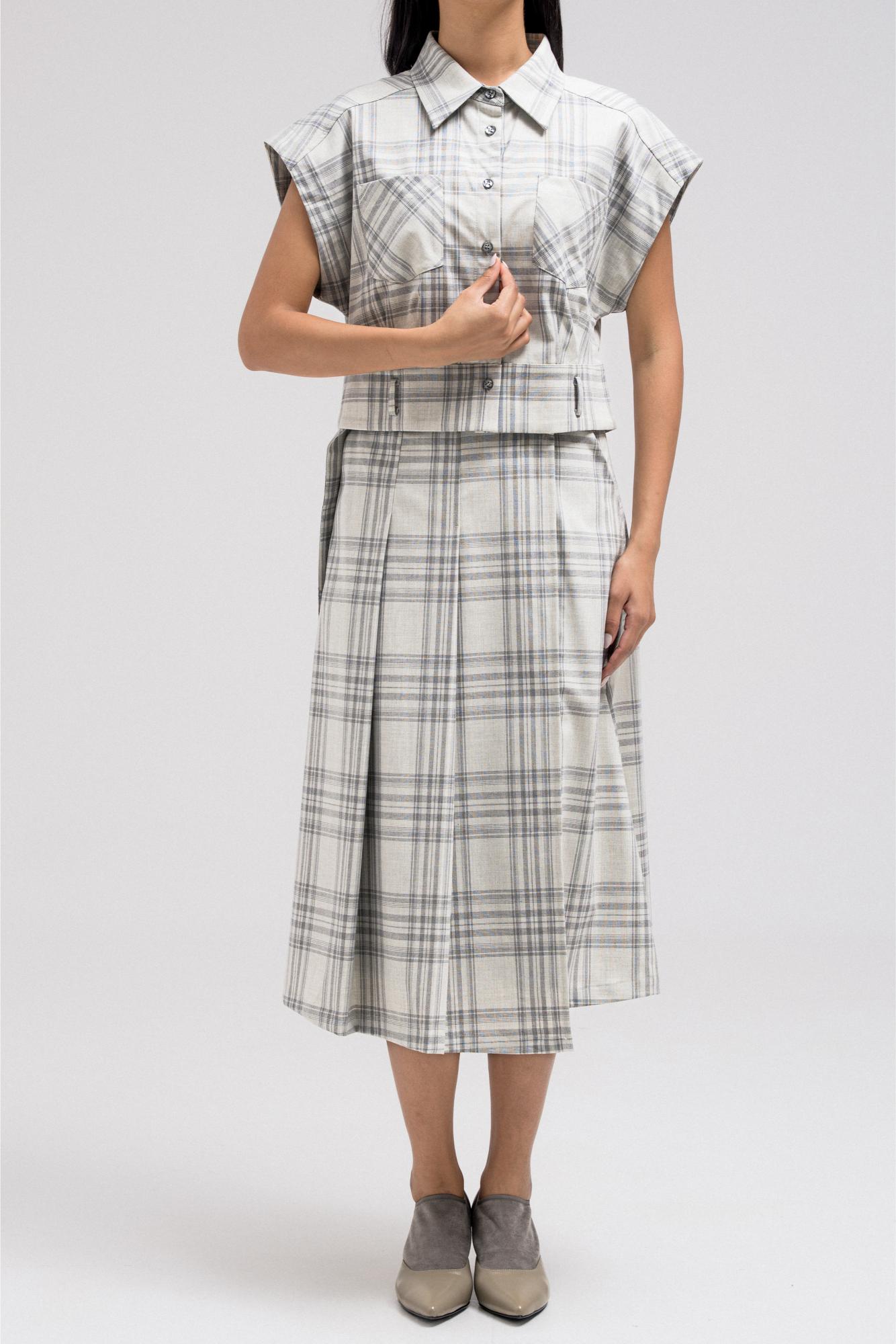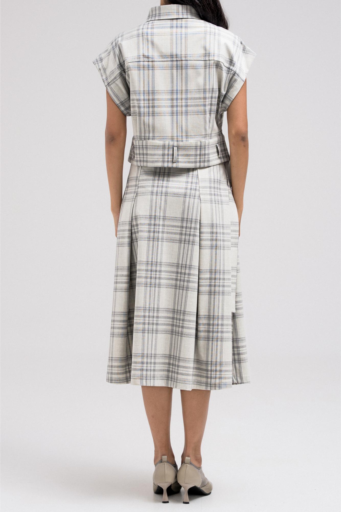 Sleeveless plaid vest featuring a structured shape with front button closure and you can add a belt at the hem. The tailored cut gives it a sharp finish, perfect for layering over shirts or styling as a statement top.