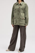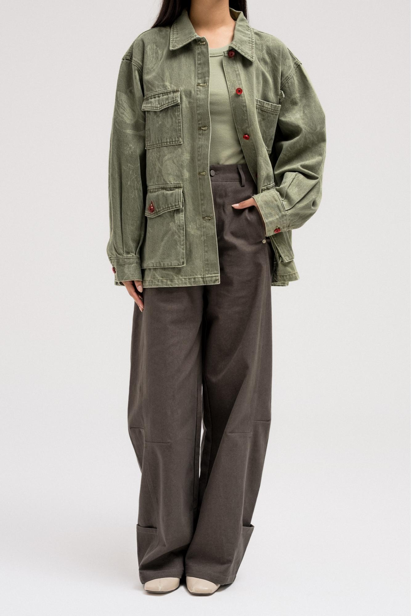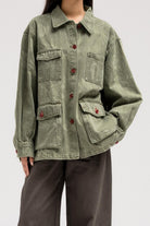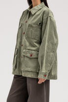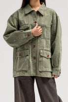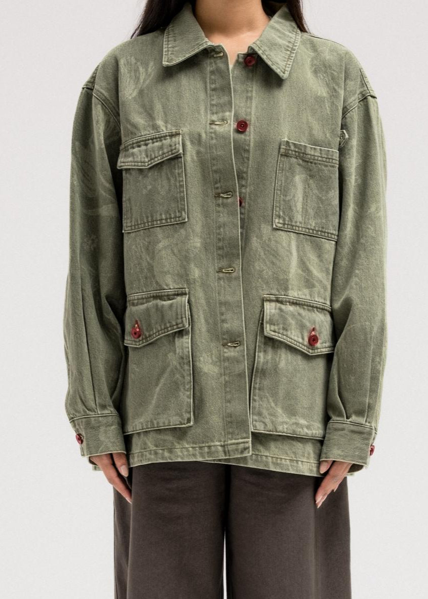 جاكيت جينز بنقشة رقيقة تغطيه بالكامل. مصمم بياقة كلاسيكية، وجيوب بغطاء على الصدر والجزء السفلي من الأمام، وأزرار أمامية حمراء جريئة تُضفي تباينًا رائعًا. قطعة متعددة الاستخدامات بتصميم أنيق وعملي في آنٍ واحد.