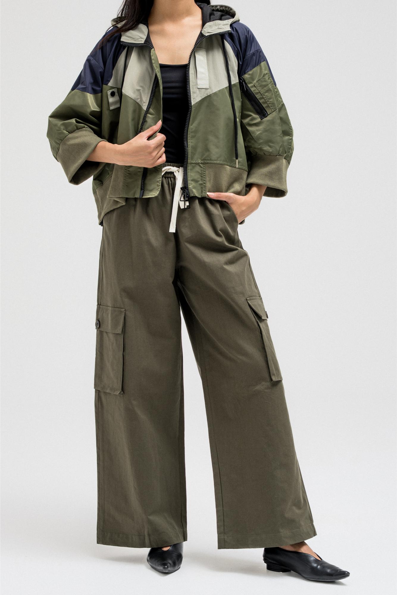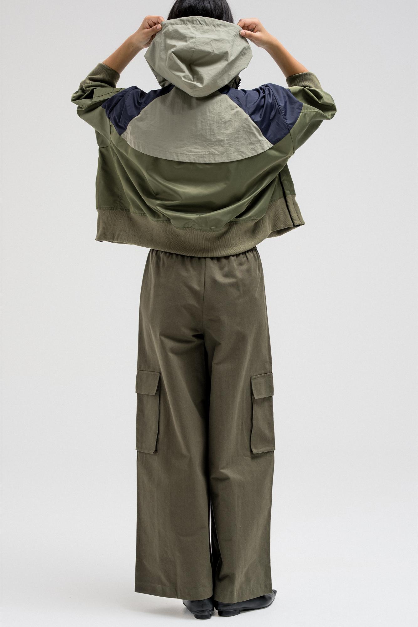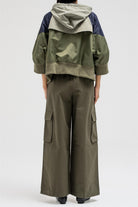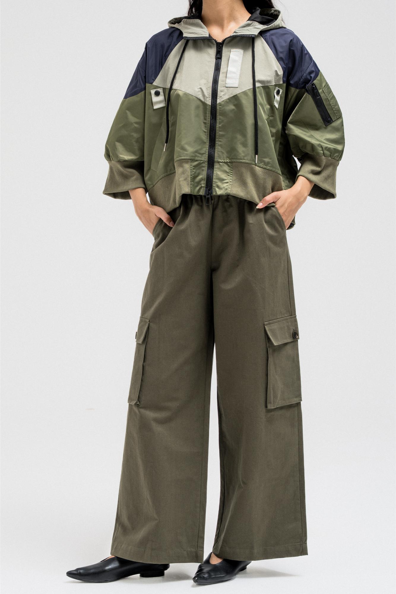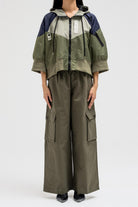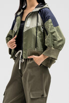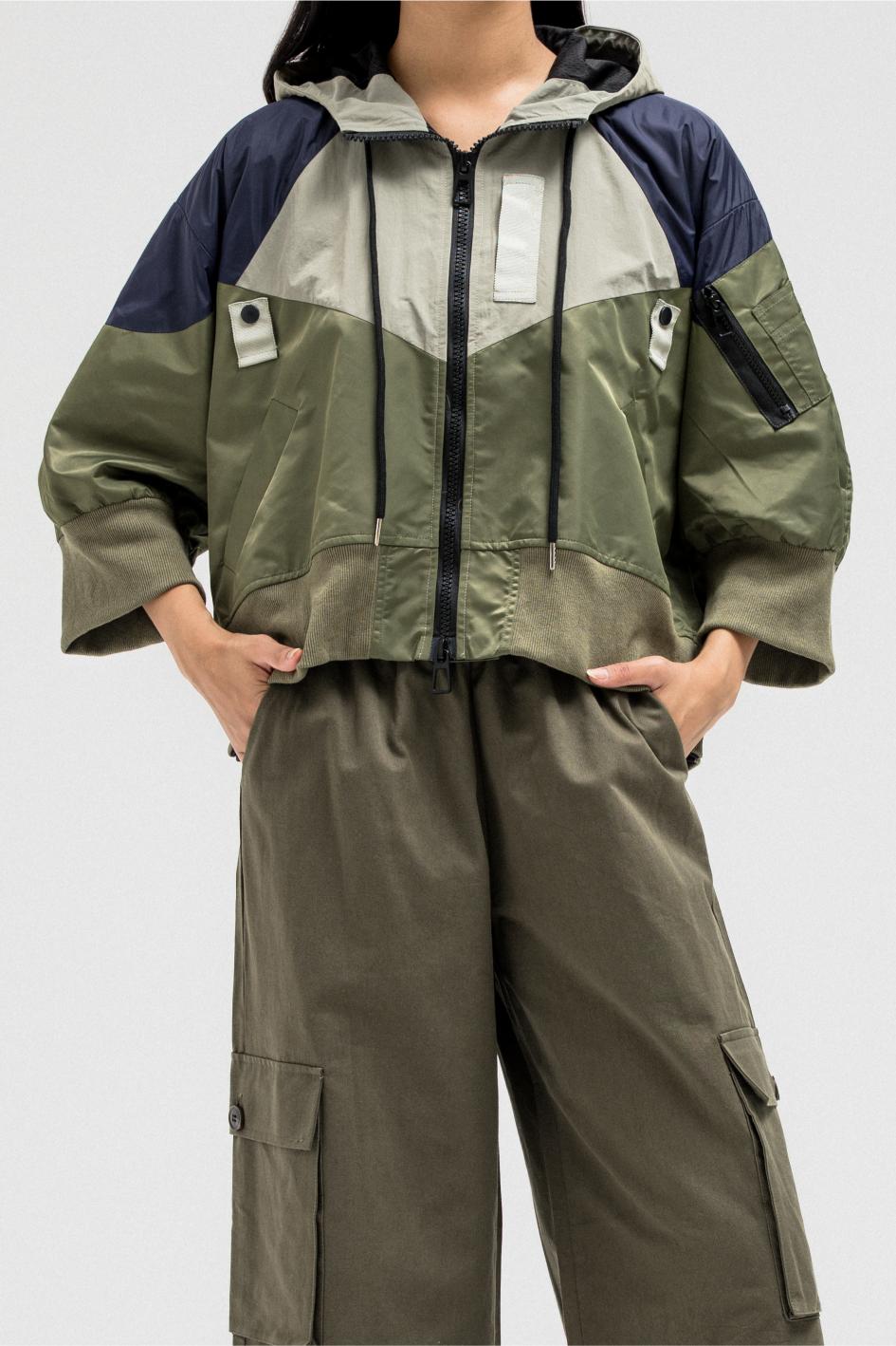 A sporty, utilitarian-inspired cropped jacket featuring a color-block patchwork design. It includes a hood at the back, front zipper closure, and multiple pockets for a functional edge. The slightly asymmetric elastic hem adds shape and versatility, making it perfect for casual and streetwear looks.