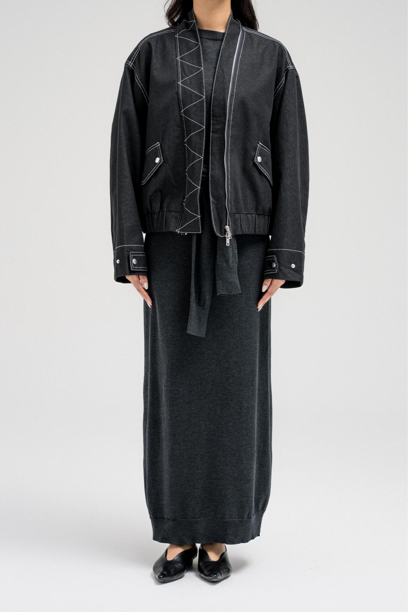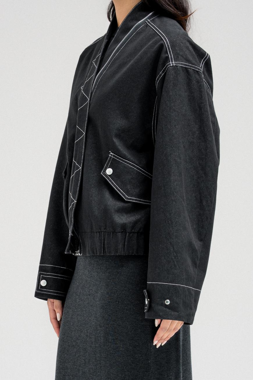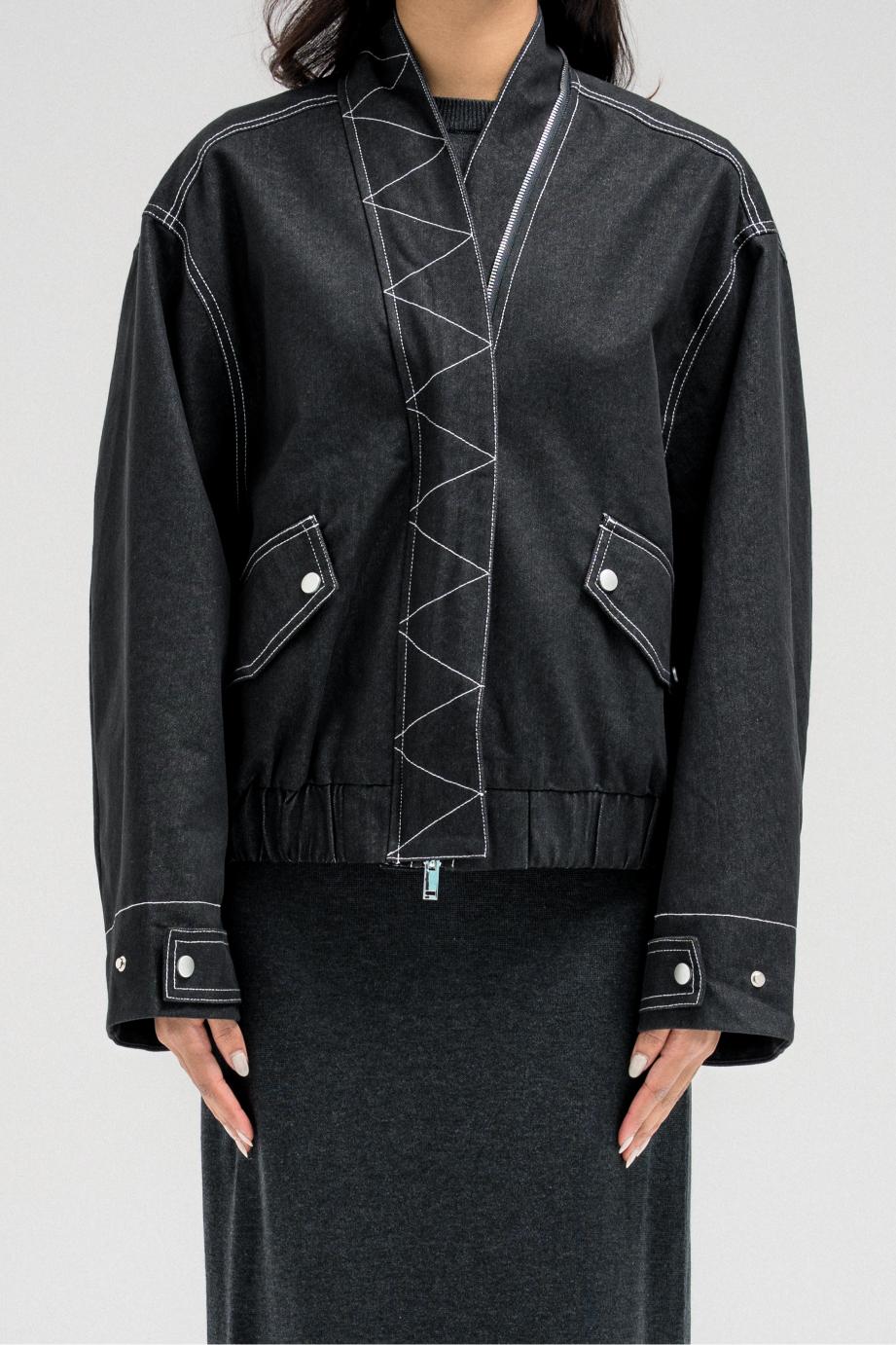 جاكيت بومبر بخياطة جريئة متباينة الألوان على طول الدرزات والجيوب. تصميم مفتوح من الأمام، وأزرار كبس، وجيوب بغطاء، وحاشية مرنة لملاءمة منظمة.