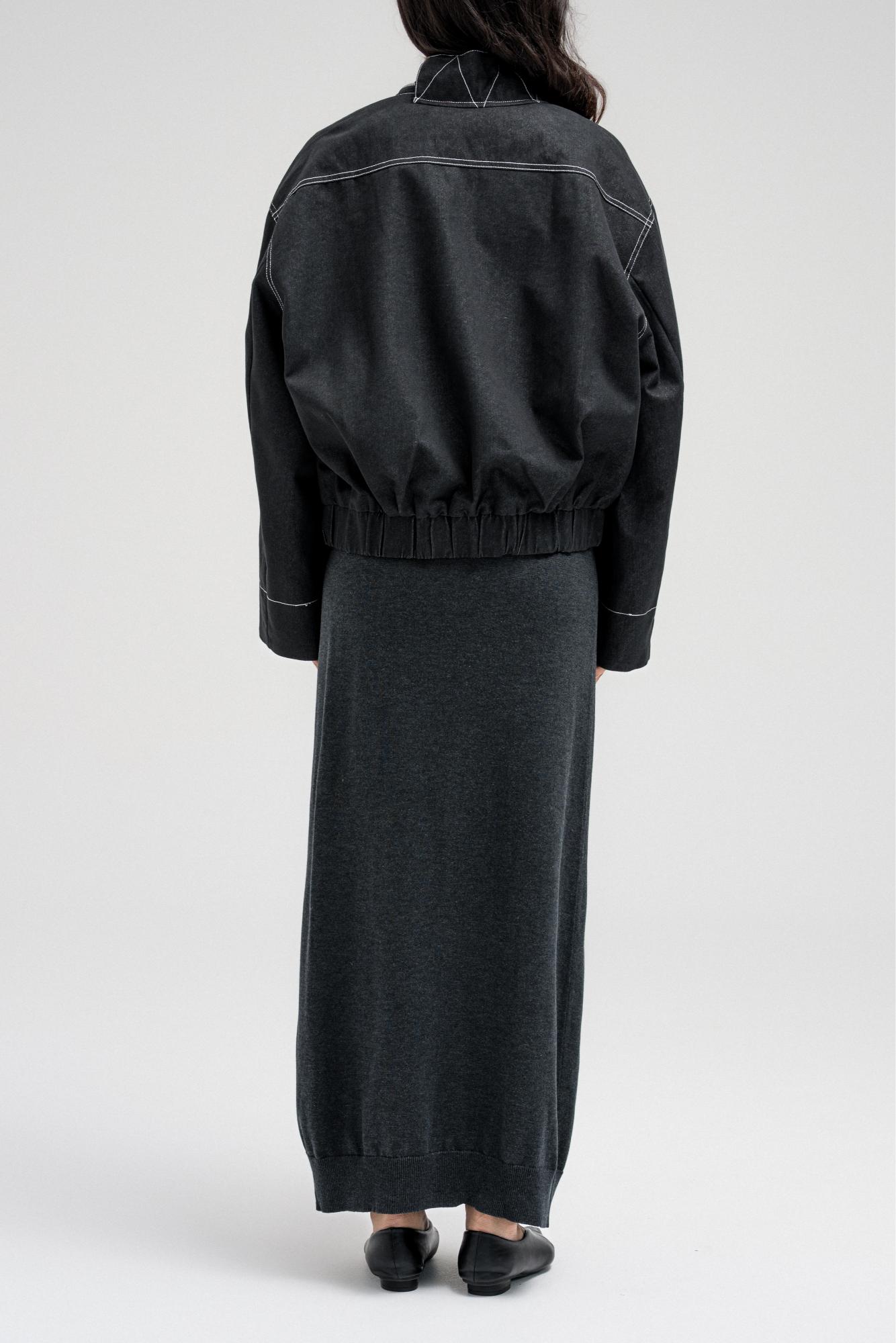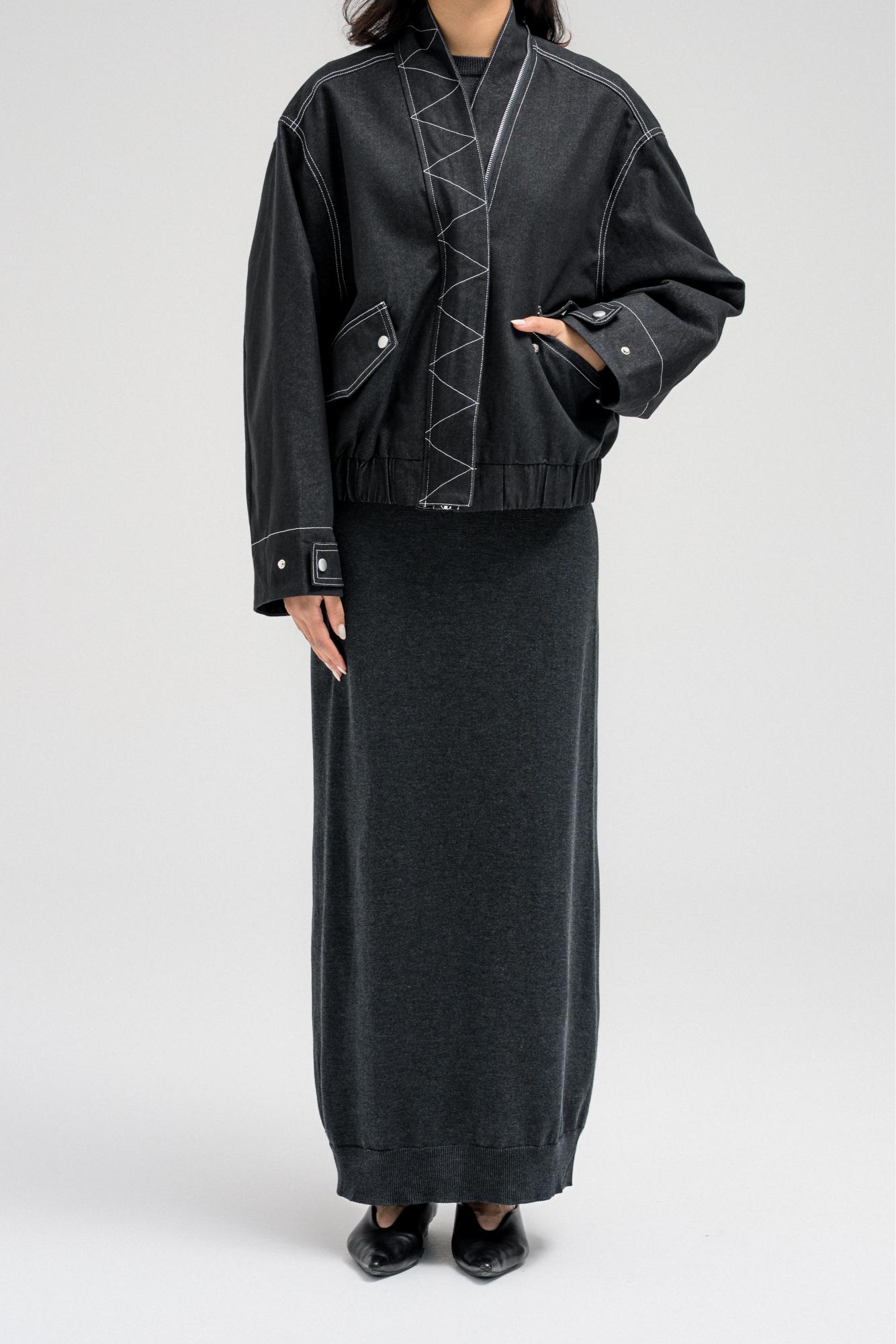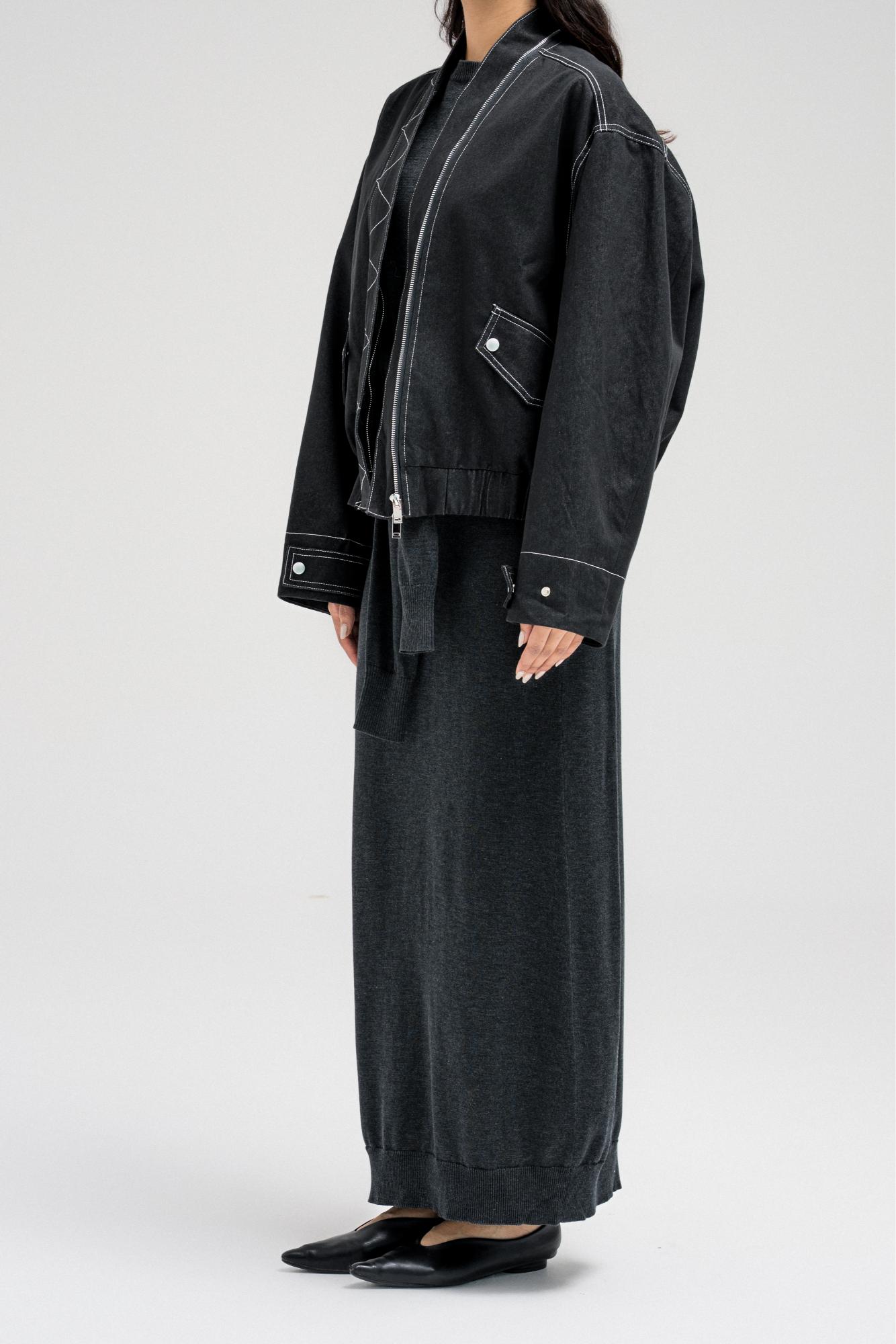 جاكيت بومبر بخياطة جريئة متباينة الألوان على طول الدرزات والجيوب. تصميم مفتوح من الأمام، وأزرار كبس، وجيوب بغطاء، وحاشية مرنة لملاءمة منظمة.