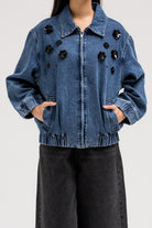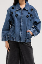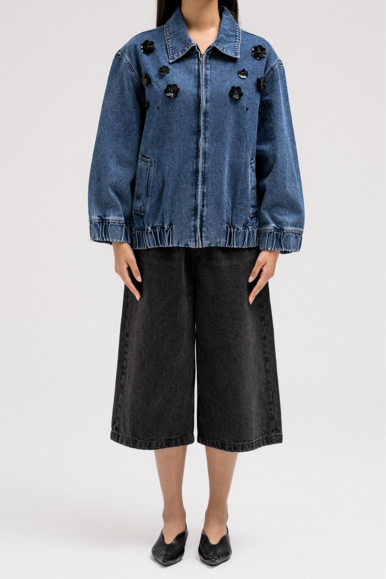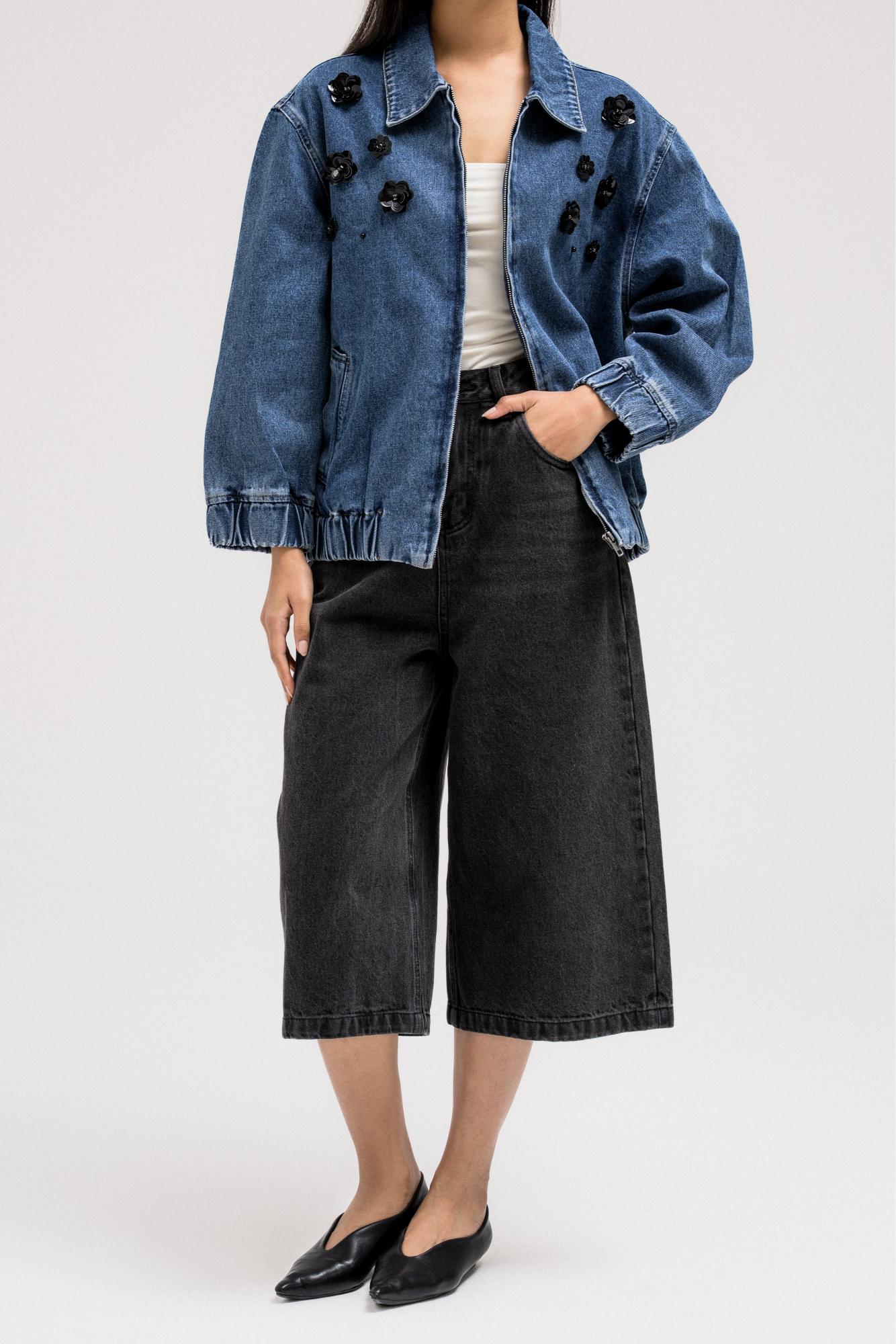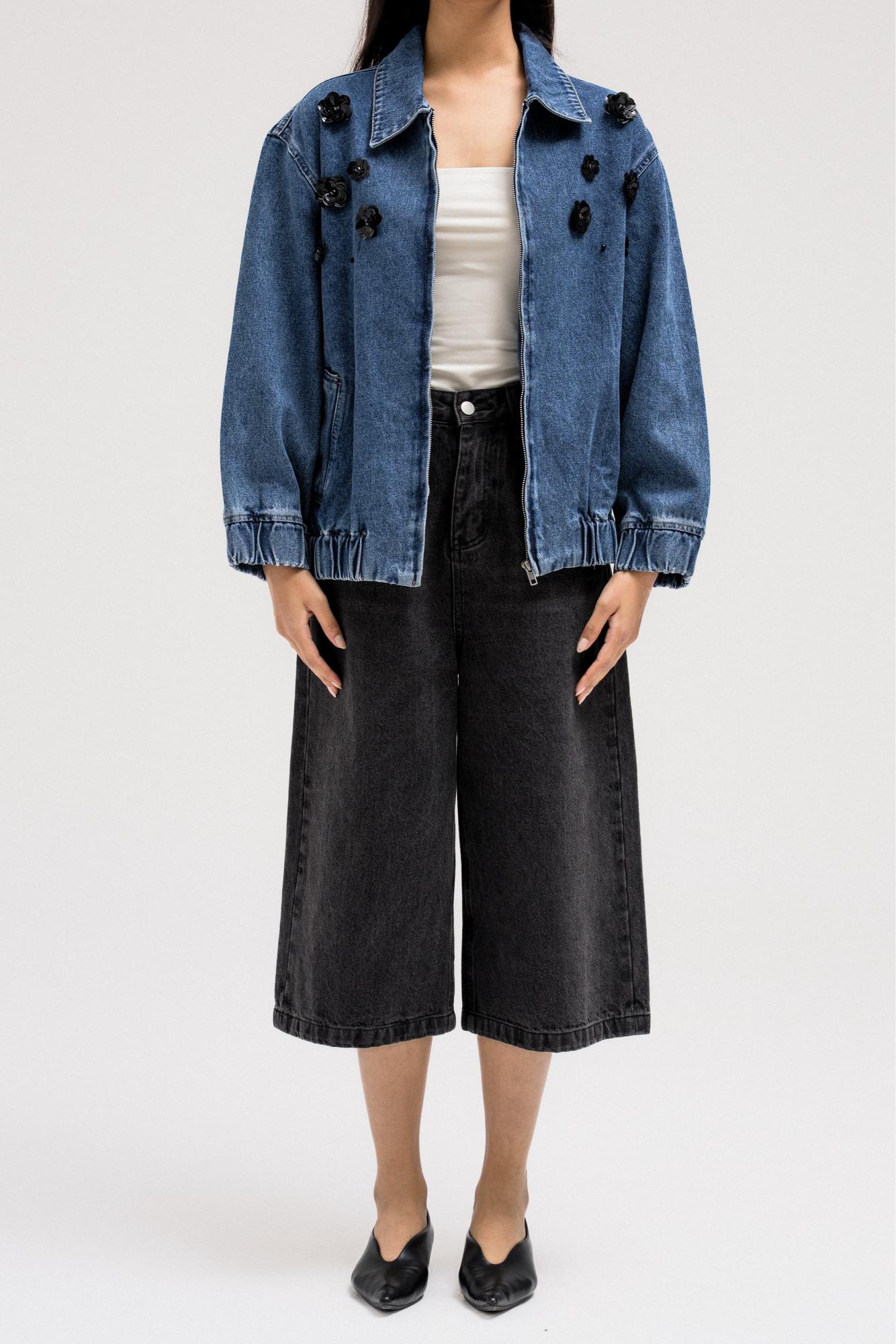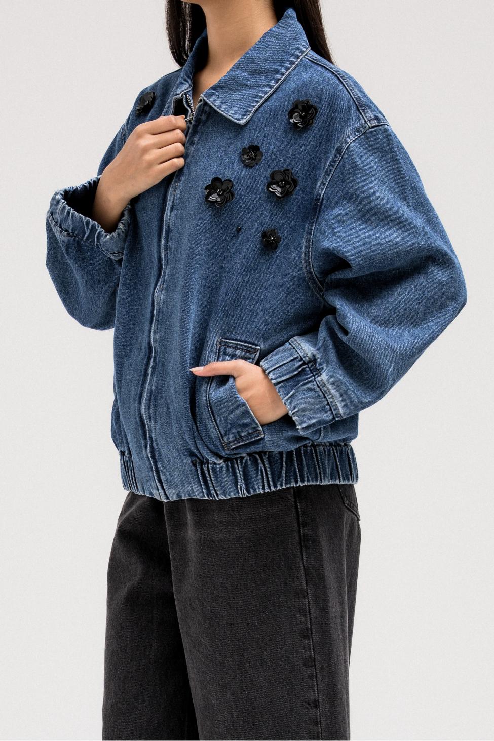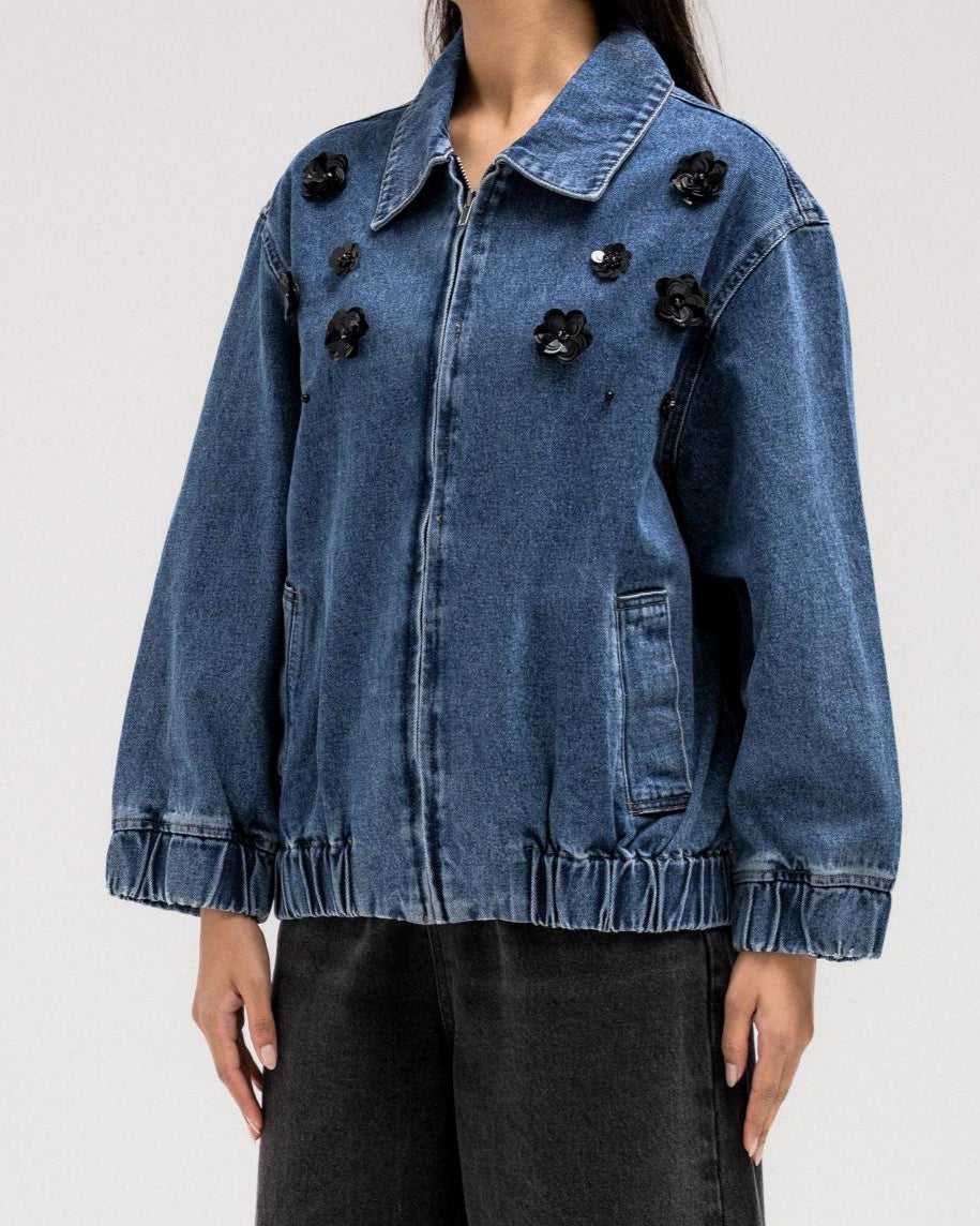 جاكيت جينز أسود بتطريز زهور لامعة على الجهة الأمامية لإضفاء لمسة أنثوية جريئة. مصمم بياقة كلاسيكية بأزرار جانبية وسحاب أمامي للإغلاق. حافة الجاكيت مزينة بشريط مطاطي لملاءمة محكمة.