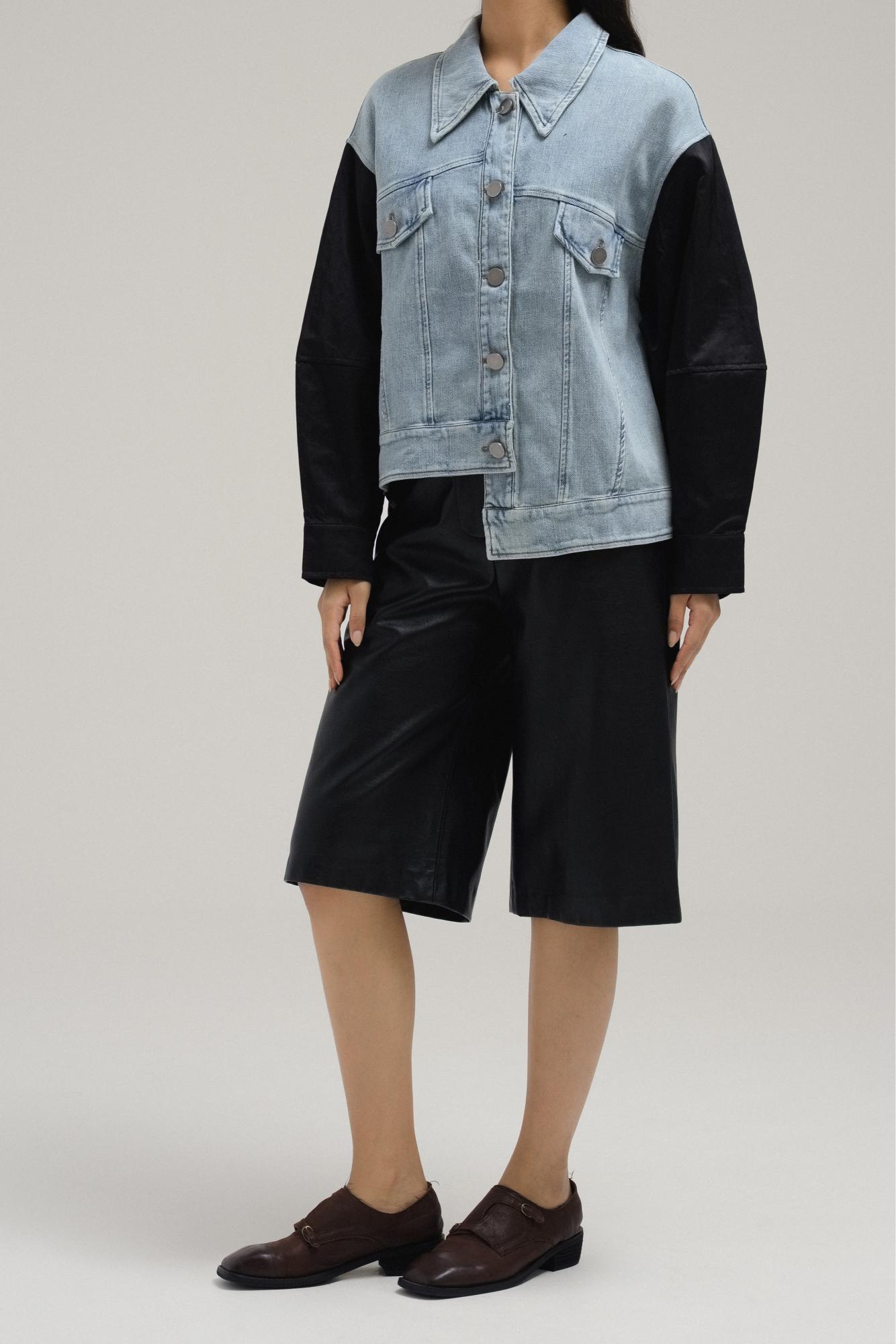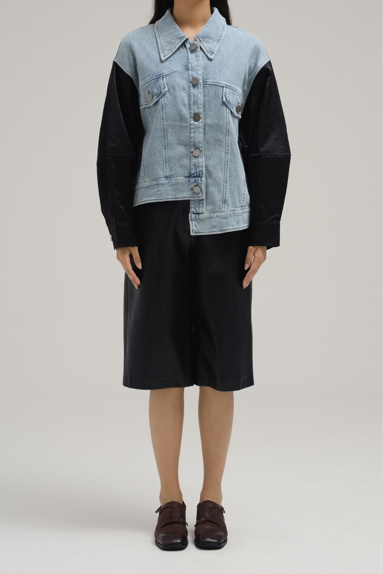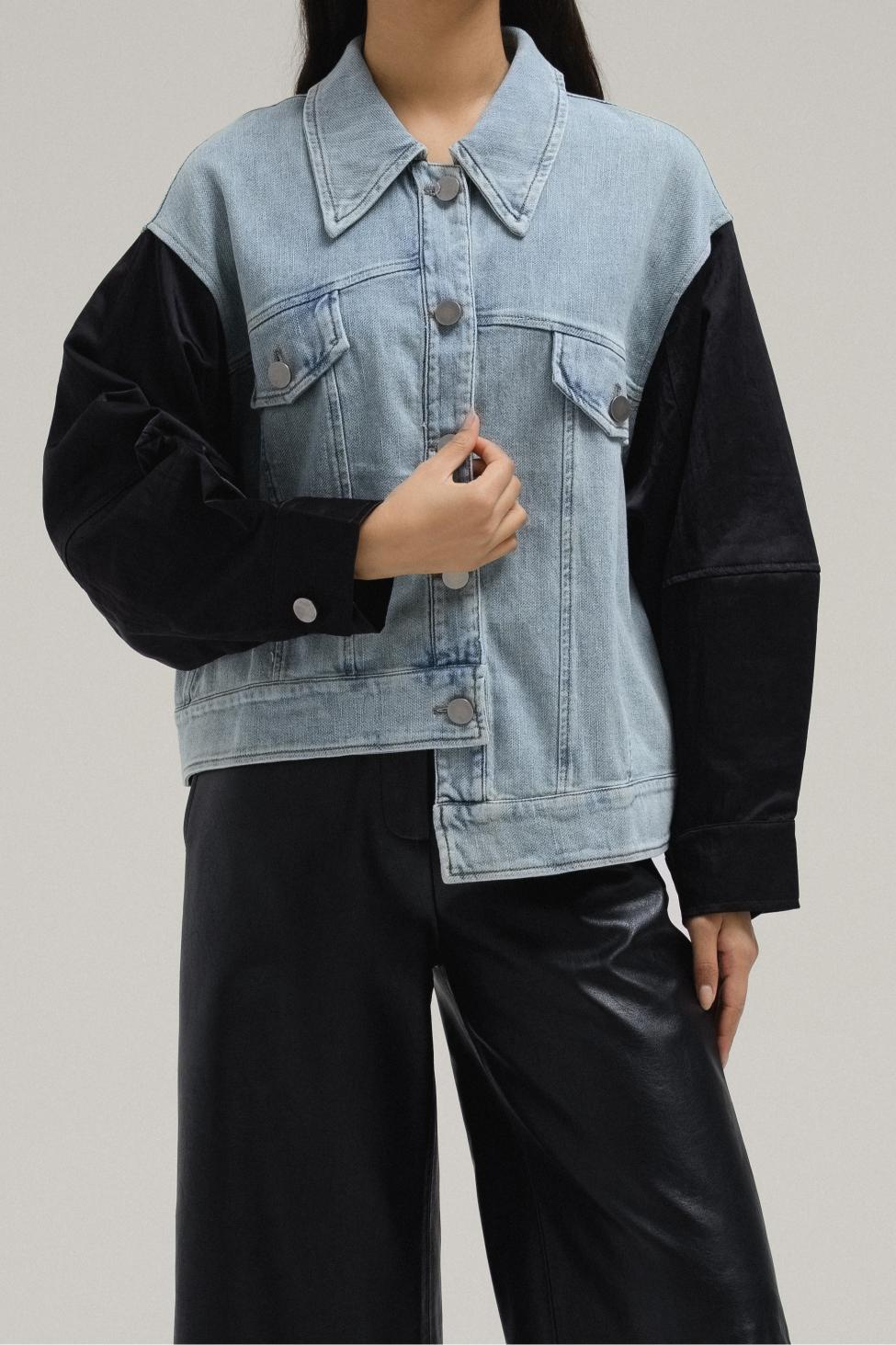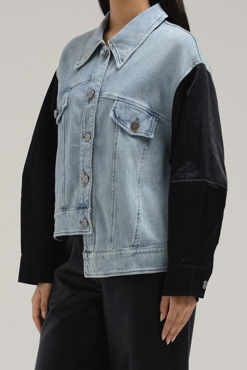 يمزج هذا الجاكيت بين أسلوبين كلاسيكيين في قطعة واحدة جريئة. صُنع الجسم من قماش الدنيم الناعم، مع ياقة كلاسيكية، وإغلاق بأزرار أمامية، وجيوب صدرية بغطاء، بينما تتخذ الأكمام تصميم جاكيت بومبر لتباين رياضي وواسع.
