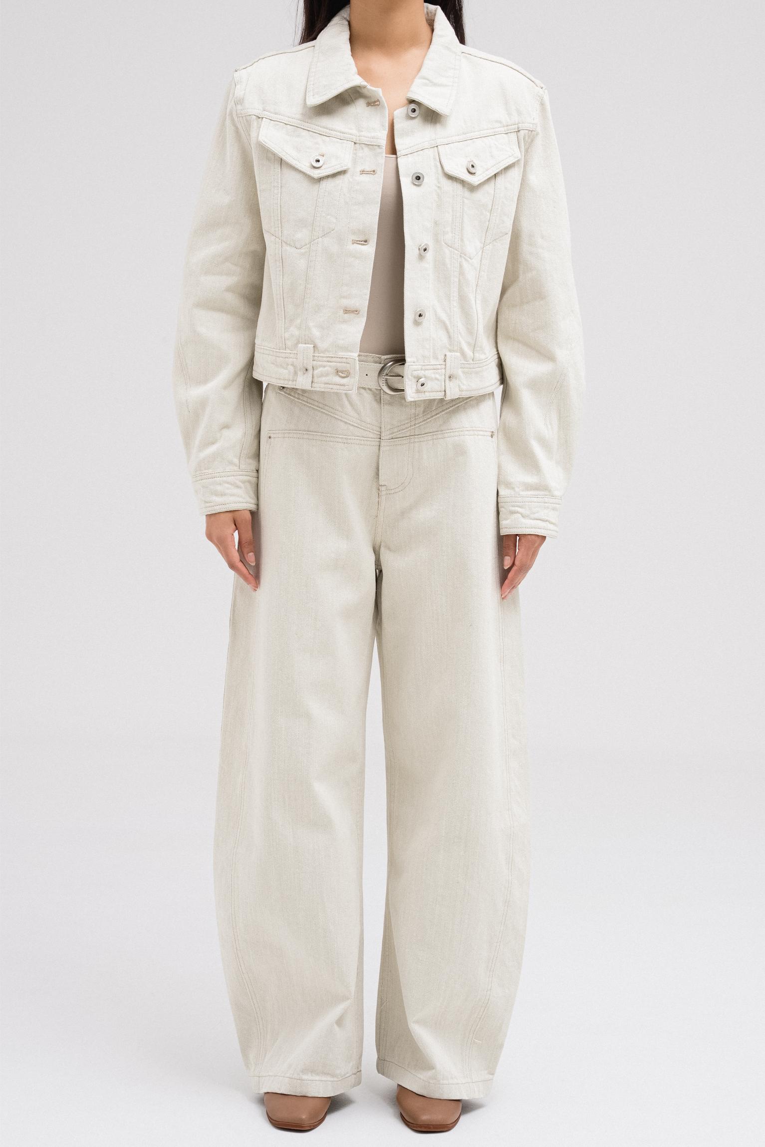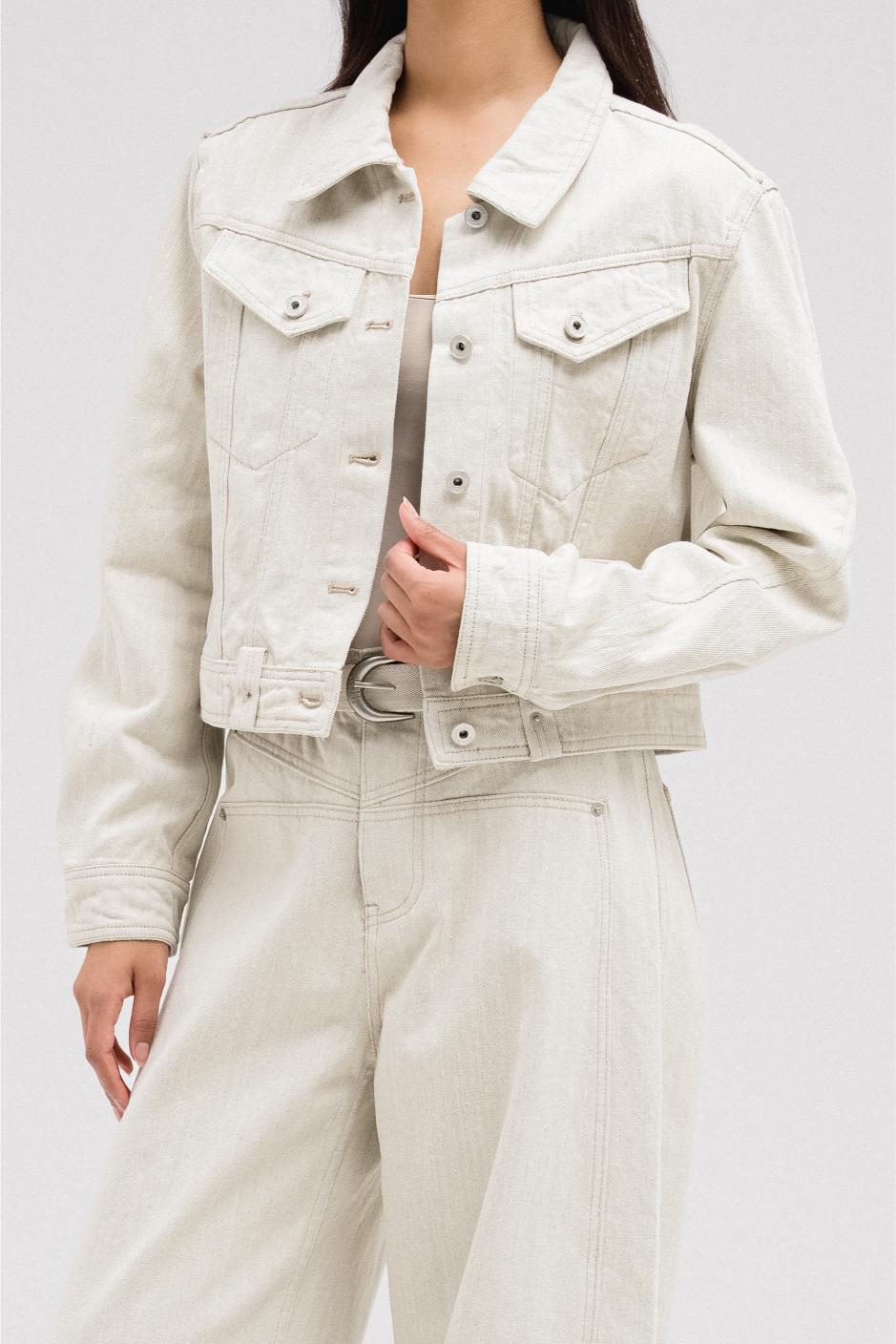 جاكيت جينز قصير يتميز بياقة منظمة، وأزرار أمامية معدنية، وجيوب على الصدر بأزرار مطابقة. أكمام طويلة بأزرار عند الأكمام. يمكن تنسيقه مع بنطال جينز مطابق لإطلالة أكثر تناسقًا.