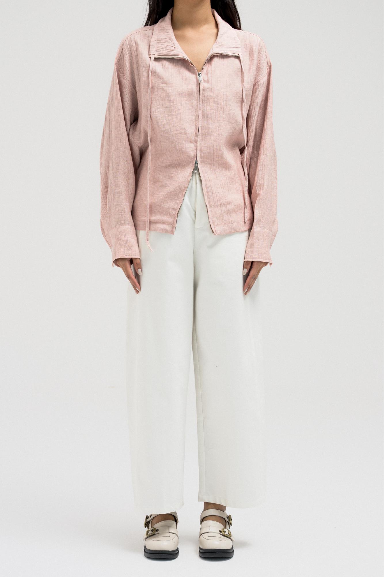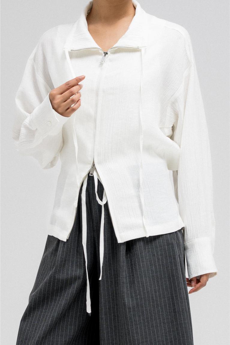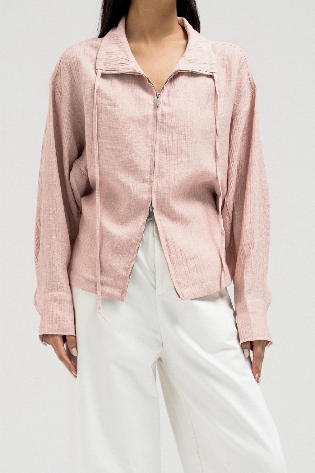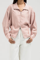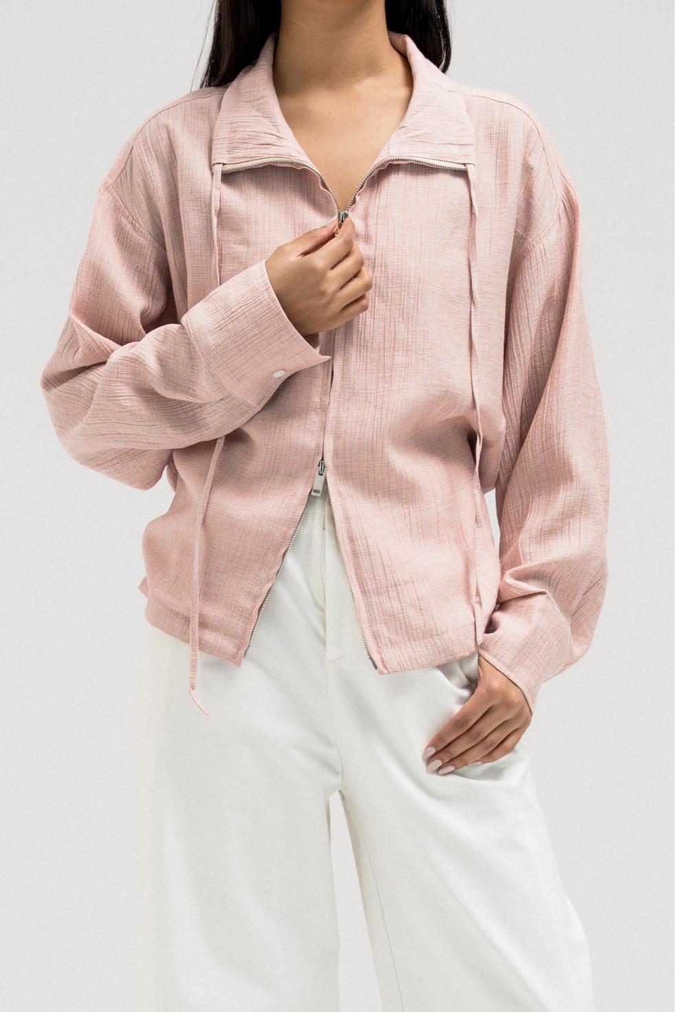 جاكيت خفيف الوزن يتميز بخصر مشدود من الأمام وتصميم خلفي مريح يشبه الثنيات. مزود بسحاب أمامي وتفاصيل رباط قابلة للتعديل عند الياقة لإضفاء لمسة أنيقة.