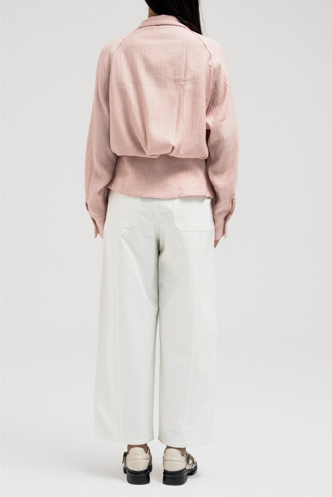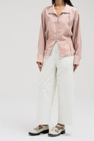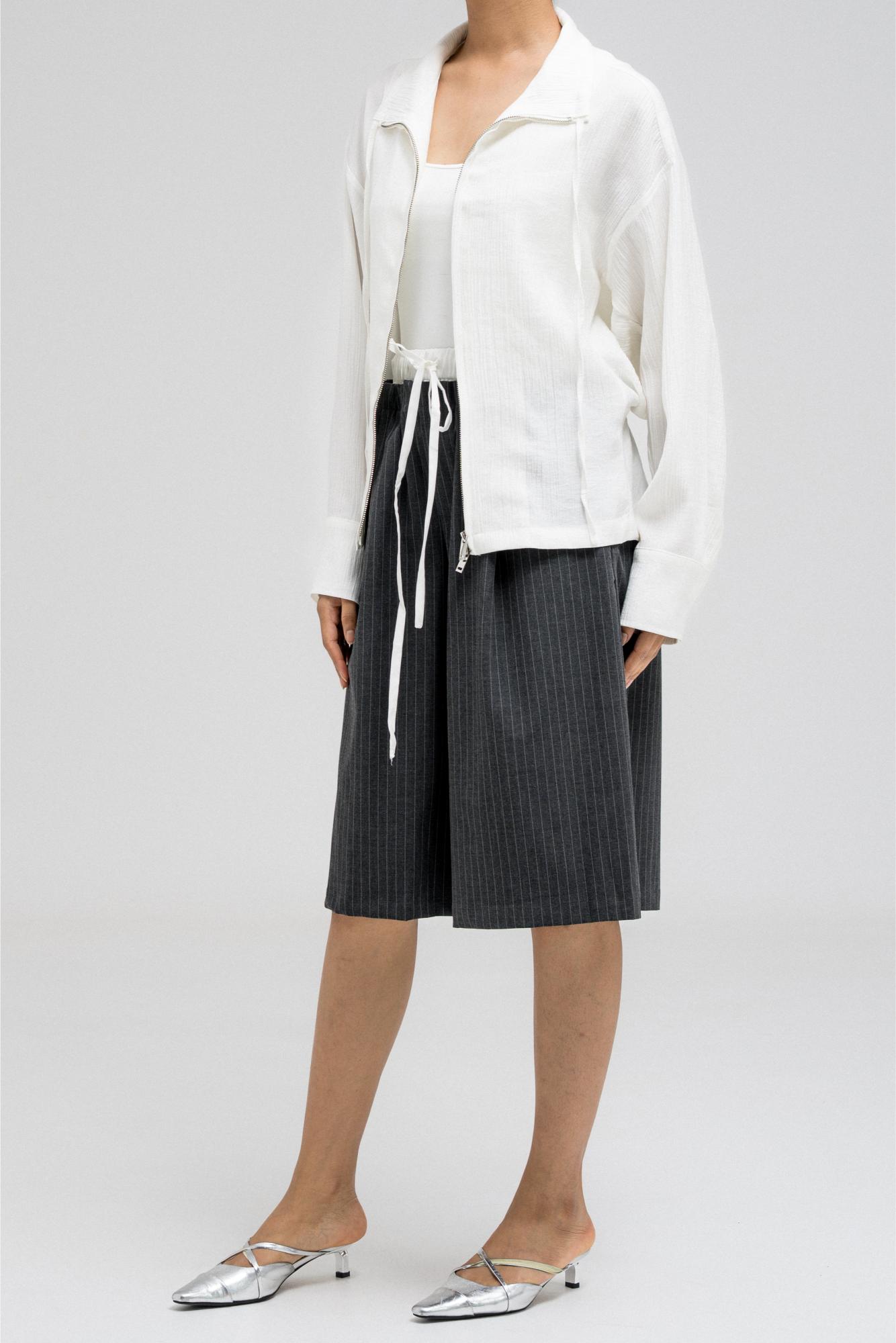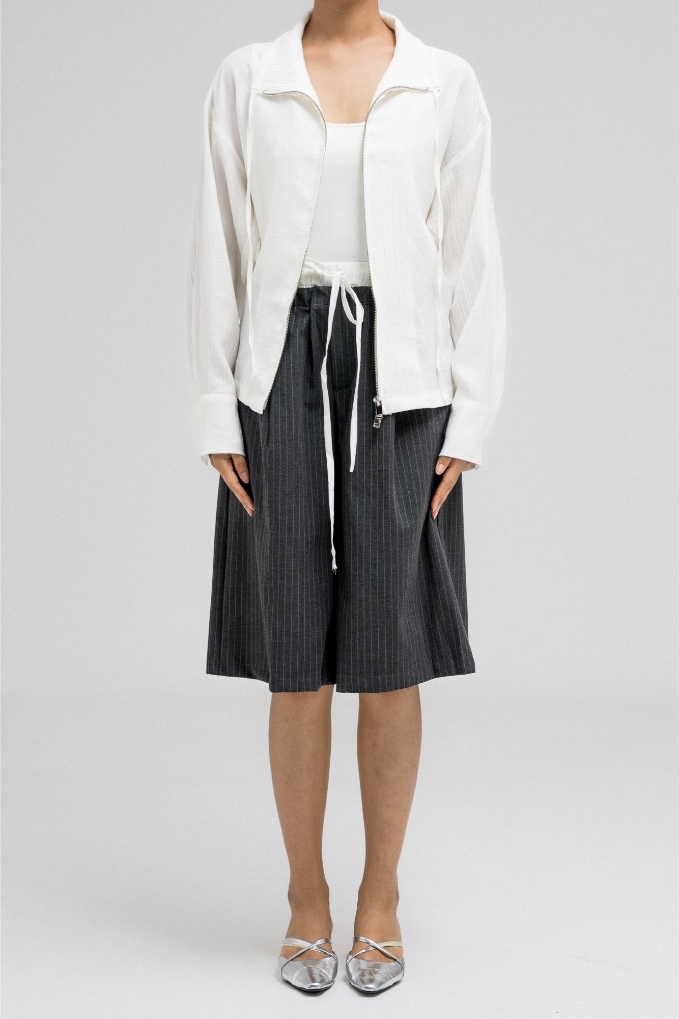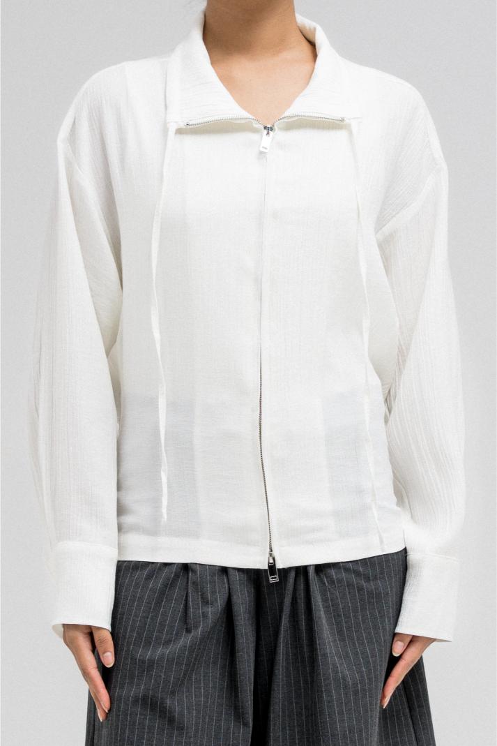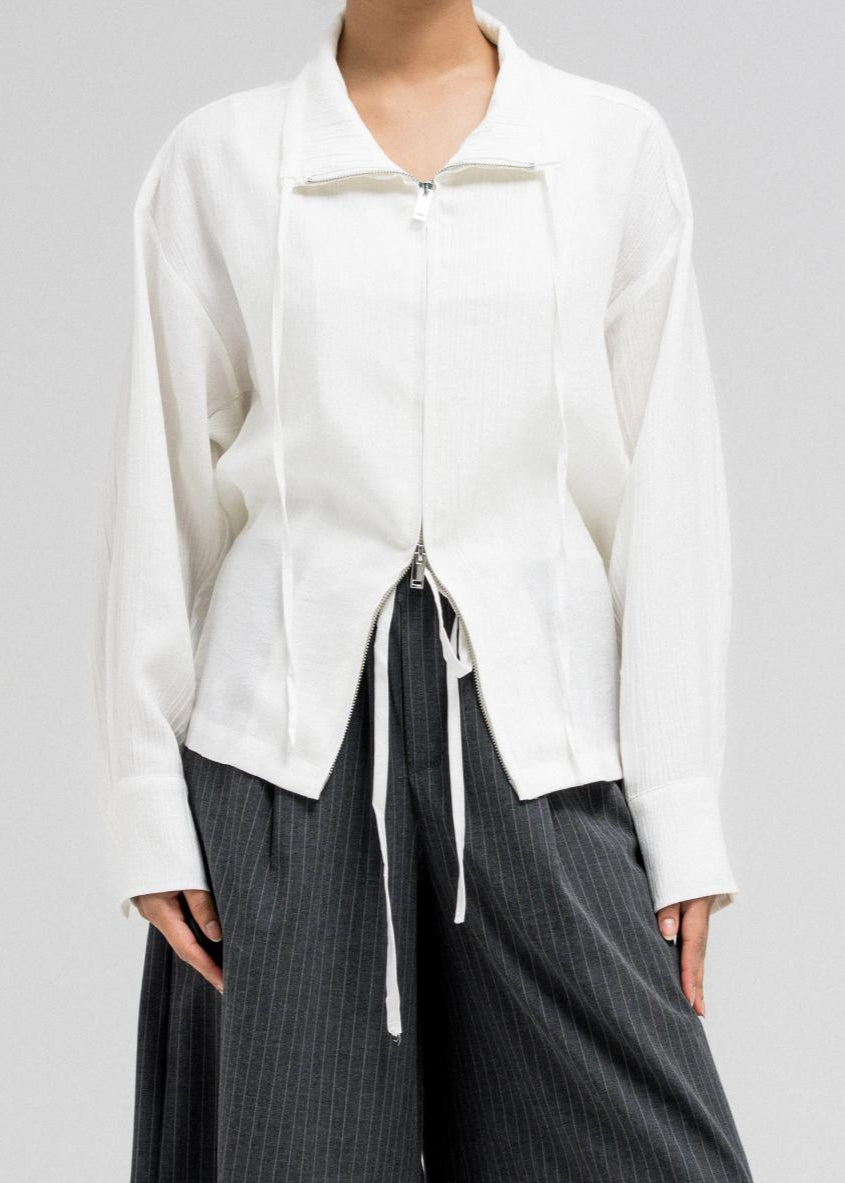 جاكيت خفيف الوزن يتميز بخصر مشدود من الأمام وتصميم خلفي مريح يشبه الثنيات. مزود بسحاب أمامي وتفاصيل رباط قابلة للتعديل عند الياقة لإضفاء لمسة أنيقة.