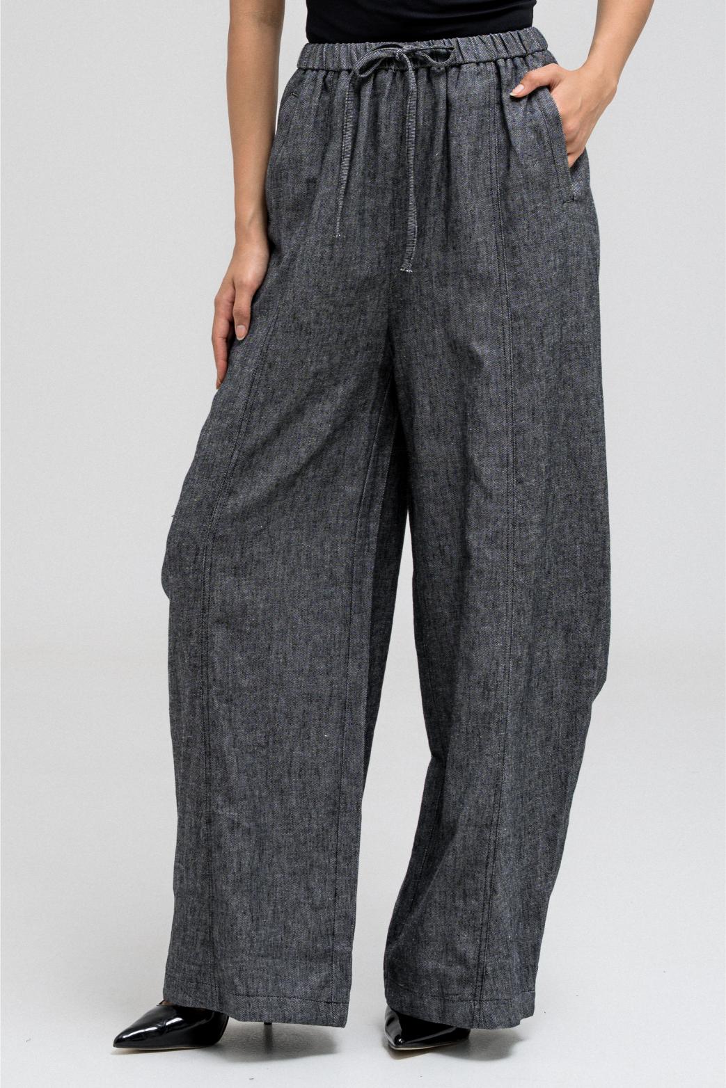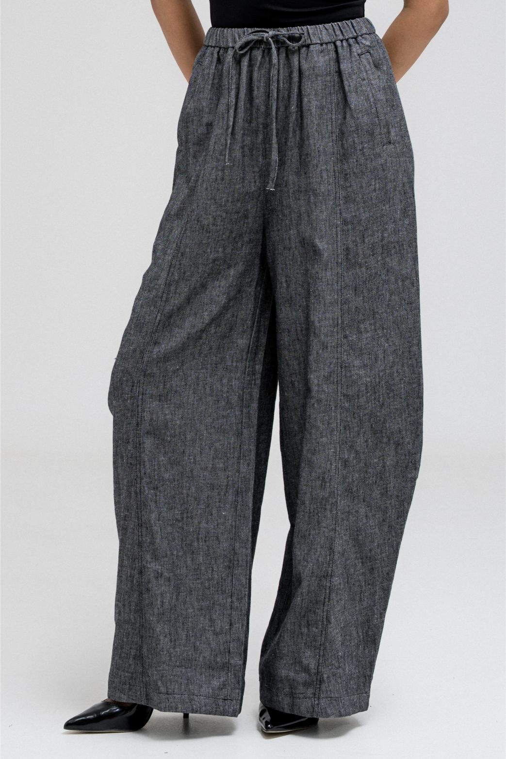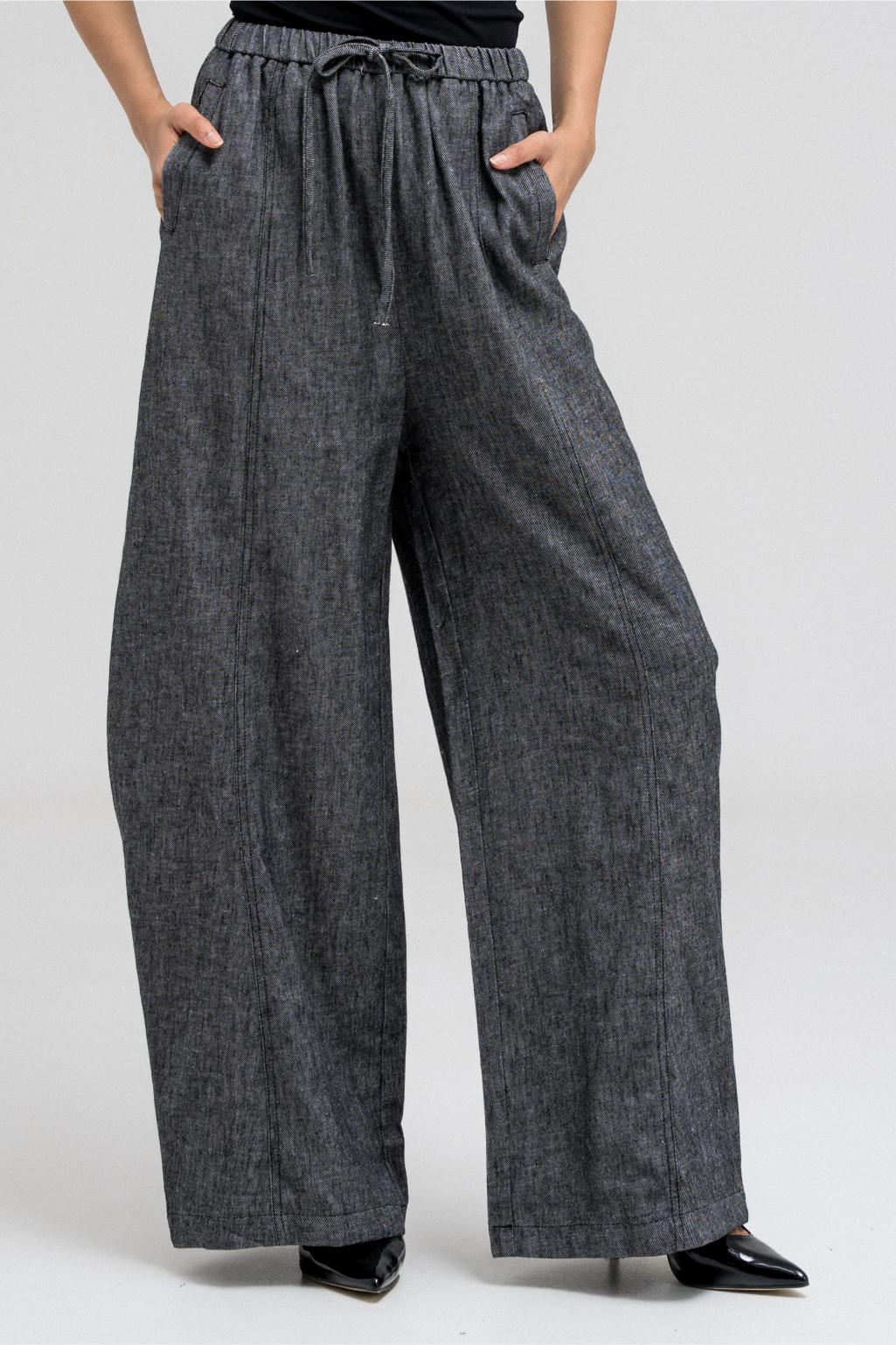 بنطال واسع الساق يتميز بقصّة مريحة وفضفاضة. يأتي بحزام خصر مطاطي وأربطة أمامية قابلة للتعديل لملاءمة مرنة. يحتوي على جيبين جانبيين، ويتناسب تمامًا مع قميص القميص المطابق لإطلالة مريحة وكاملة.