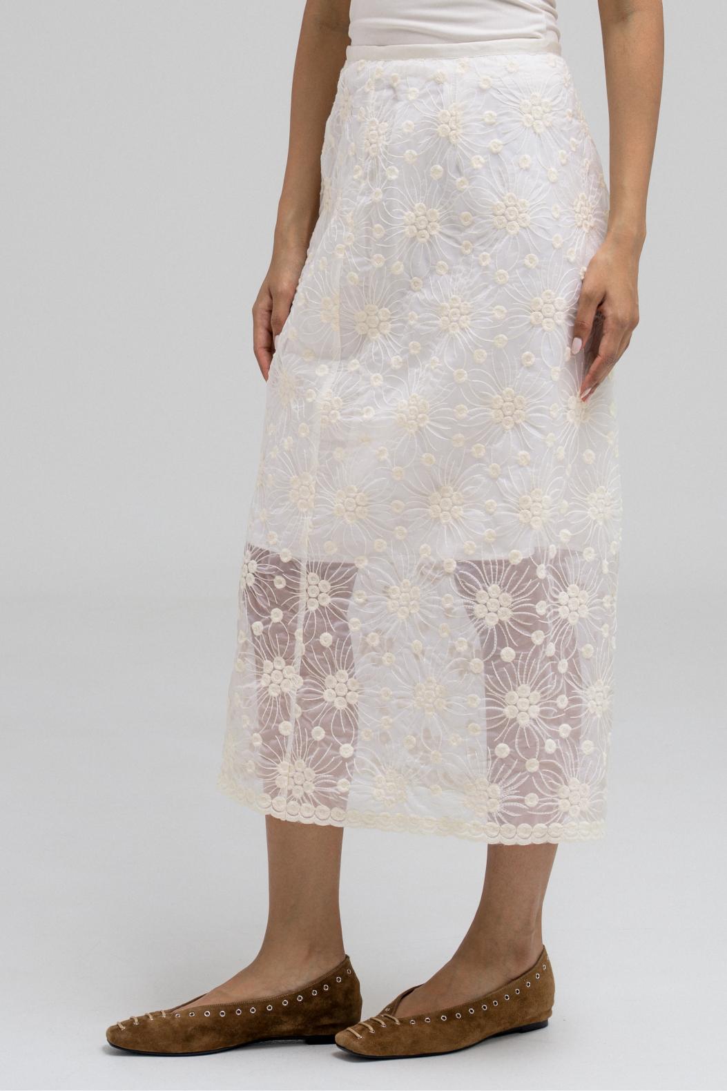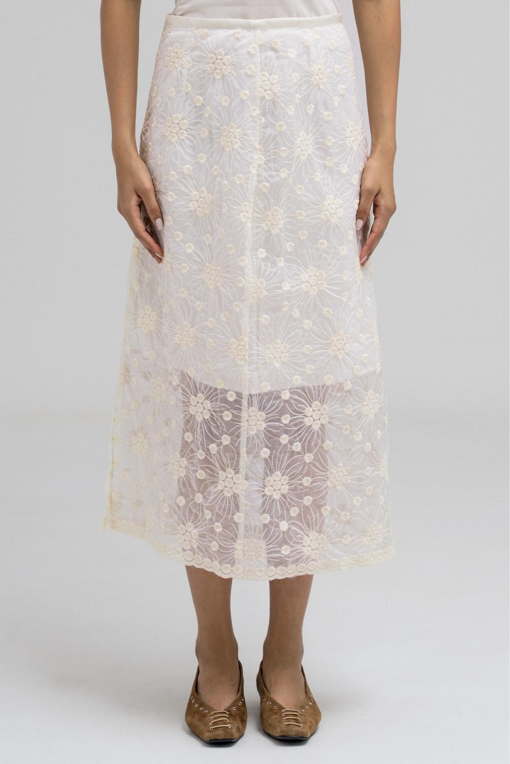 تتميز هذه التنورة الأنيقة بتطريز مخيط بالكامل، مما يمنحها ملمسًا ناعمًا وأنثويًا. تتميز بتصميم فريد بطول مزدوج: الطبقة الداخلية توفر تغطية كاملة، بينما تمتد الطبقة الشبكية الخارجية قليلاً أسفلها لإضفاء لمسة نهائية شفافة وشفافة. تتميز بتفاصيلها المميزة، مثل فتحة خلفية لسهولة الحركة وإغلاق خلفي مخفي لملاءمة مثالية.
