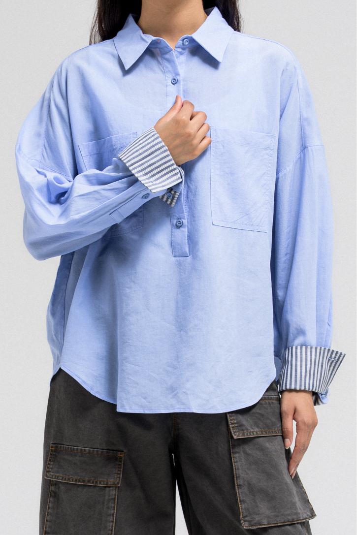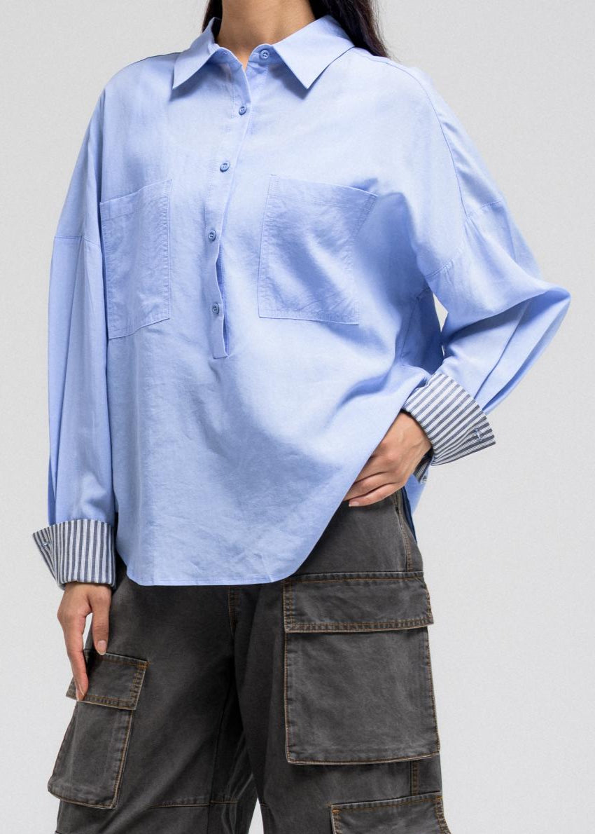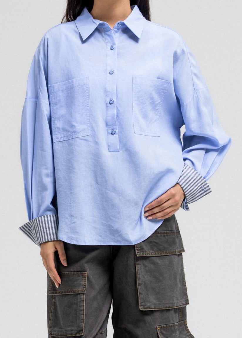 يتميز هذا القميص الخفيف بتصميم أنيق وبسيط بلمسة عصرية. يحتوي على جيبين على الصدر وأزرار أمامية جزئية تُضفي عليه مظهرًا مريحًا وبسيطًا. ياقة القميص الكلاسيكية تُحافظ على أناقته، بينما تُضفي أطراف الأكمام المخططة المتباينة لمسةً من التفاصيل المرحة وغير المتوقعة. أطراف الأكمام مُزينة بأزرار لإضفاء لمسة راقية.