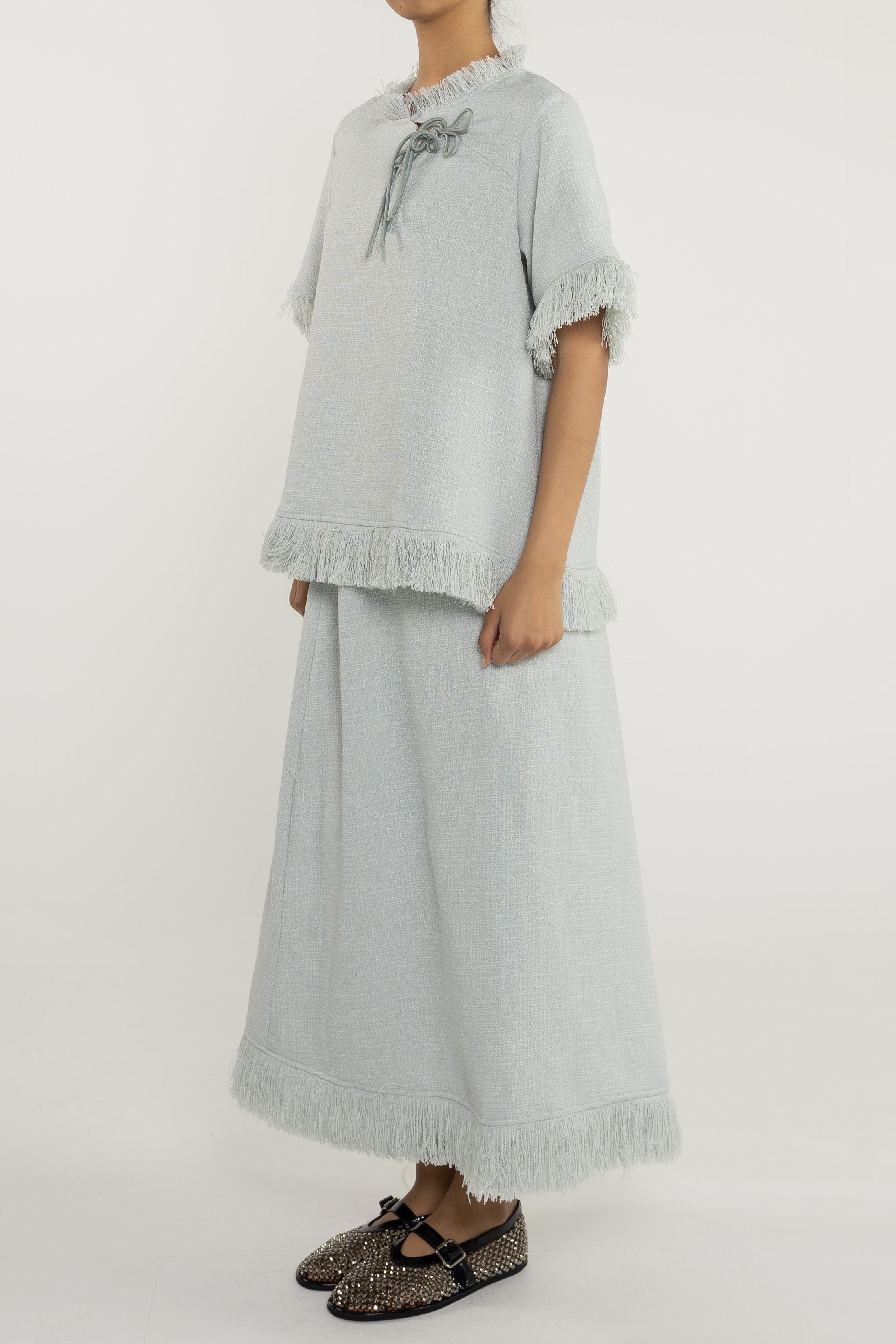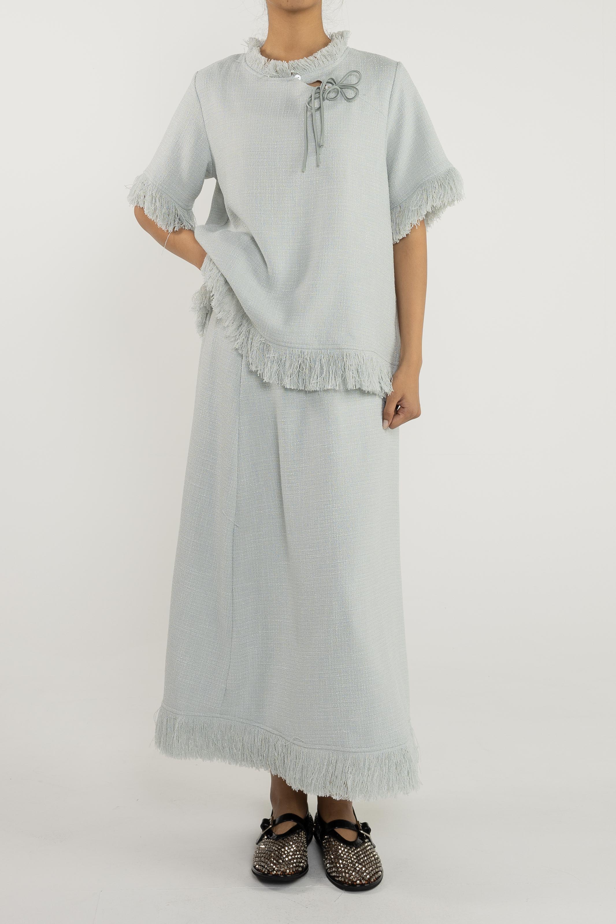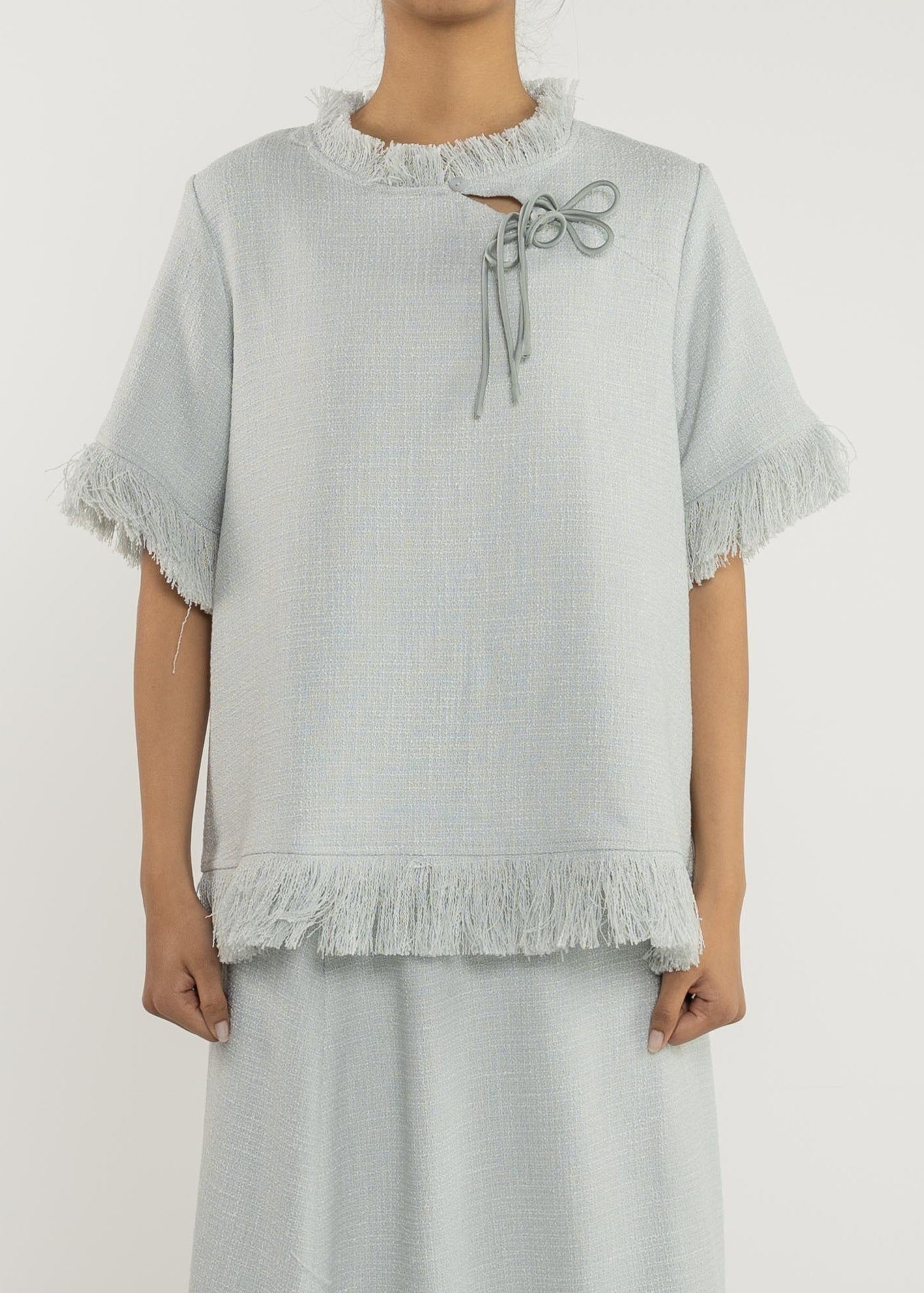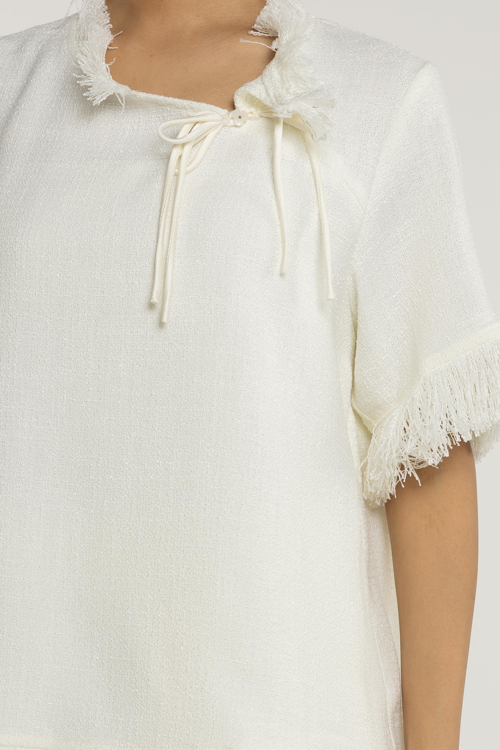 رقبة عالية مع زر مُرفق. تصميم على شكل فيونكة.