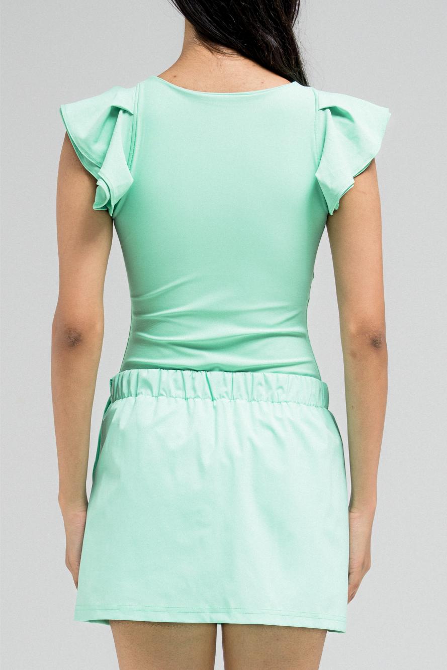 طقم السباحة يتضمن بدلة سباحة كاملة بتفاصيل كشكشة رقيقة على طول الأكمام. مبطنة ببطانة داخلية لمزيد من الدعم والراحة. يُنسّق مع شورت مطابق بتصميم أنيق مع غطاء ملفوف مُثبّت بأزرار، ليُعطي انطباعًا بالتنورة. كما يتميز الشورت بحزام خصر مطاطي لراحة قصوى.