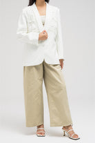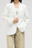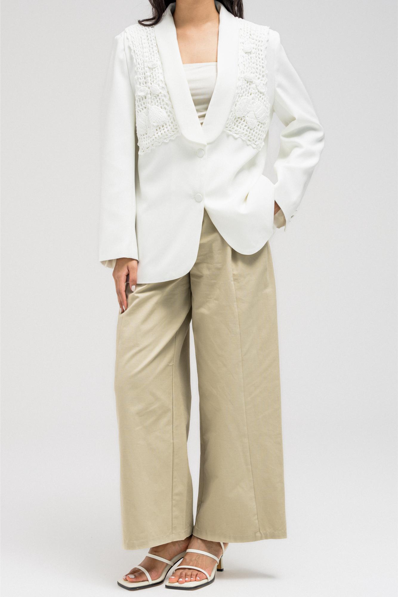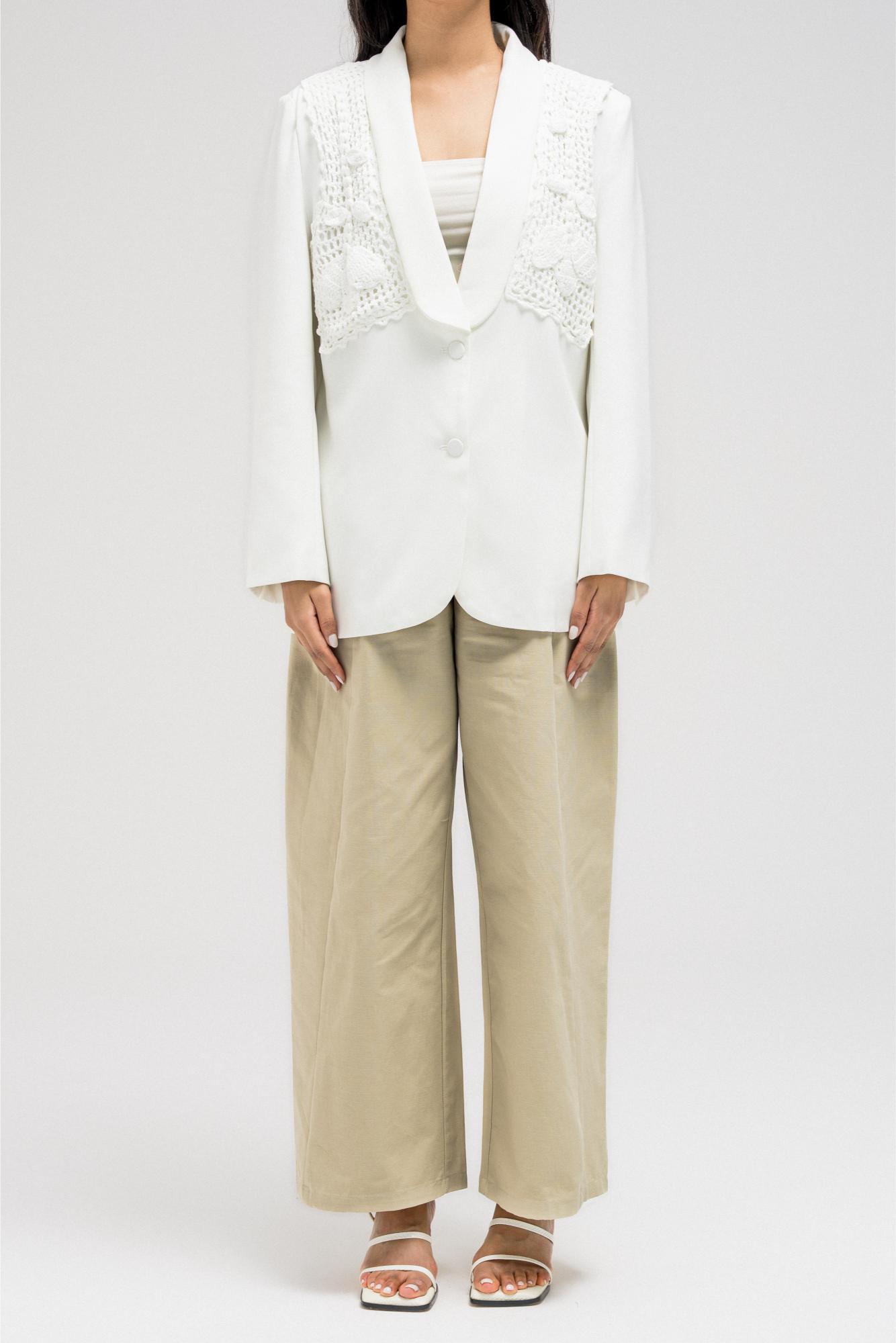 سترة أنيقة بتصميم كروشيه متقن على طول الألواح الأمامية. مصممة بزرين أماميين للإغلاق لمظهر أنيق وراقي.