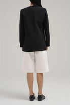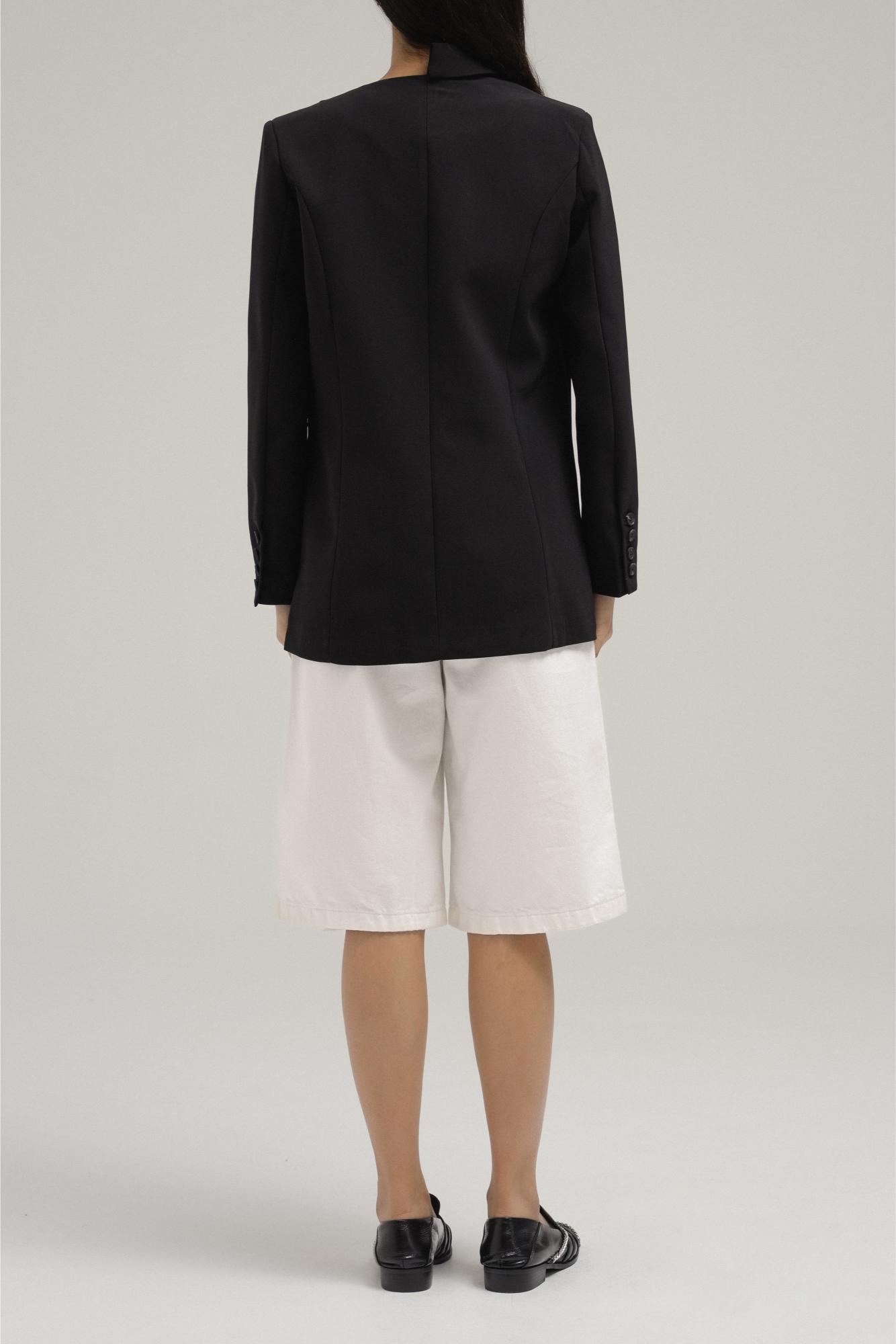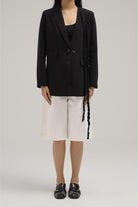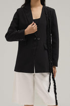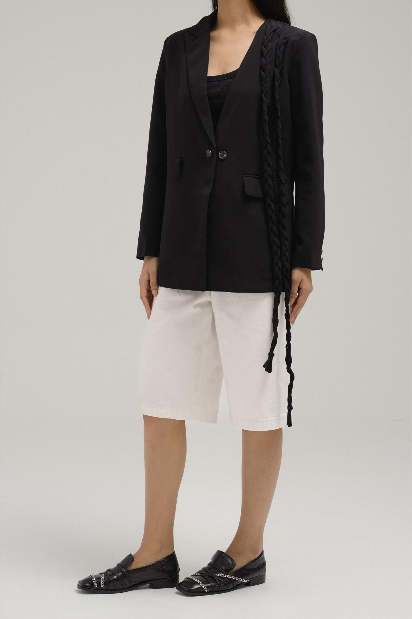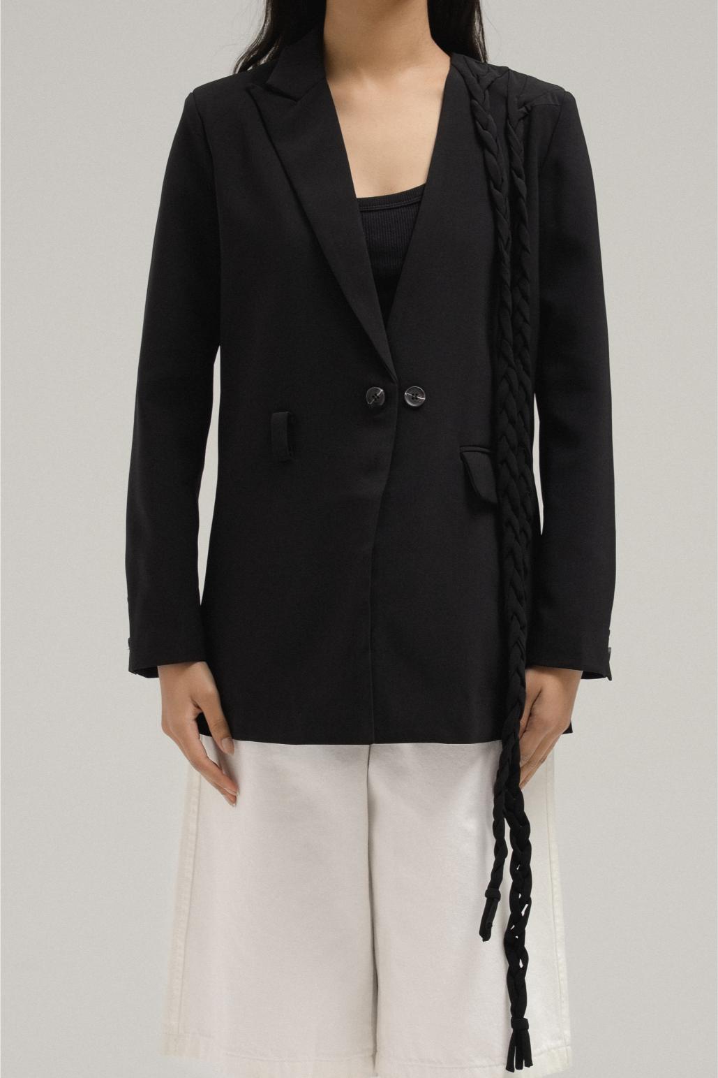 يُعيد هذا البليزر تعريف الخياطة بلمسة عصرية. صُمم بإغلاق أنيق بزر واحد، ويتميز بتفاصيل فريدة تشبه الحبل المضفر على الجسم والأكمام، مما يُضفي عليه لمسةً من الحركة والبعد. قصته الحادة وقصته الكلاسيكية تجعله قطعةً مميزةً تُوازن بين التصميم الأنيق واللمسة الفنية العصرية.