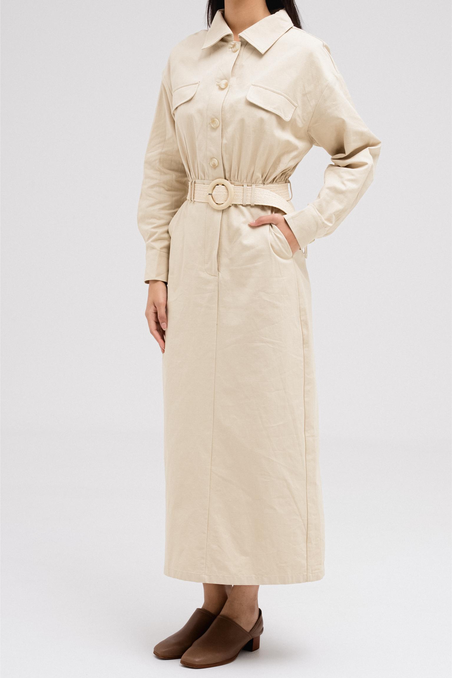 فستان متوسط ​​الطول بتصميم كارغو، بياقة قميص، وجيوب صدرية بغطاء، وأزرار أمامية للإغلاق. مصمم بخصر مطاطي، ويأتي مع حزام خيزران قابل للإزالة. يتميز الفستان بفتحة صغيرة في الحاشية الخلفية لسهولة الحركة.