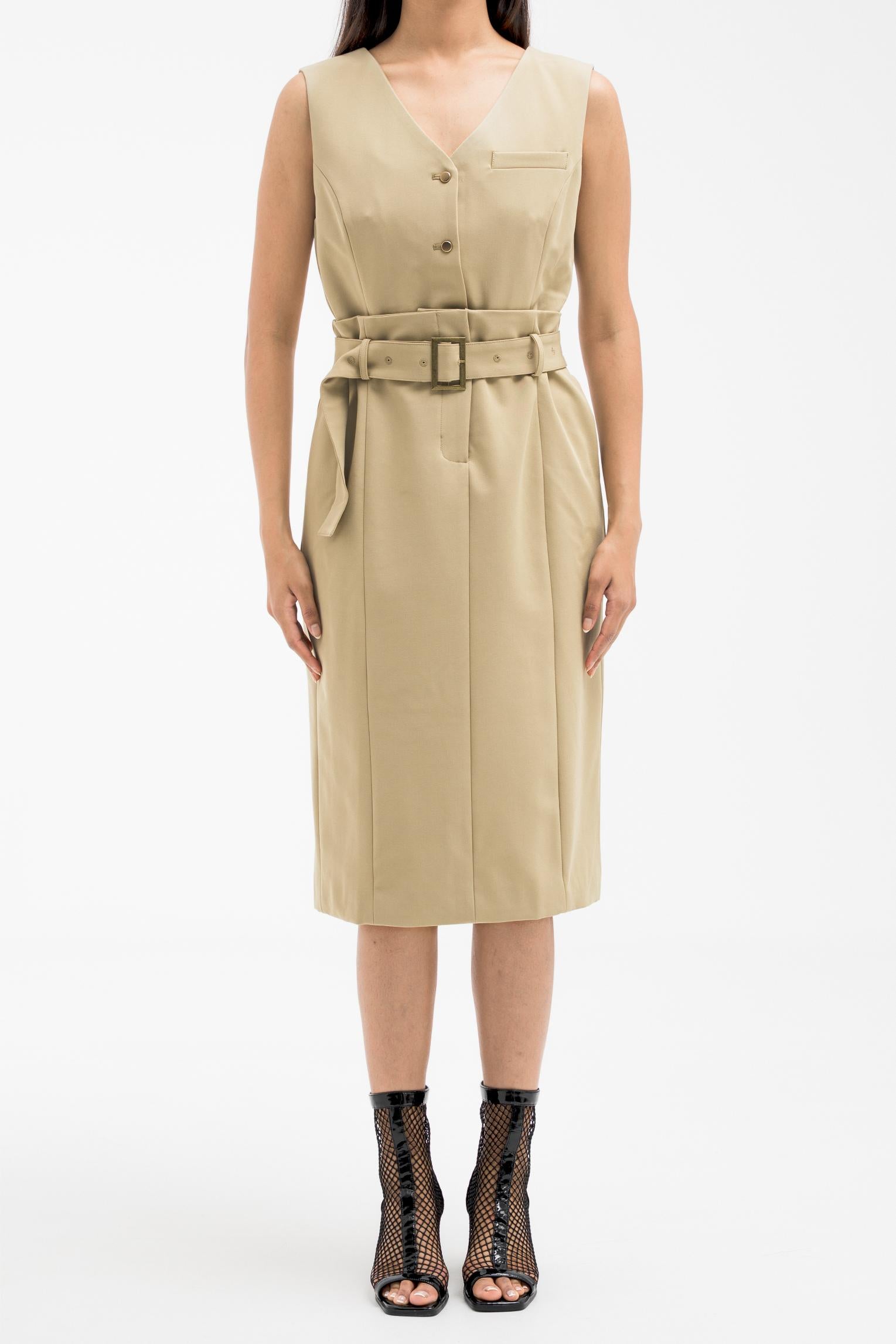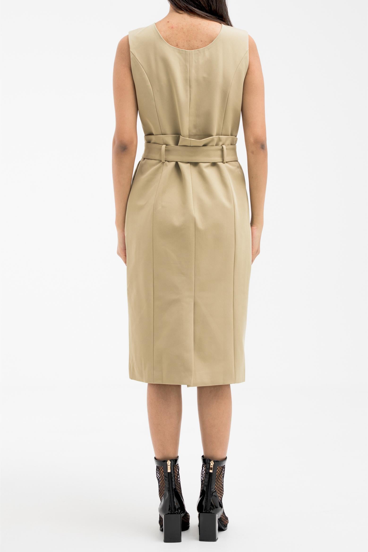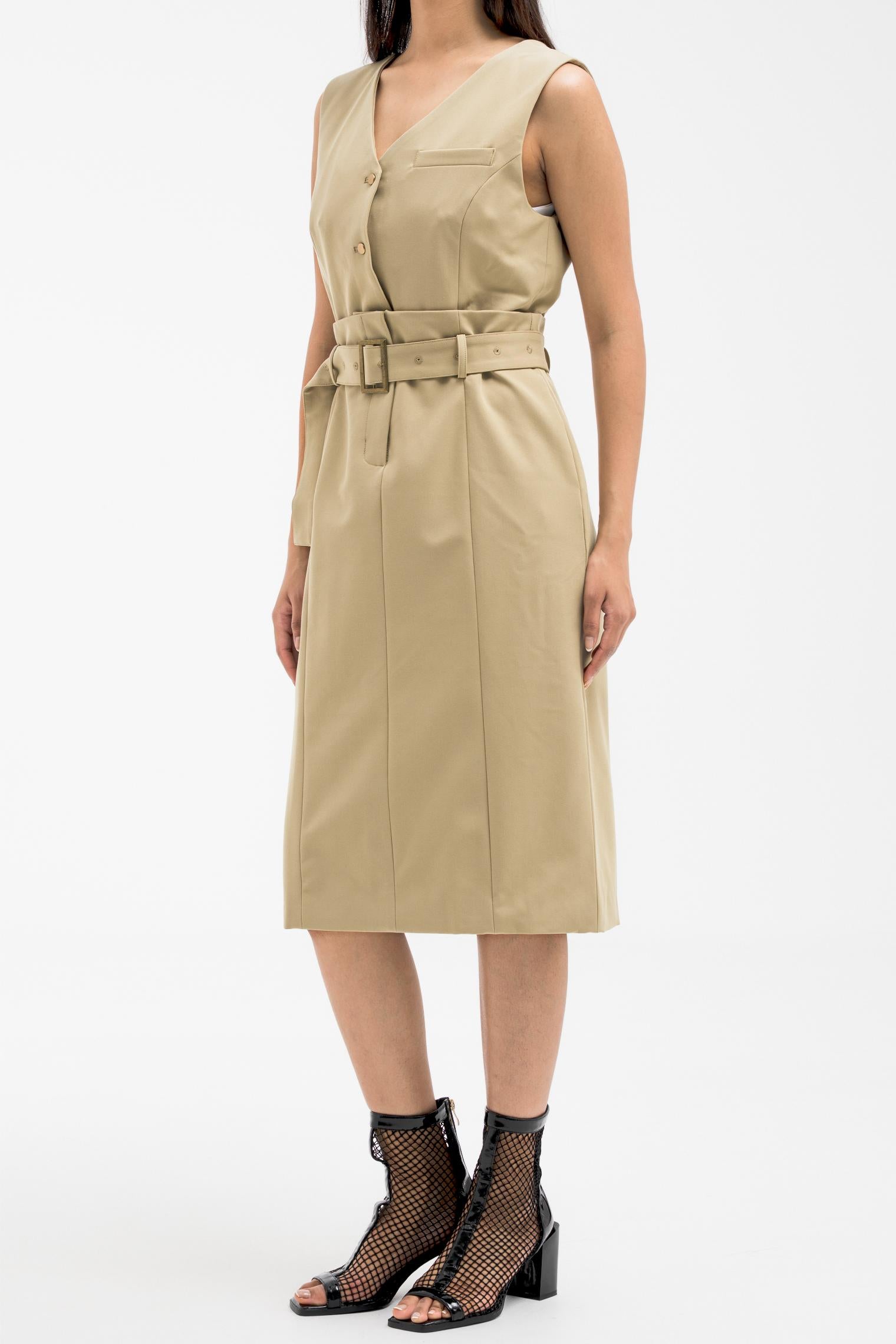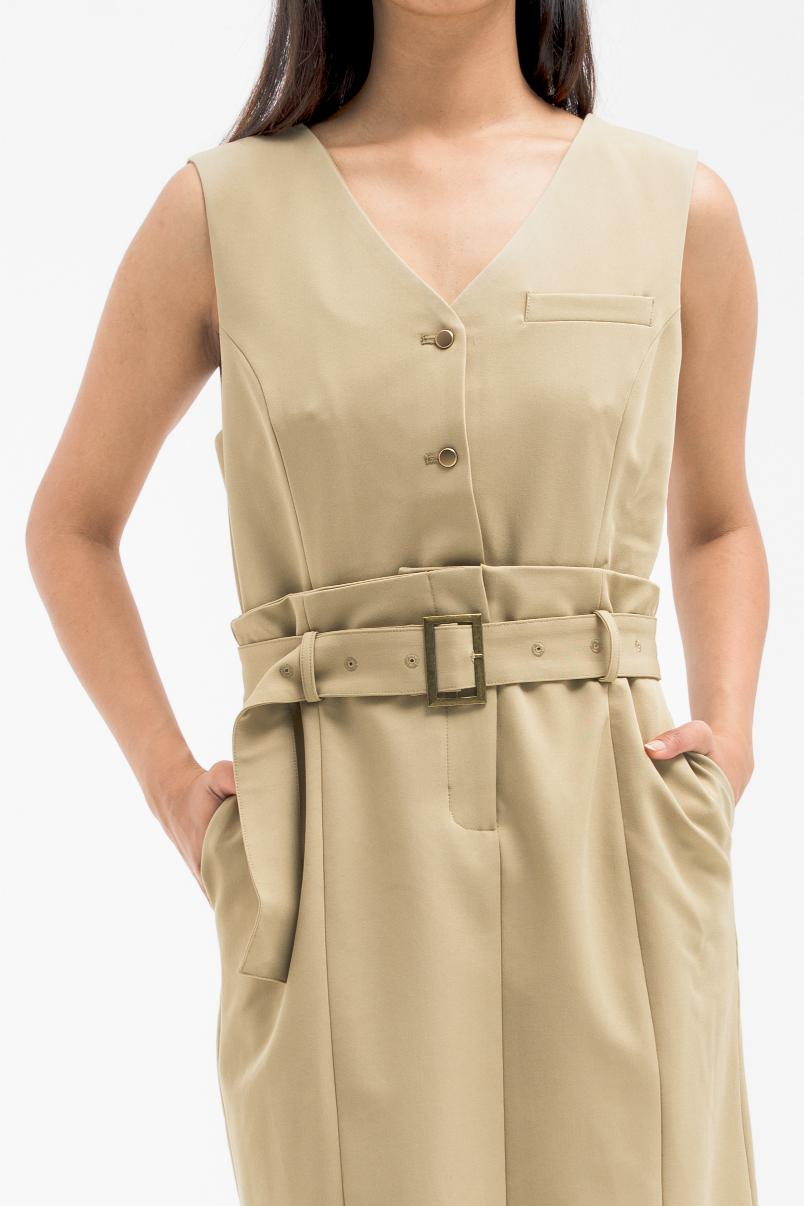 بليزر بتصميم بسيط وجيوب أمامية. السترة والتنورة متصلتان ببعضهما، مما يوحي بفستان. تتميز السترة بأزرار أمامية، بينما تتميز التنورة بسحاب مخفي. تأتي التنورة مع حزام مطابق.