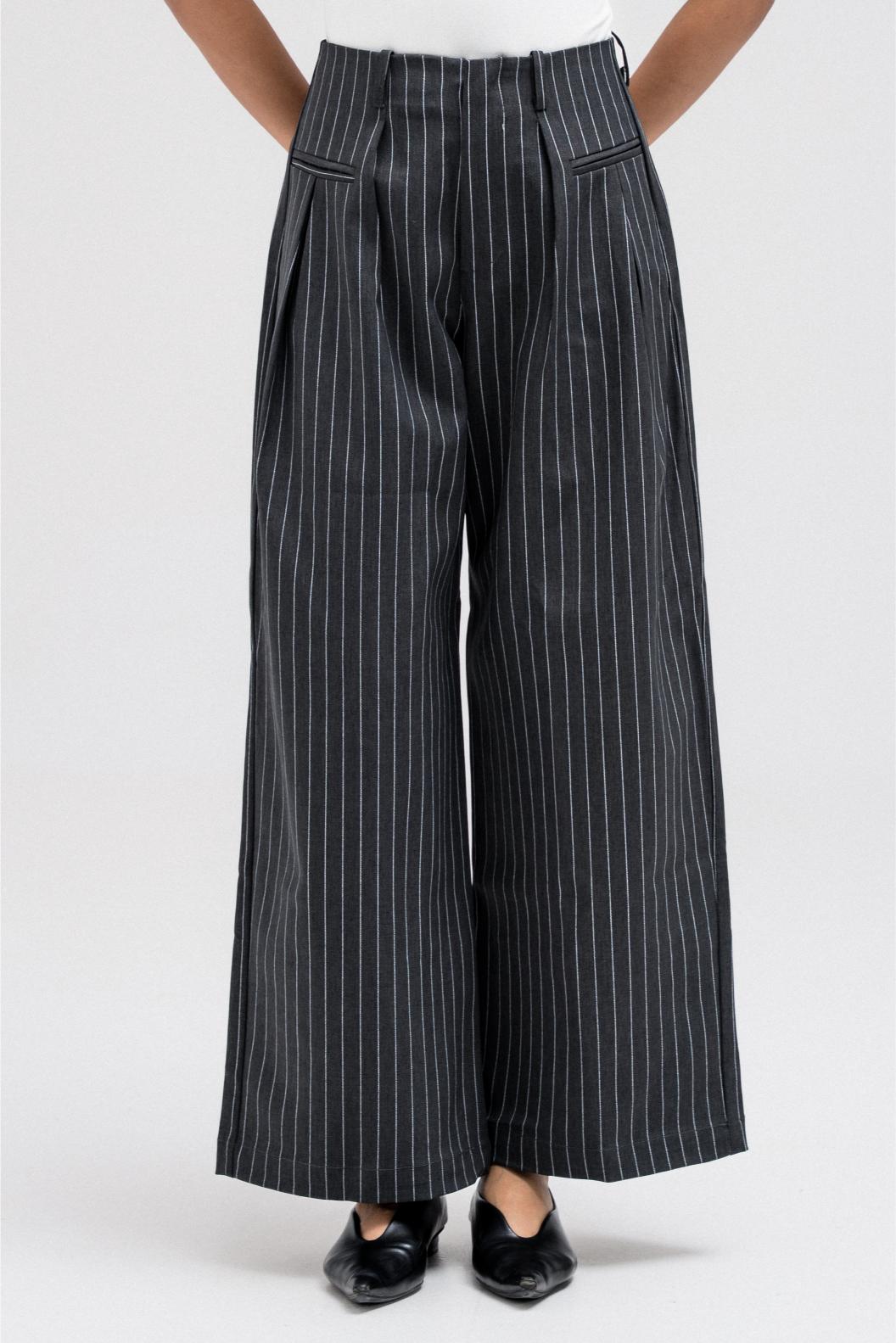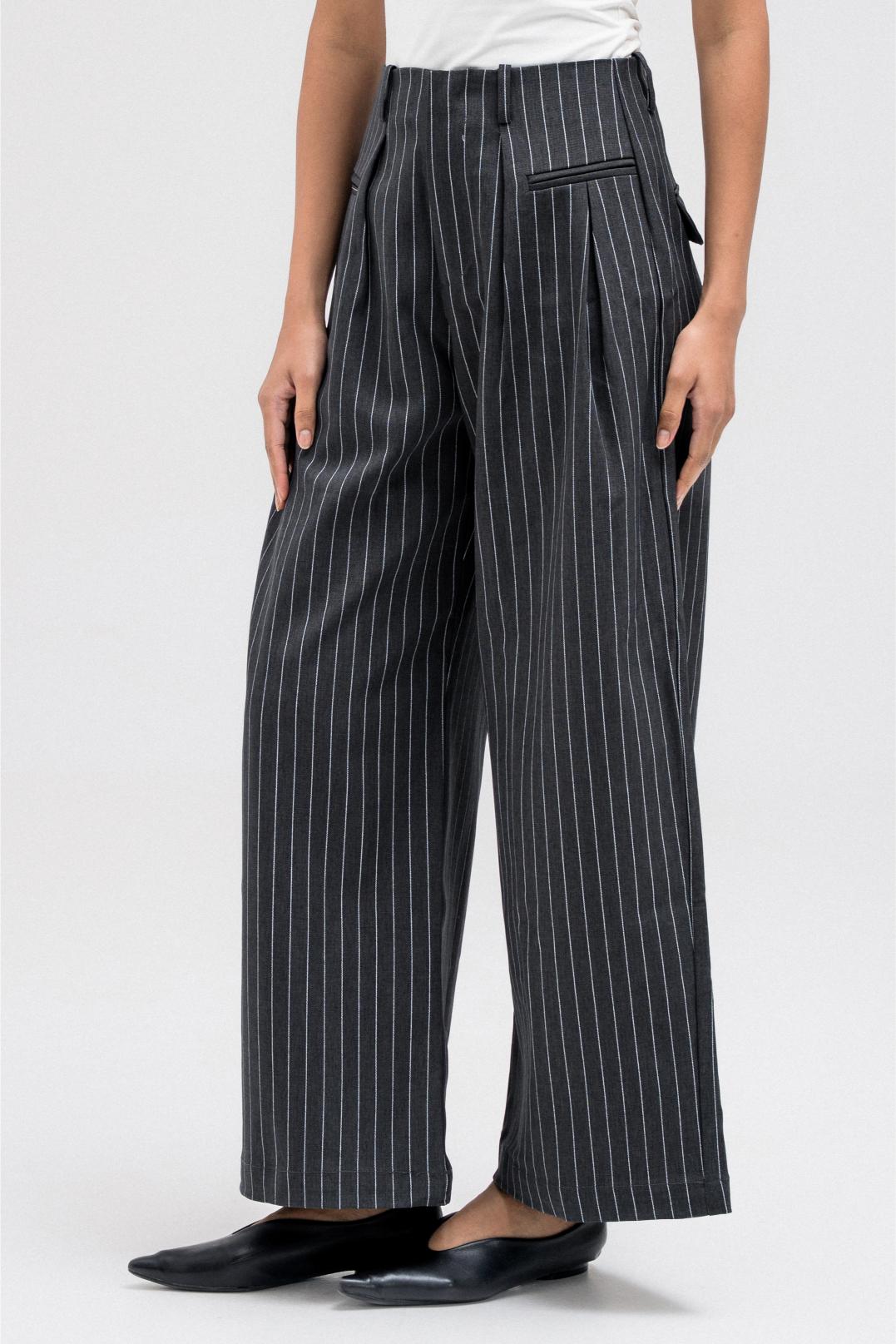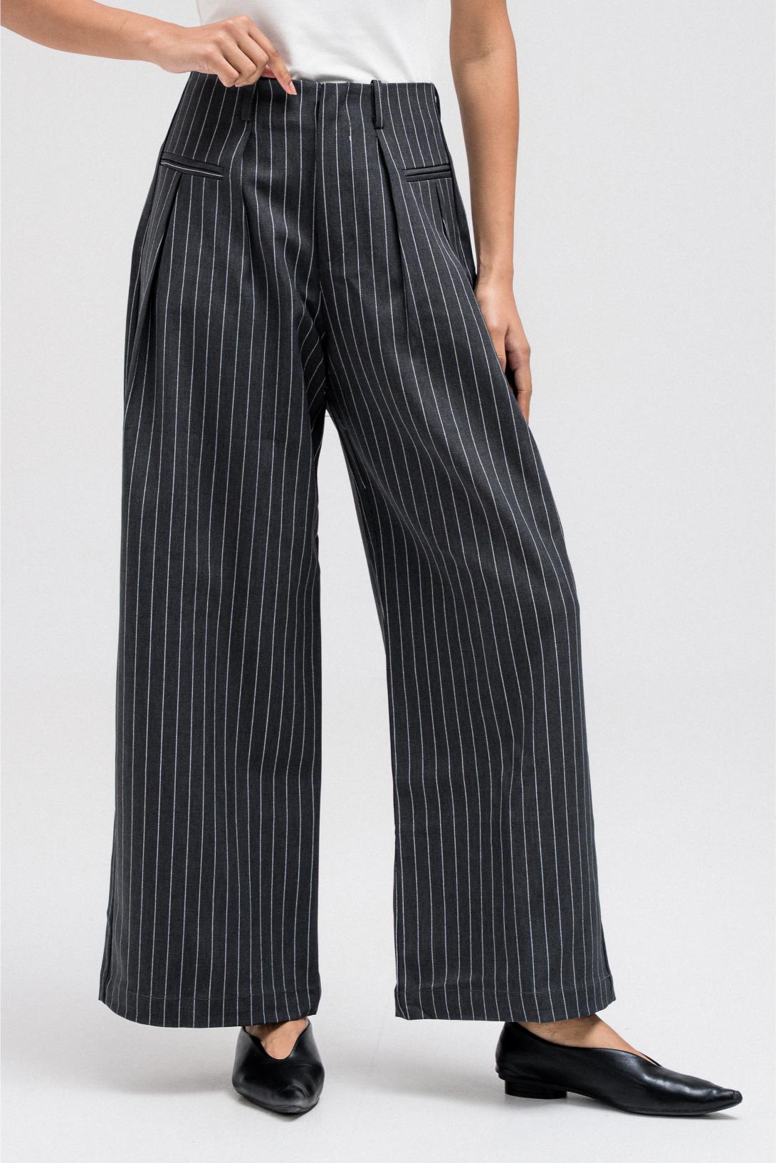 Tailored wide-leg pants featuring an all-over subtle stripe pattern. Designed with a front zipper closure for a clean finish and an easy, structured fit that works effortlessly for everyday or elevated styling.
