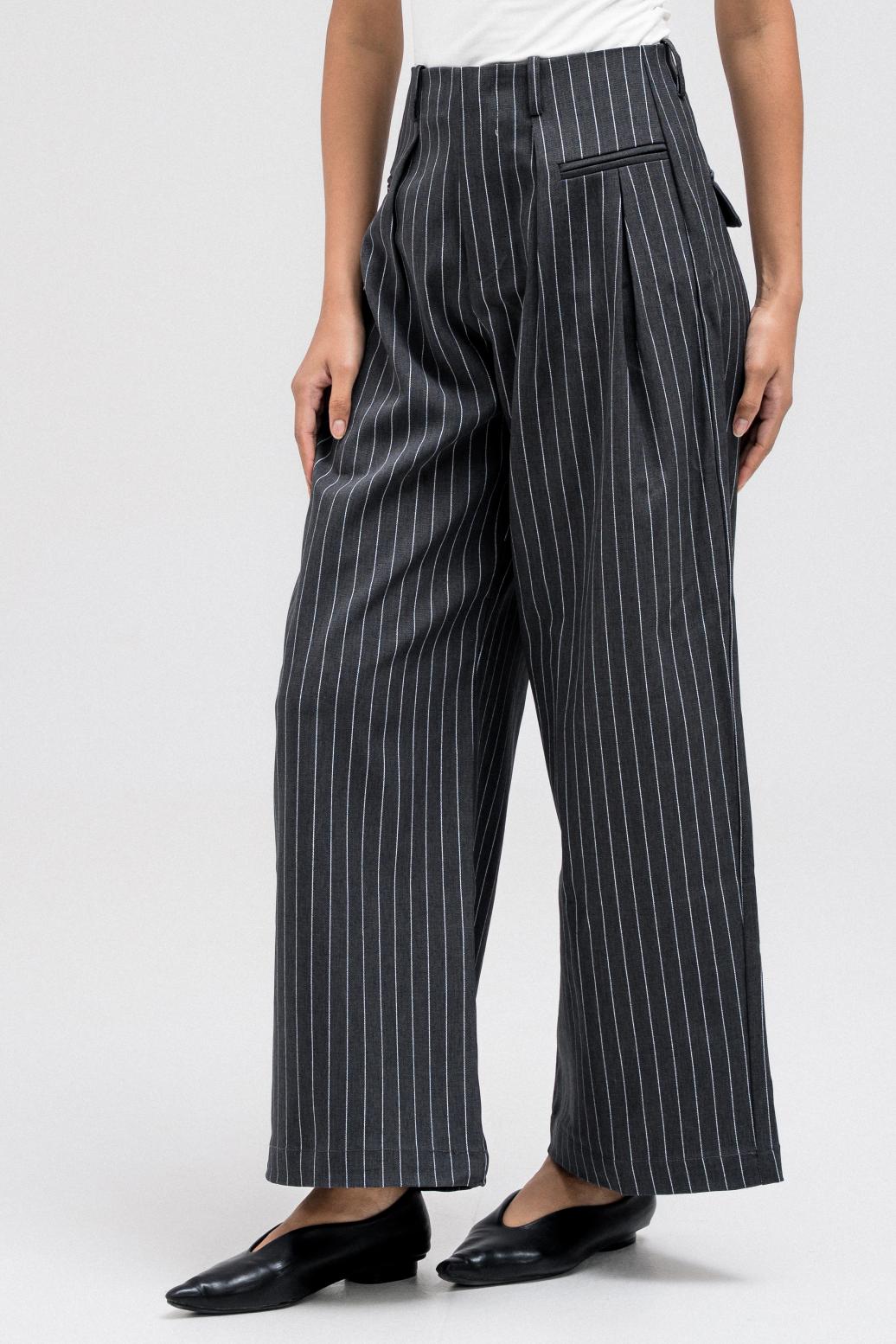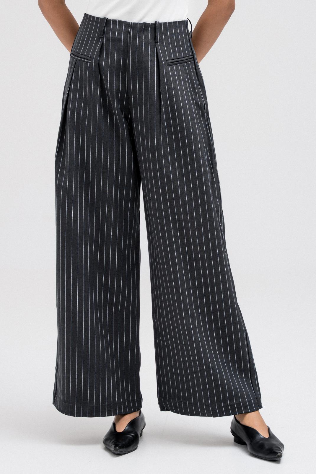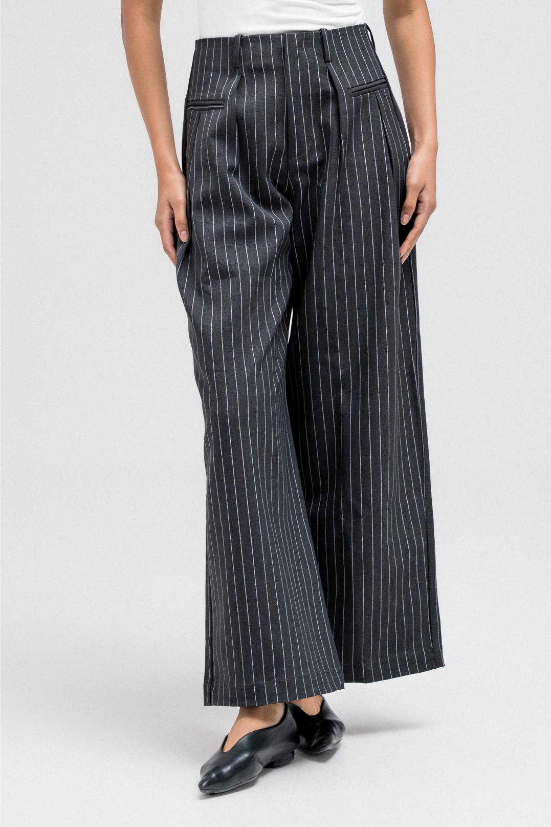 Tailored wide-leg pants featuring an all-over subtle stripe pattern. Designed with a front zipper closure for a clean finish and an easy, structured fit that works effortlessly for everyday or elevated styling.