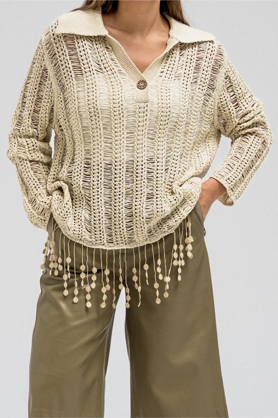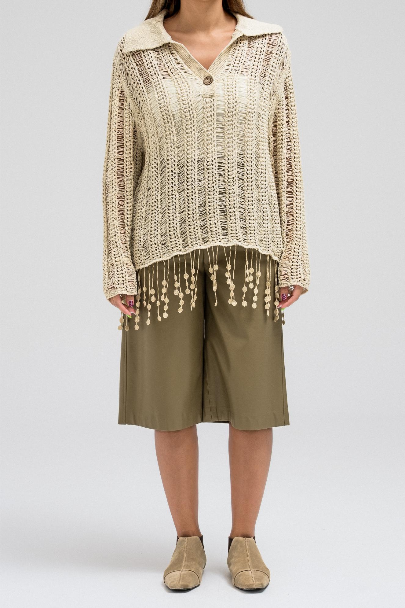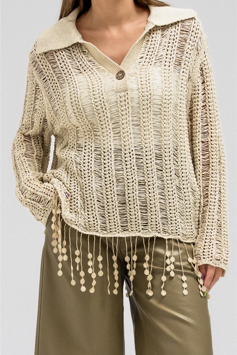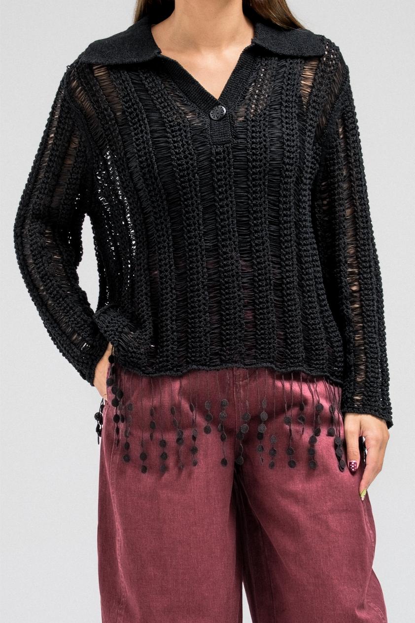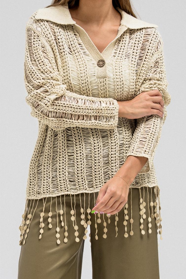 بلوزة محبوكة رقيقة، مصممة بنسيج مفتوح، تضفي لمسة أنثوية ناعمة. تتميز بياقة كلاسيكية وأزرار أمامية للإغلاق وأكمام طويلة. حافة الفستان مزينة بشراشيب أنيقة، لإطلالة مريحة وأنيقة، تتألق مع كل خطوة.