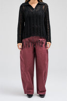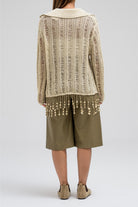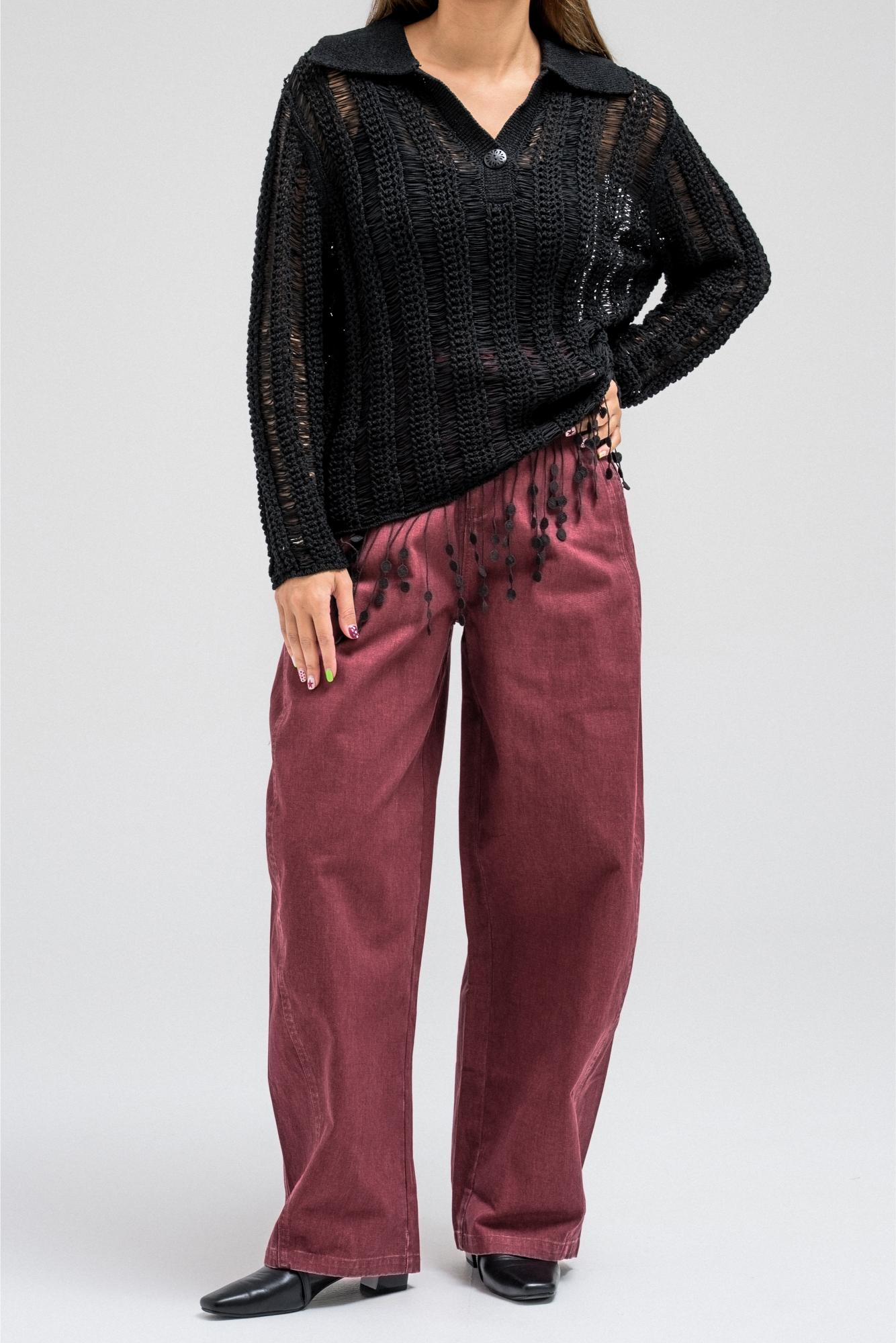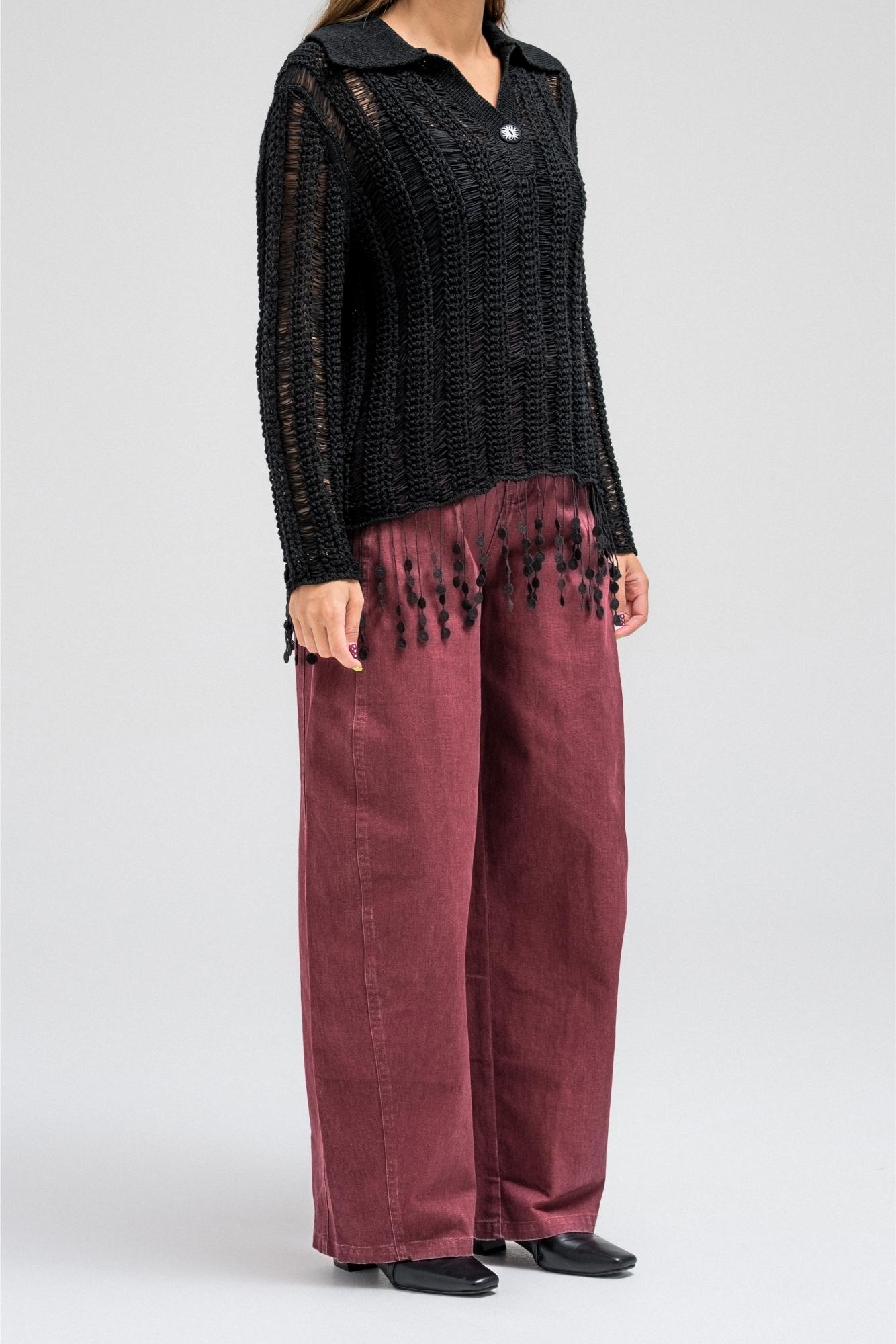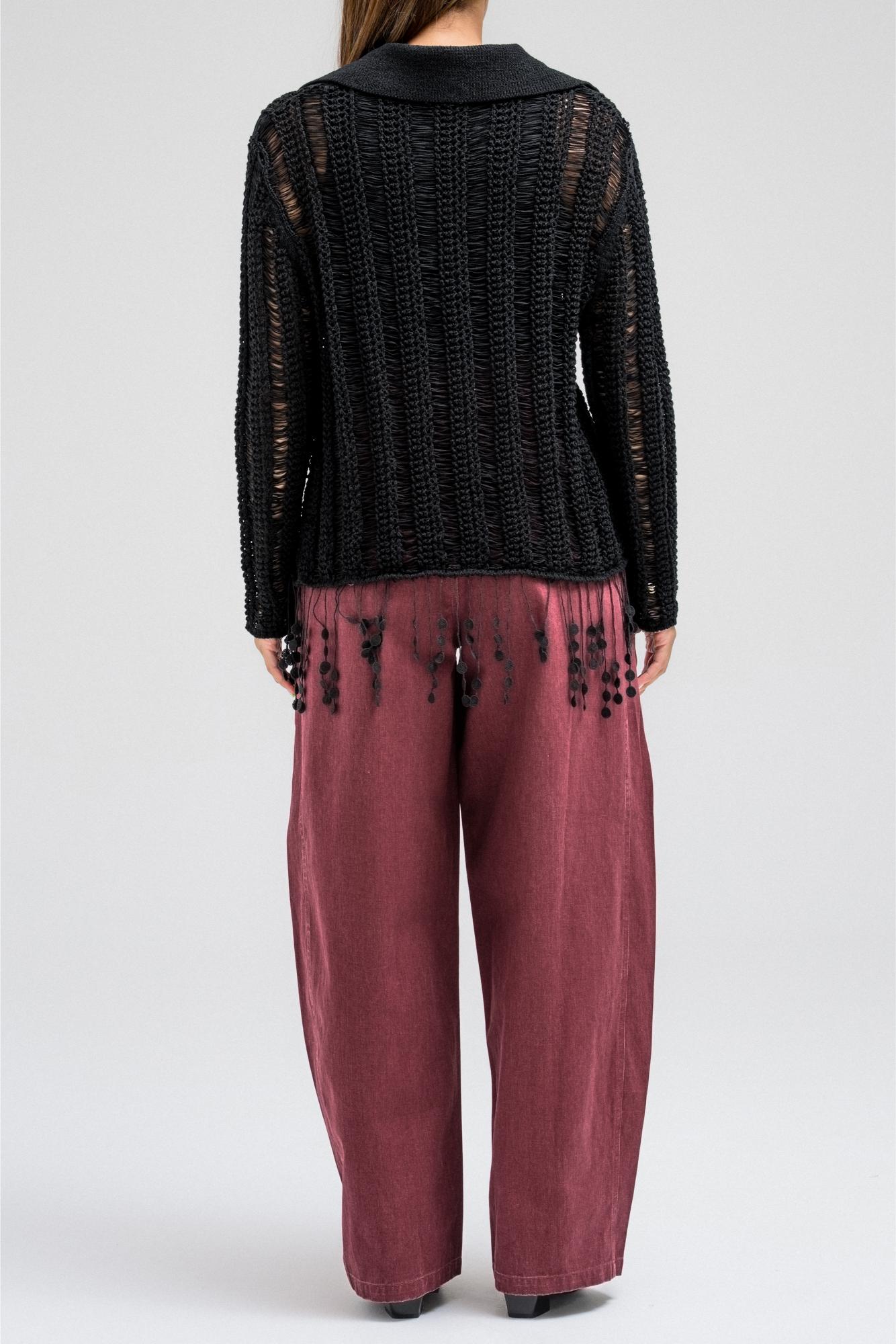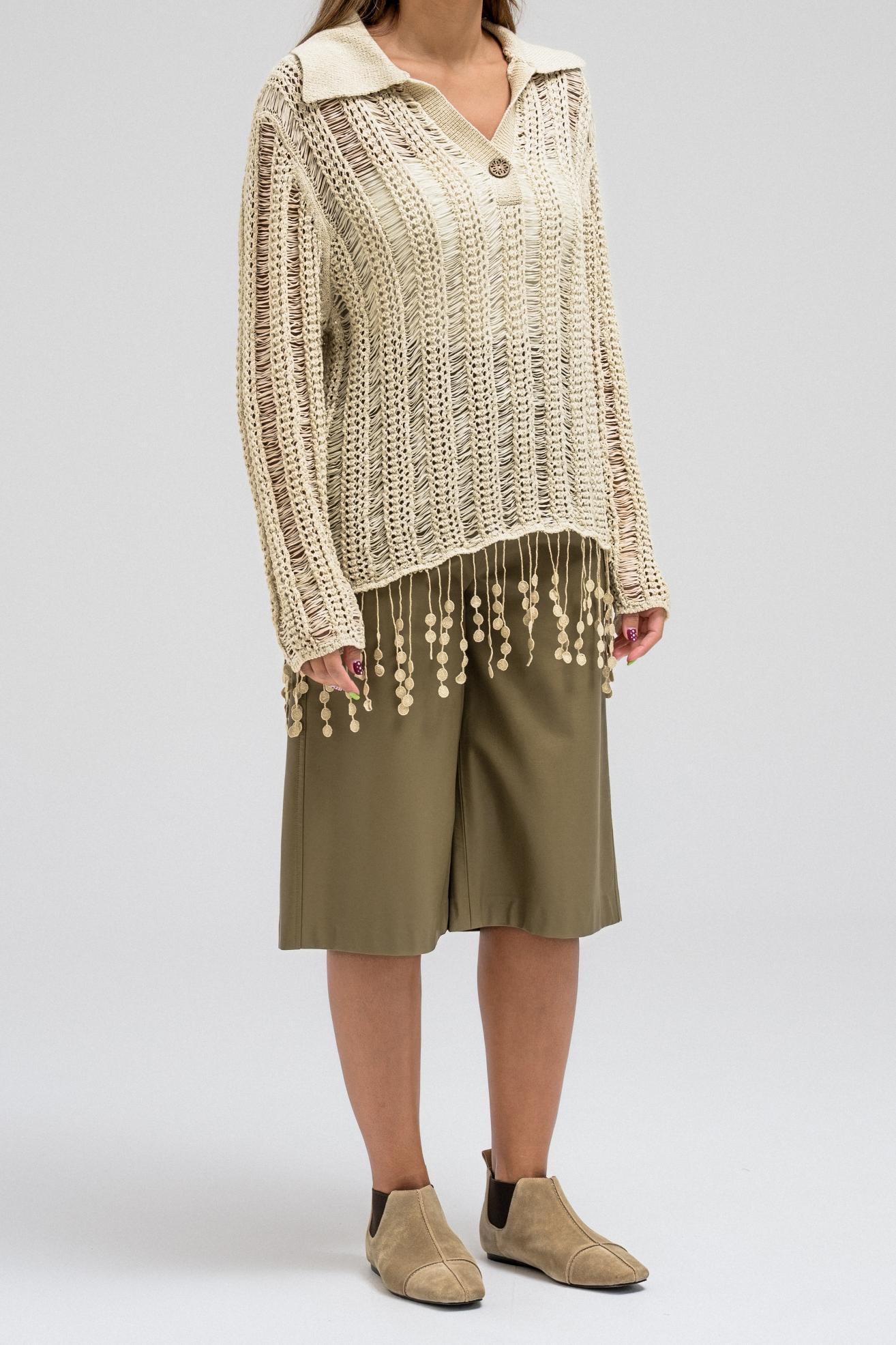بلوزة محبوكة رقيقة، مصممة بنسيج مفتوح، تضفي لمسة أنثوية ناعمة. تتميز بياقة كلاسيكية وأزرار أمامية للإغلاق وأكمام طويلة. حافة الفستان مزينة بشراشيب أنيقة، لإطلالة مريحة وأنيقة، تتألق مع كل خطوة.