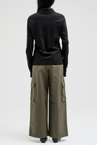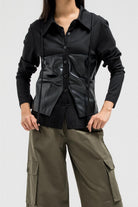 A statement piece combining two textures, soft fabric with structured leather. This top features a classic collar, long sleeves, and a front button closure. The cinched leather detail at the front adds dimension and edge, creating a bold yet polished look.