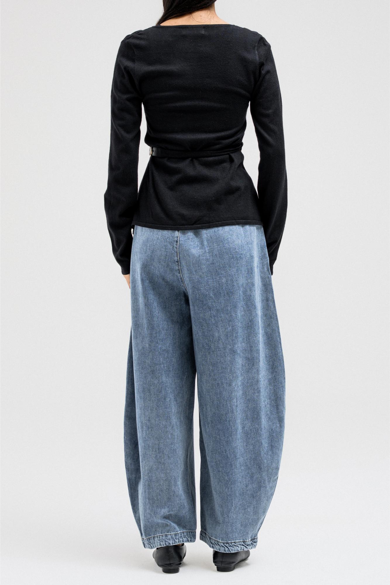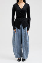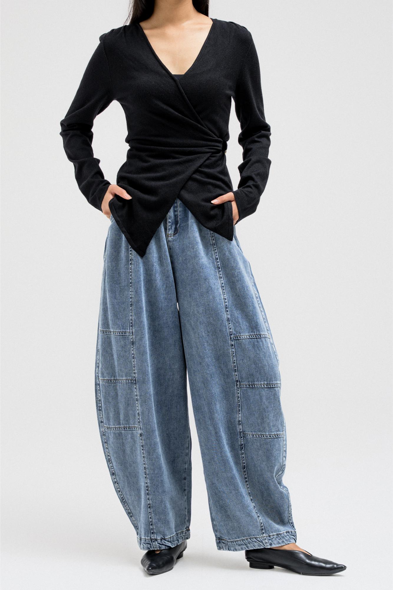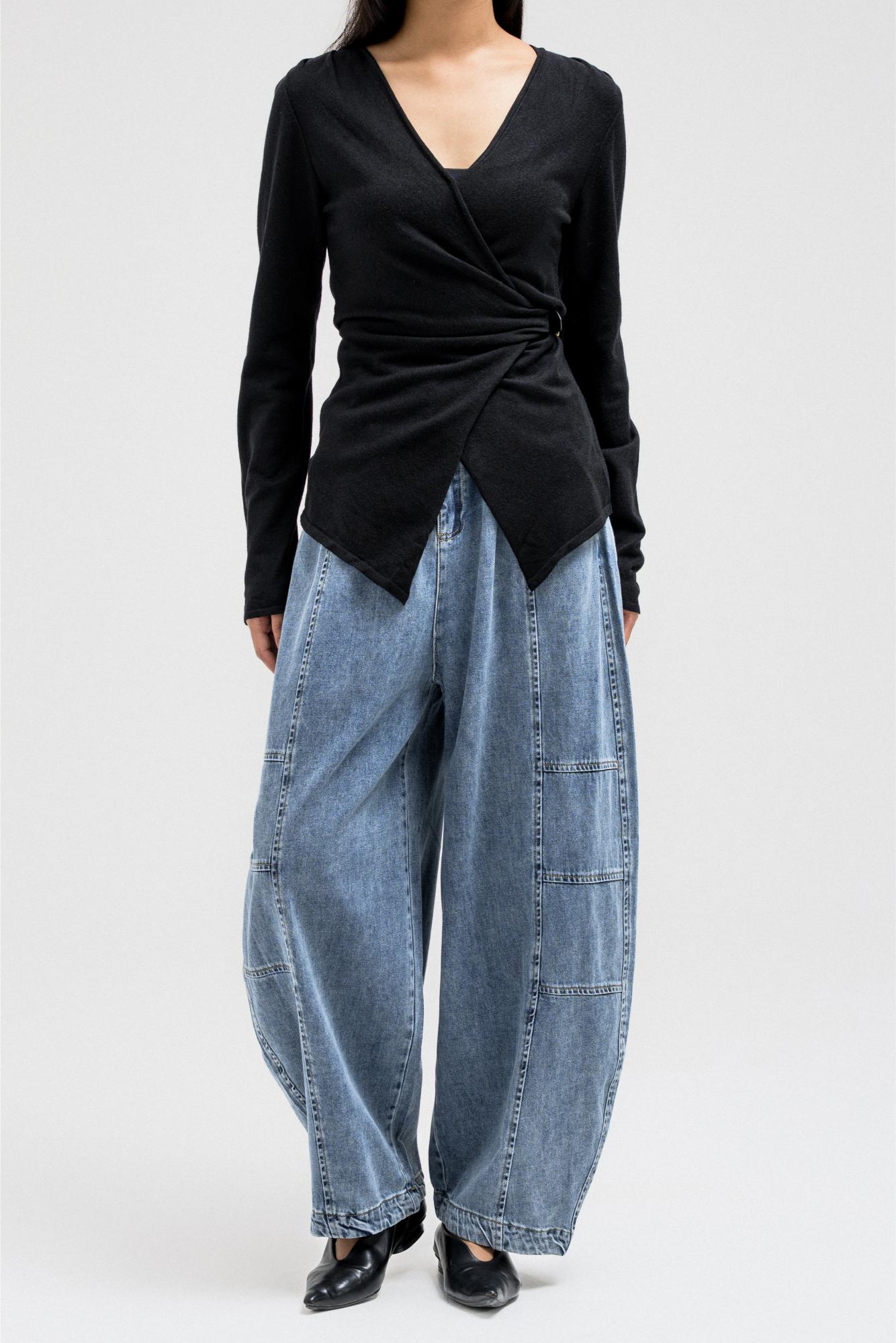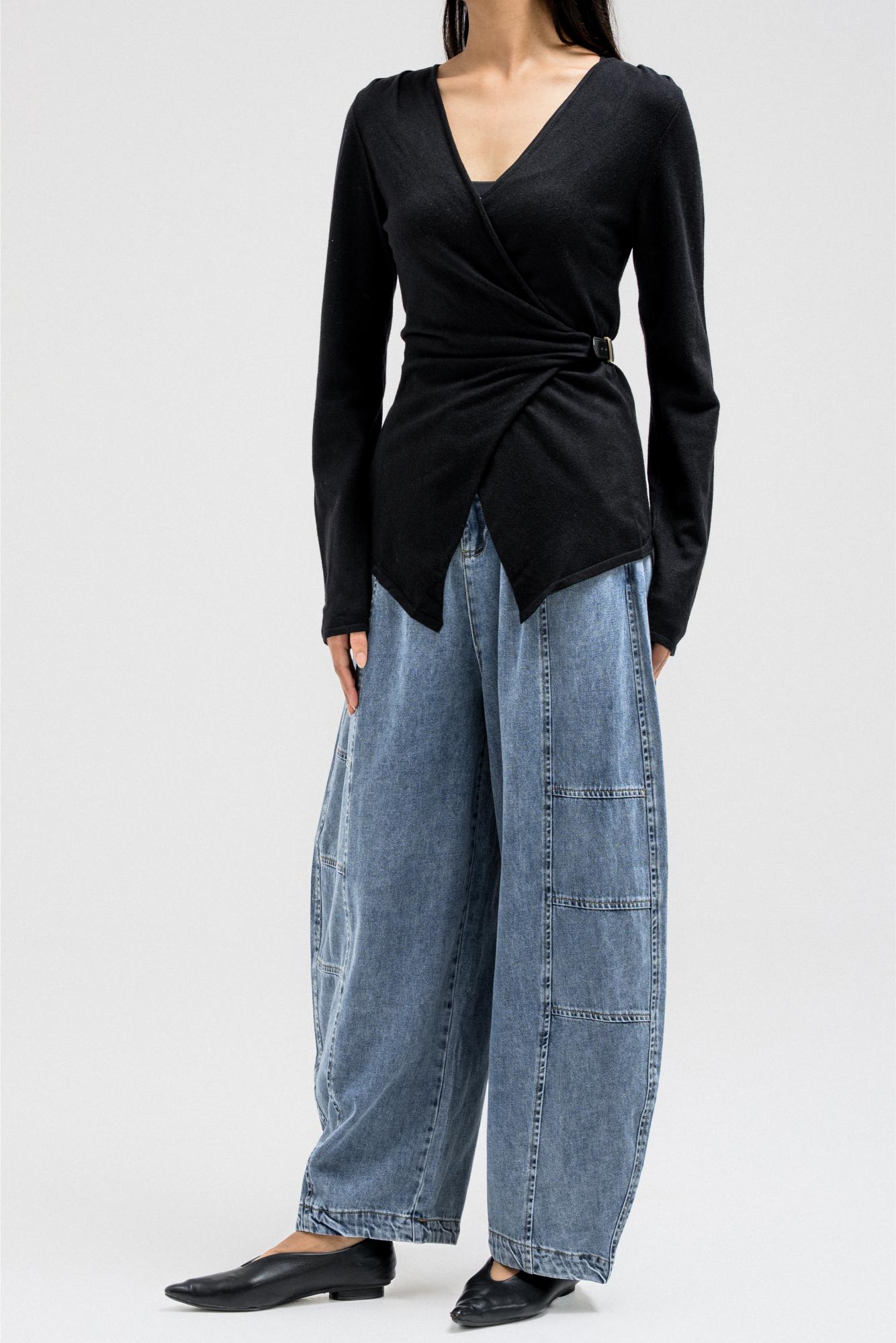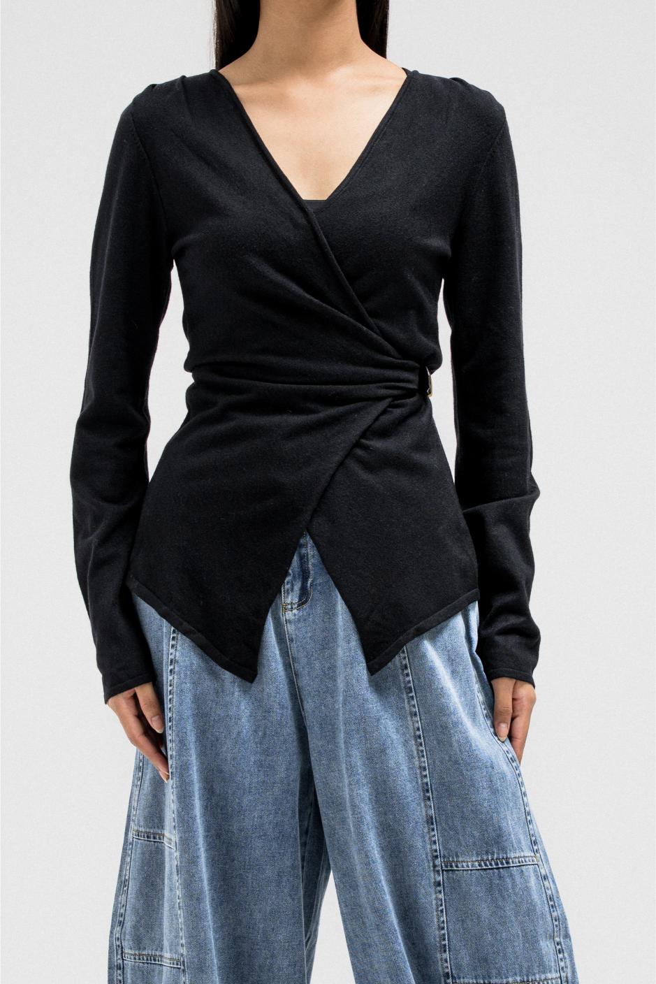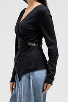 A sophisticated wrap-style top featuring a soft draped neckline and an asymmetrical hem. It comes with an attached buckle belt that cinches the waist for a flattering silhouette.