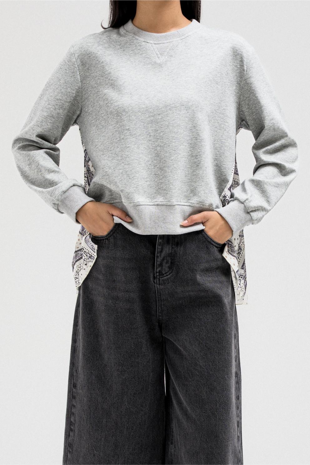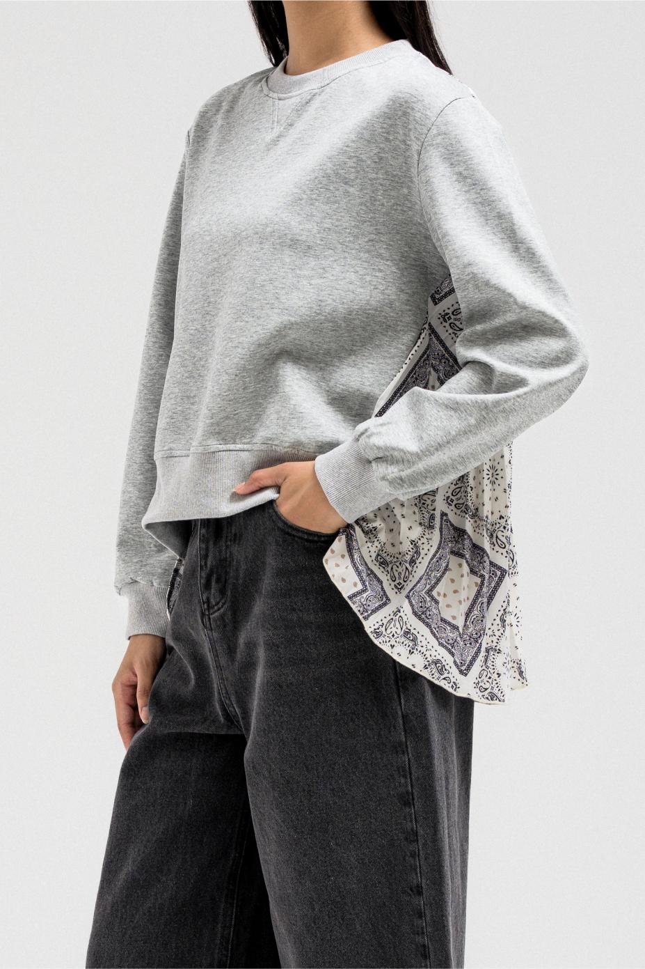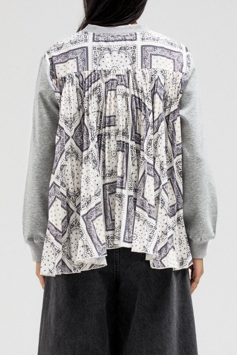 A classic sweater from the front with a twist at the back featuring a pleated bandana-print fabric that flows longer than the front hem. This contrast detail adds movement and character, blending casual comfort with a touch of artistic flair. Perfect for elevating everyday looks.