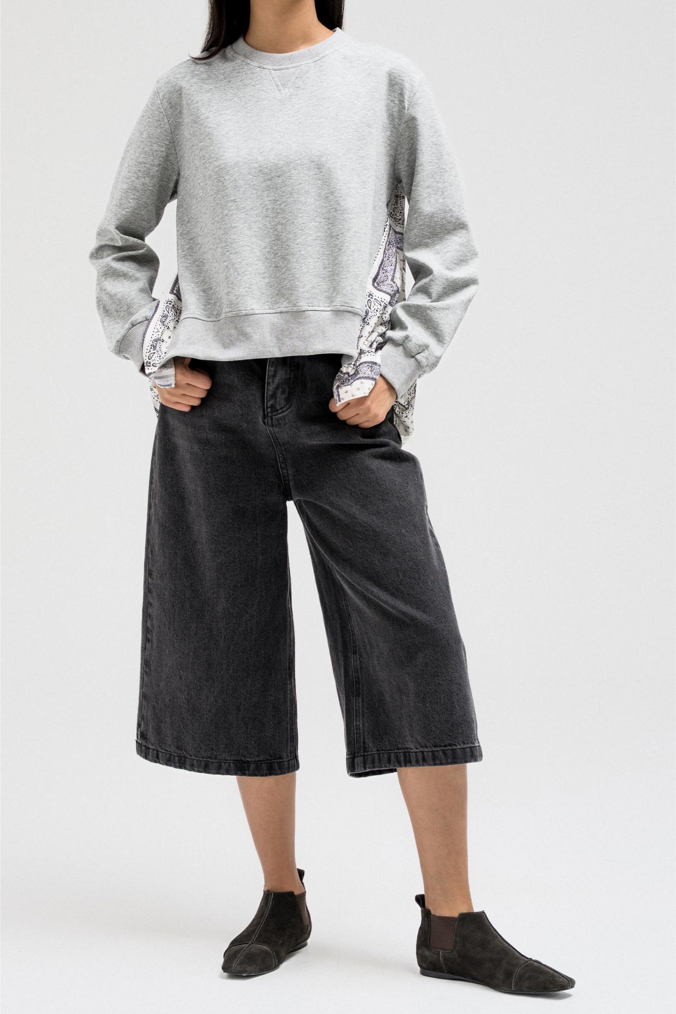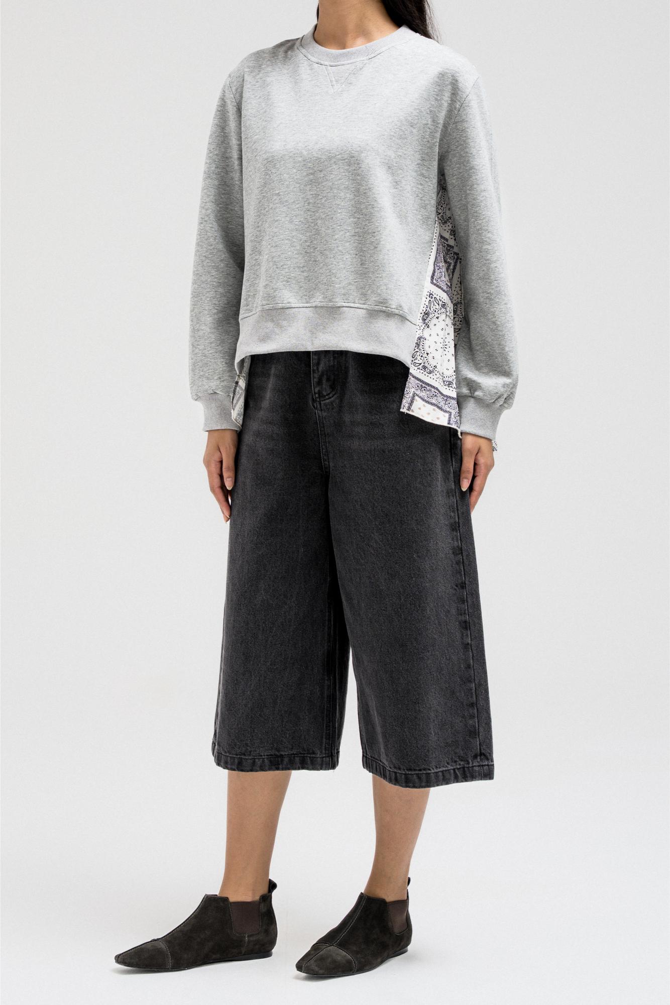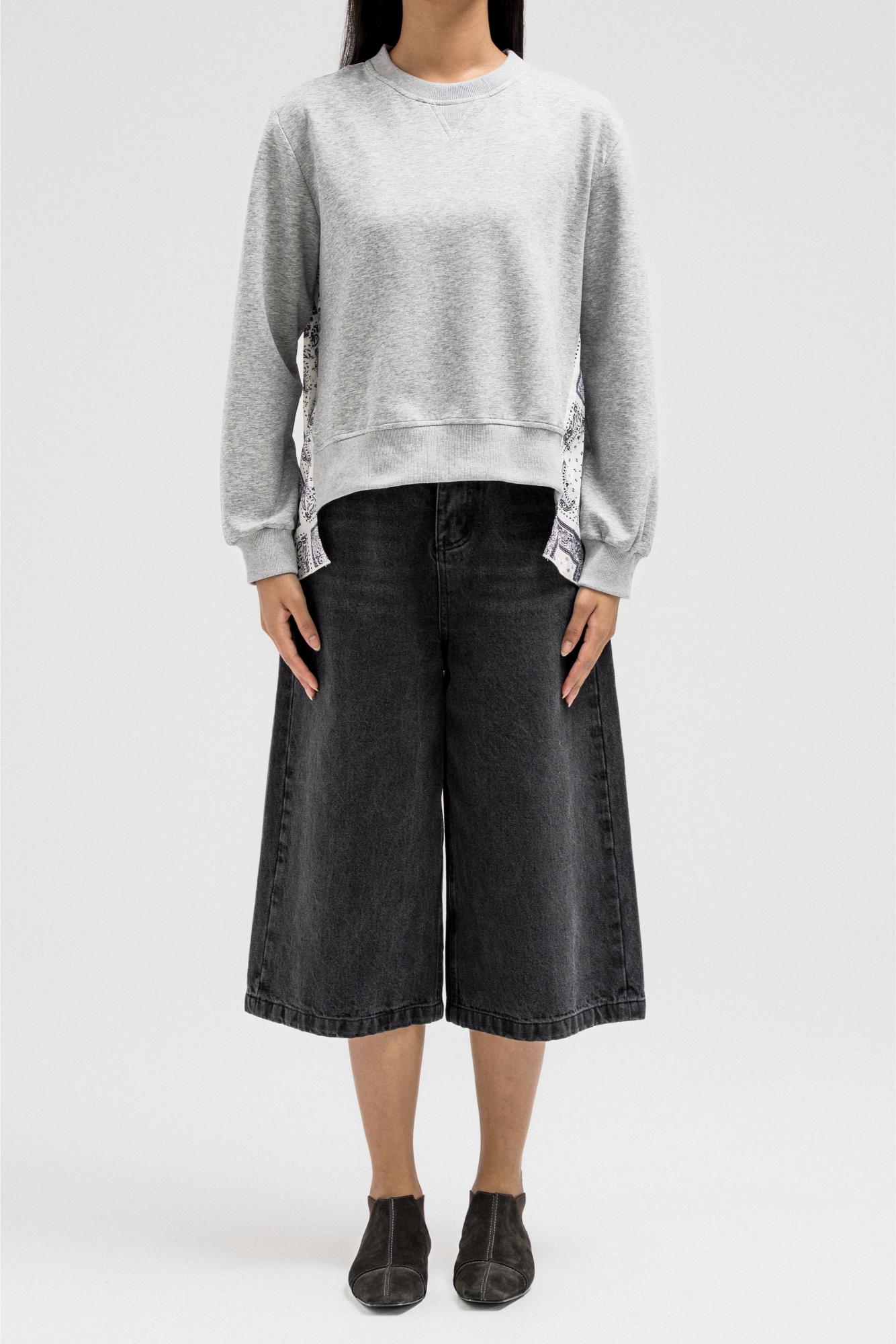 A classic sweater from the front with a twist at the back featuring a pleated bandana-print fabric that flows longer than the front hem. This contrast detail adds movement and character, blending casual comfort with a touch of artistic flair. Perfect for elevating everyday looks.
