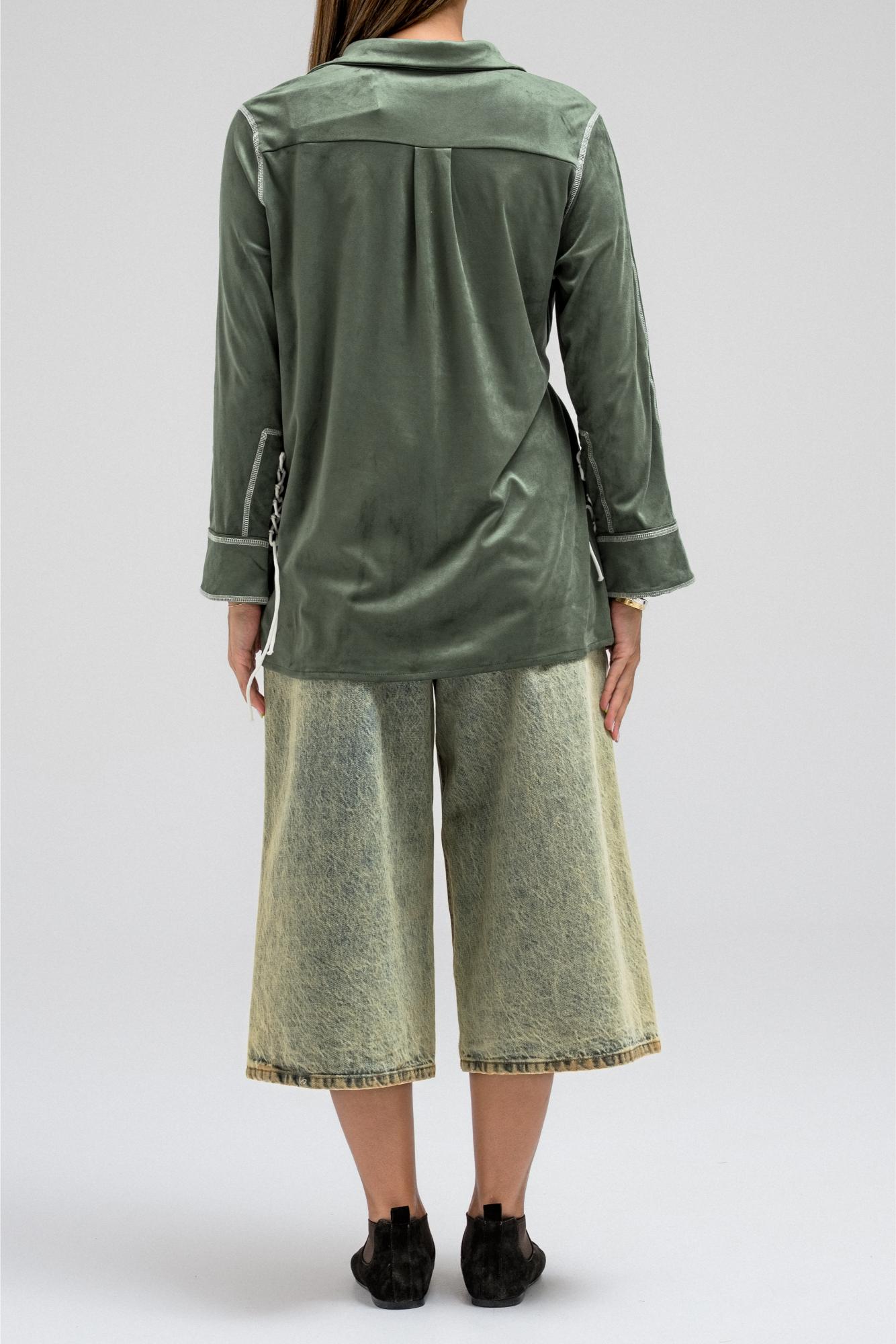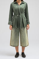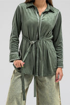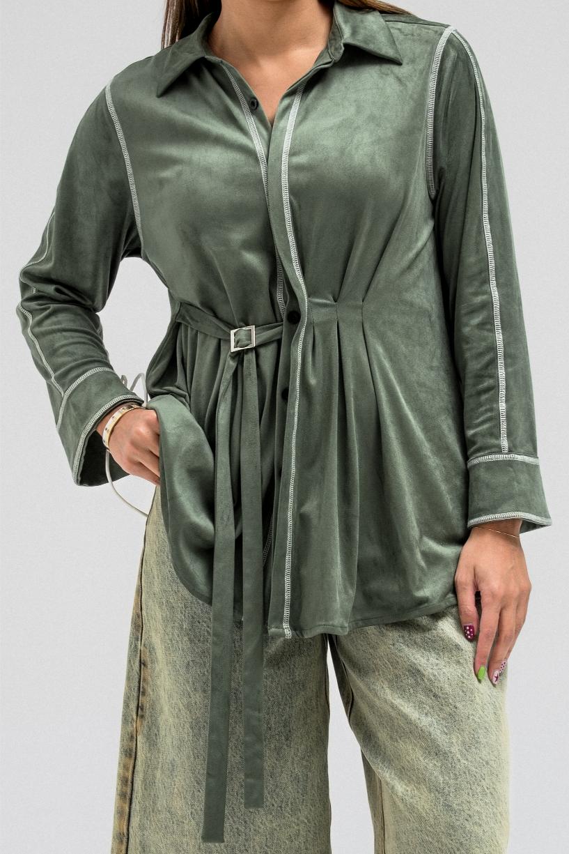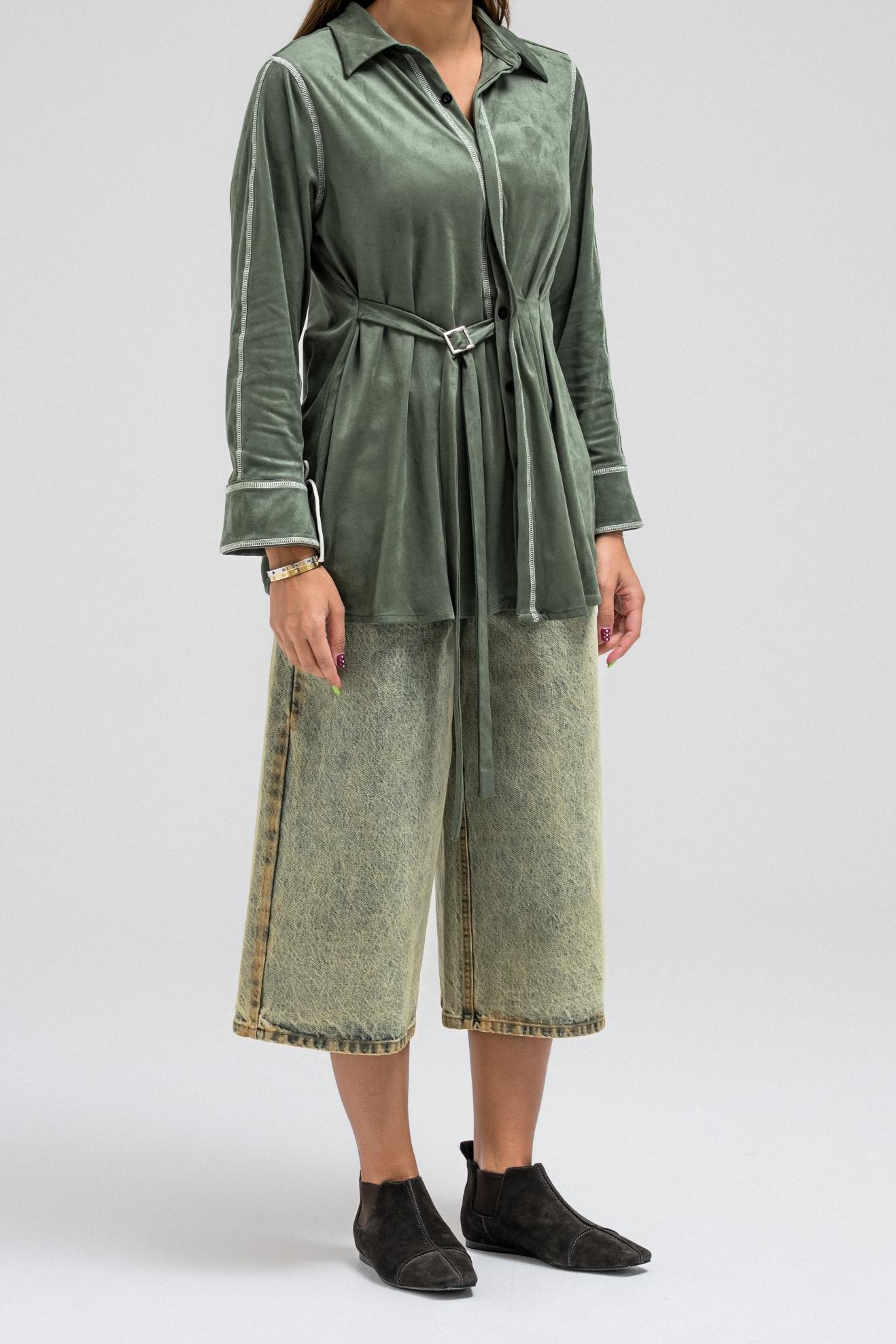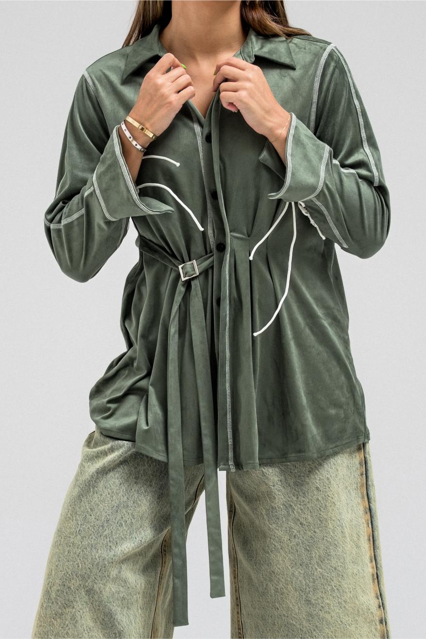 صُنع هذا القميص من جلد سويدي ناعم وخفيف الوزن، وياقة كلاسيكية وأزرار أمامية للإغلاق. تُضفي تفاصيل طيّات فريدة على الجزء الأمامي لمسةً من الأناقة، بينما تُضفي خطوط الخياطة البيضاء الدقيقة تباينًا أنيقًا. الأكمام مُزينة بأصفاد مربوطة، وحزام مُلحق يُتيح تحديد الخصر للحصول على قوام أكثر تحديدًا.