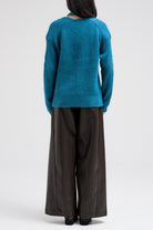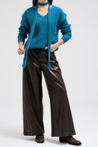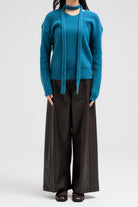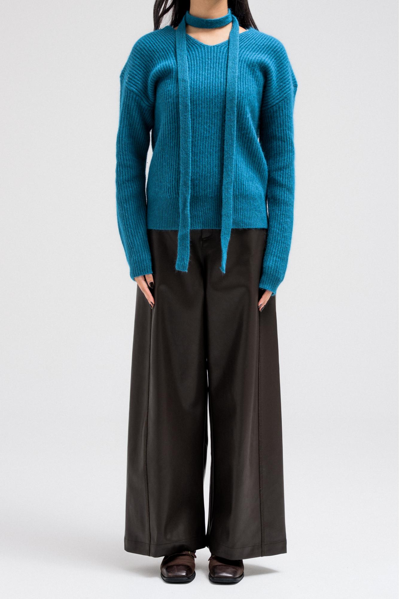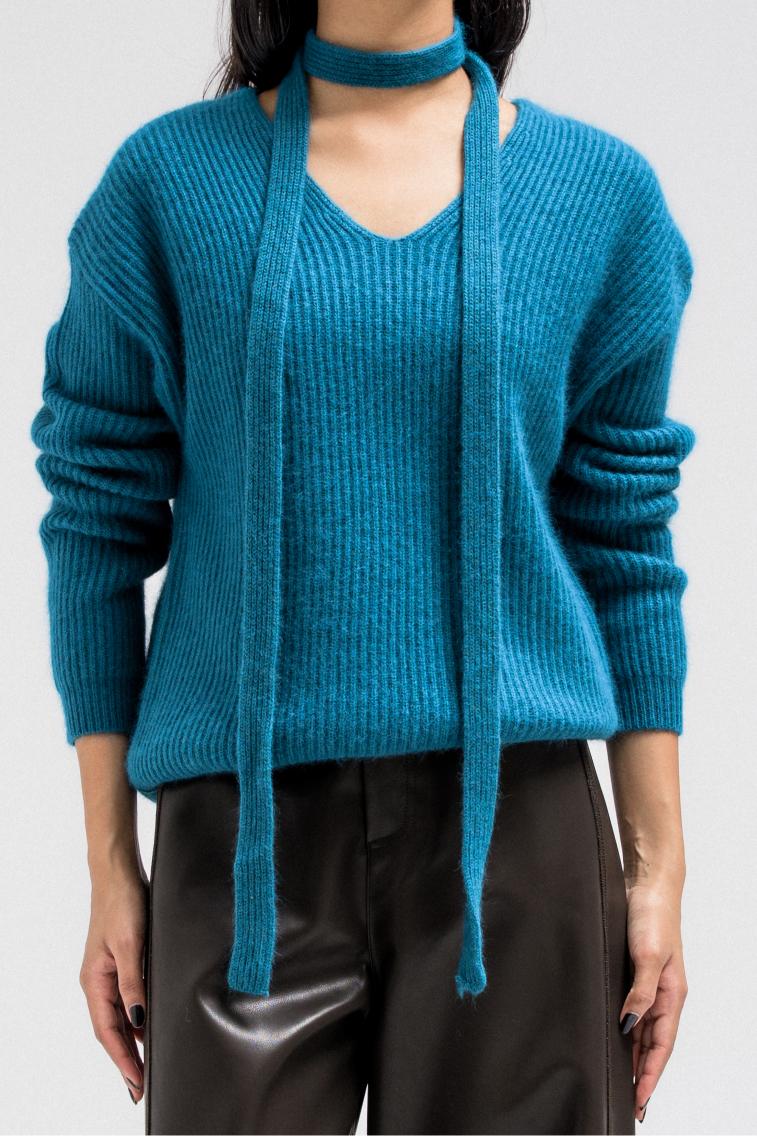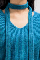 A cozy knit sweater featuring a classic V-neckline and a soft ribbed texture. It comes with a matching long, thin scarf that can be styled in multiple ways: worn loosely, wrapped around the neck, or removed completely for a simpler look. A versatile knit perfect for elevating any outfit.