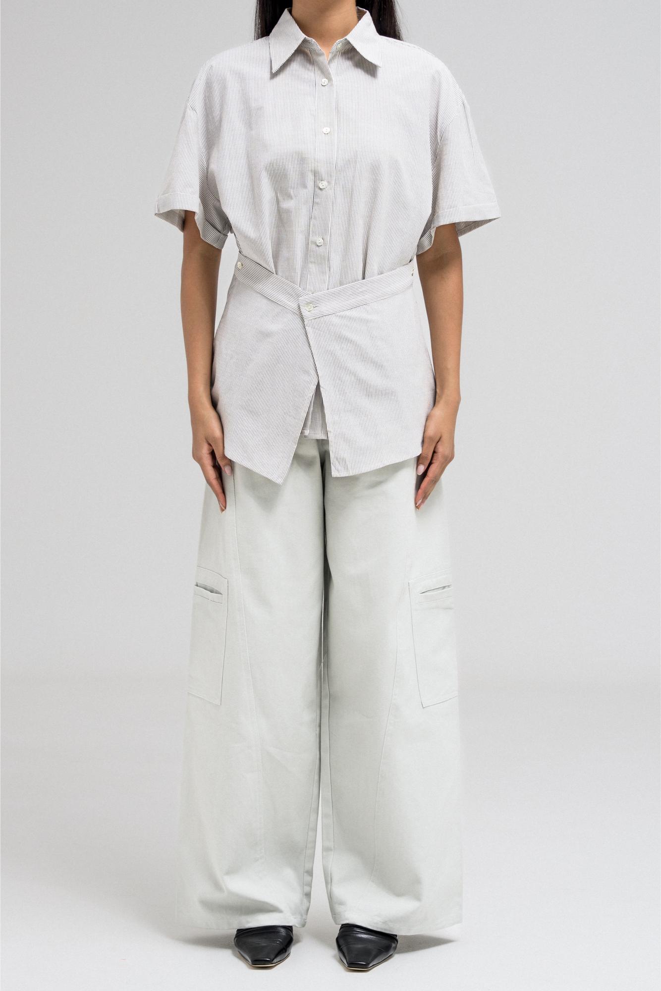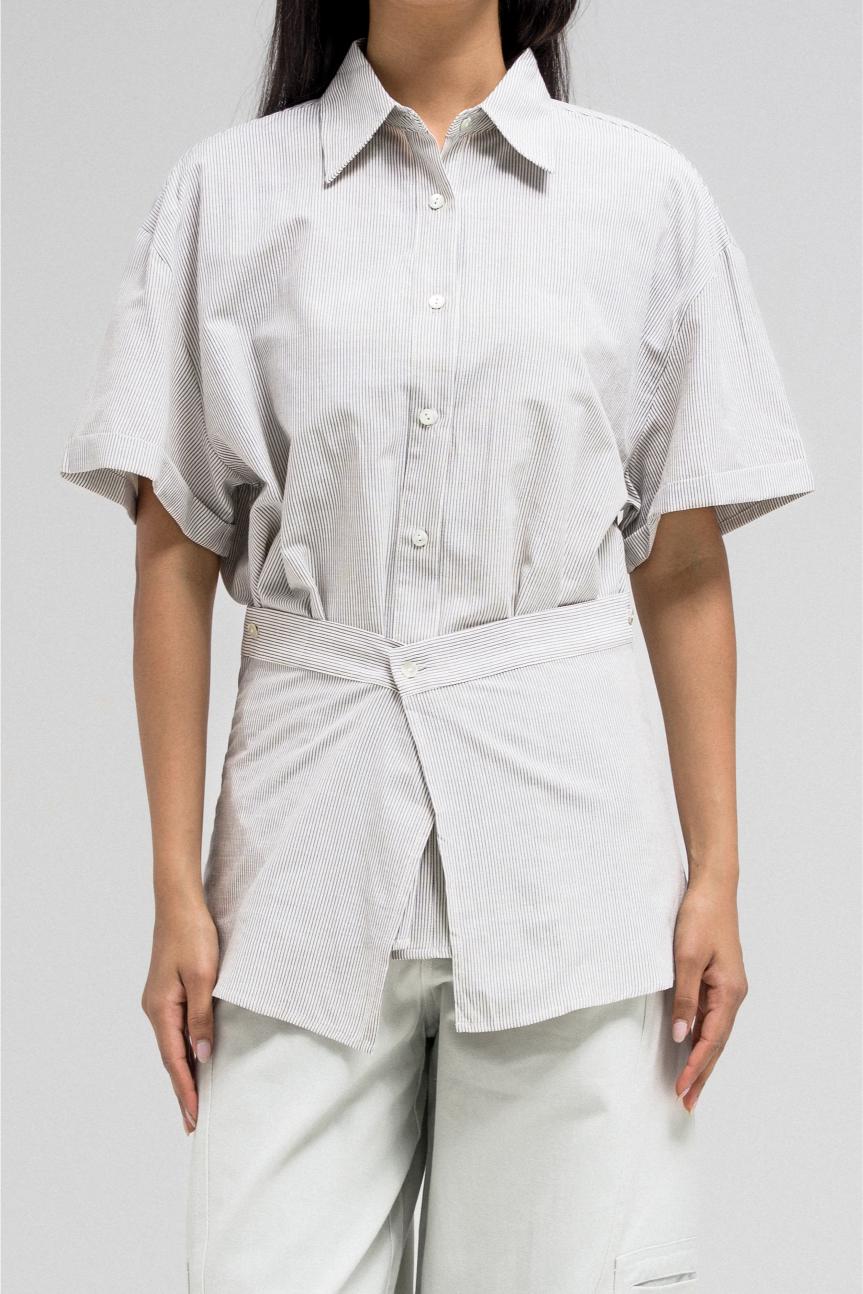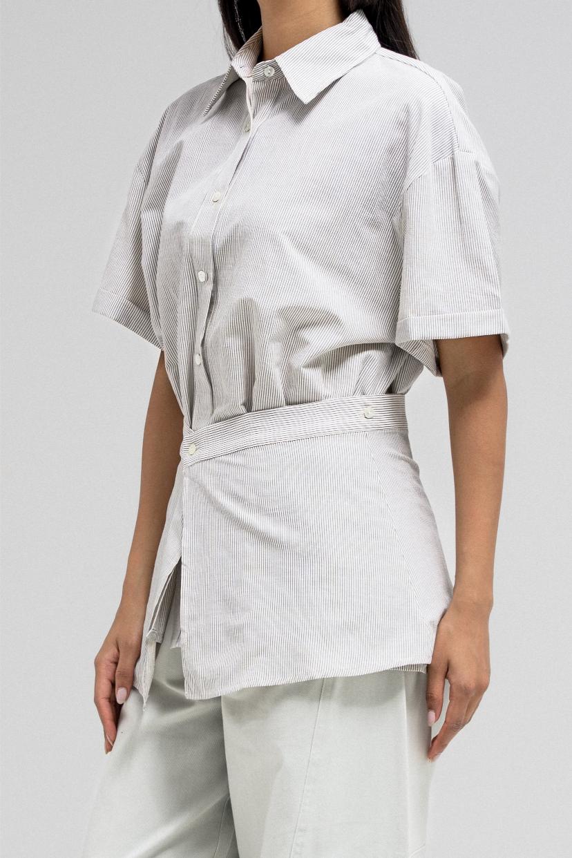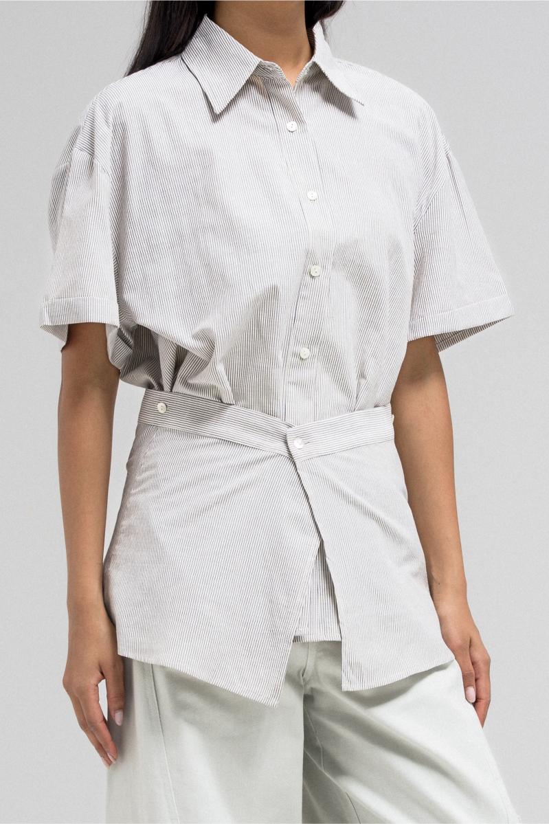قميص مُهيكل بأكمام قصيرة، بياقة كلاسيكية وأزرار أمامية للإغلاق. يأتي مع حزام ملفوف قابل للفصل، مصنوع من نفس قماش القميص المُخطط. يُمكن تثبيت الحزام على القميص لإطلالة أنيقة.