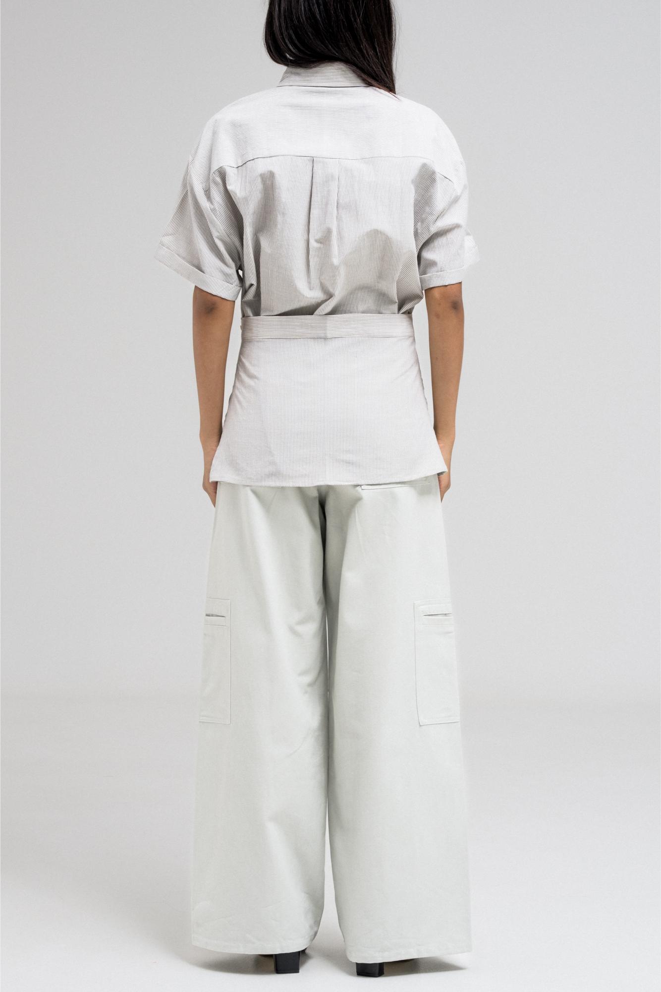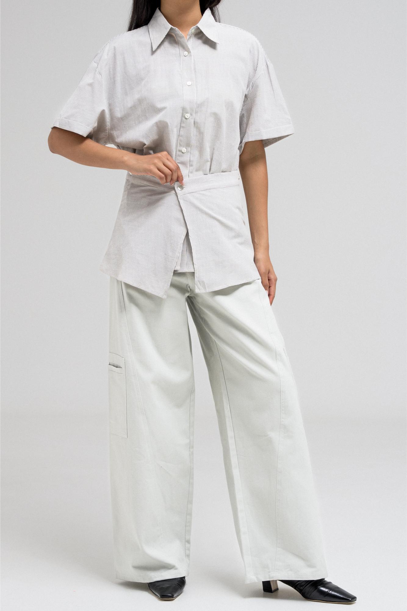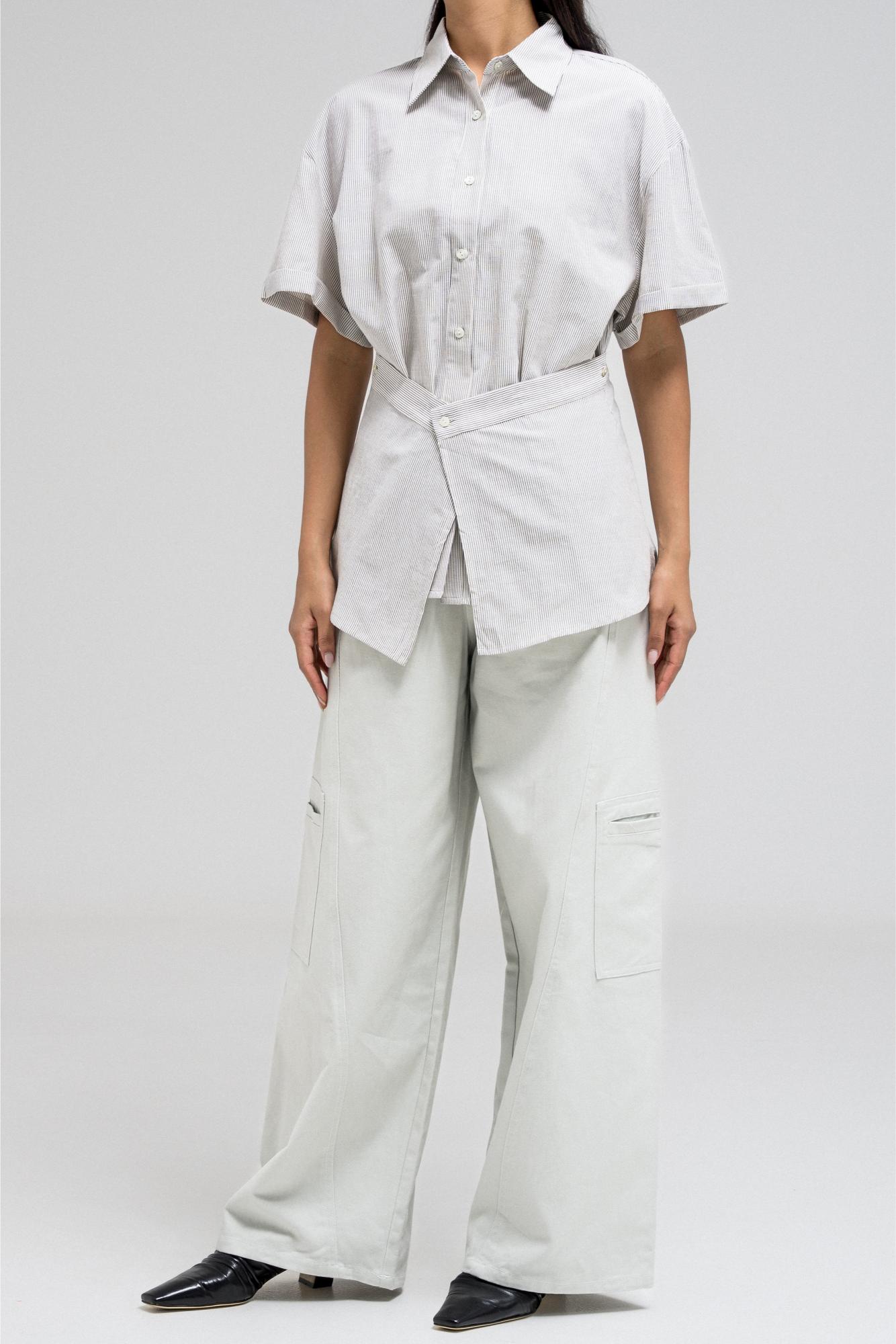قميص مُهيكل بأكمام قصيرة، بياقة كلاسيكية وأزرار أمامية للإغلاق. يأتي مع حزام ملفوف قابل للفصل، مصنوع من نفس قماش القميص المُخطط. يُمكن تثبيت الحزام على القميص لإطلالة أنيقة.