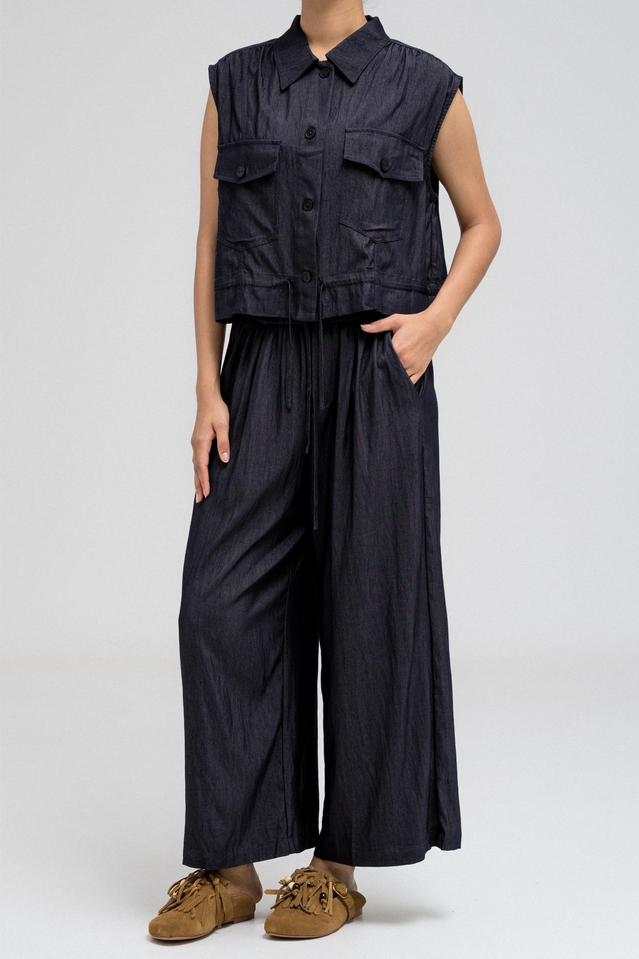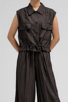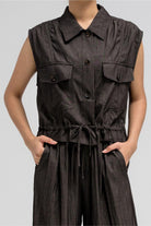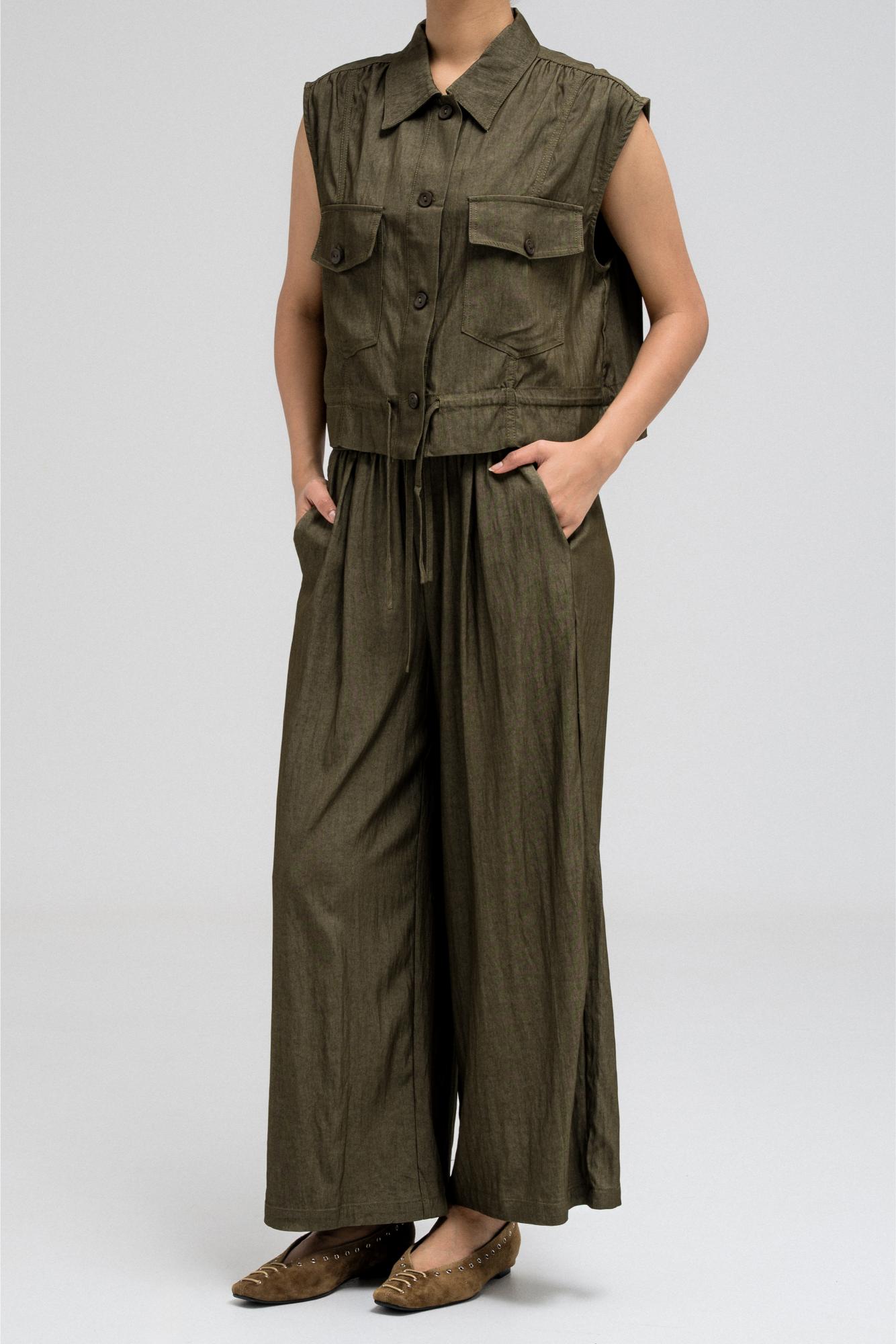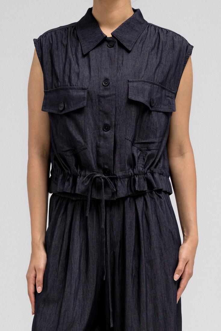 بلوزة عملية بدون أكمام، تتميز بياقة قميص أنيقة وأزرار أمامية للإغلاق. تحتوي على جيبين على الصدر بغطاء وأزرار للإغلاق، مما يضفي عليها لمسةً مستوحاة من ملابس الكارجو. يأتي طرفها مزودًا برباط، ما يسمح لكِ بتضييقها وتنسيقها كما يحلو لكِ. مثالية للتنسيق مع البنطال المتناسق لإطلالة متكاملة ومتناسقة.